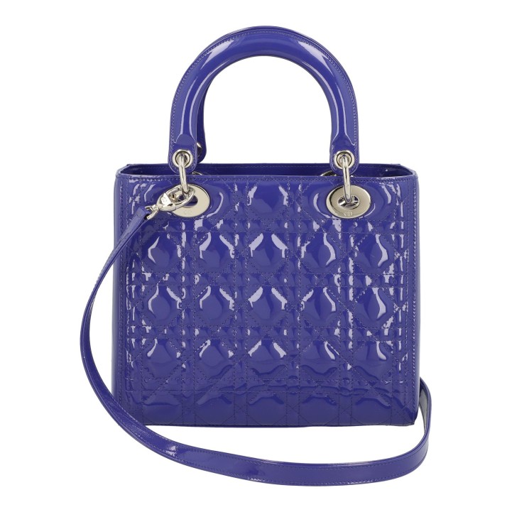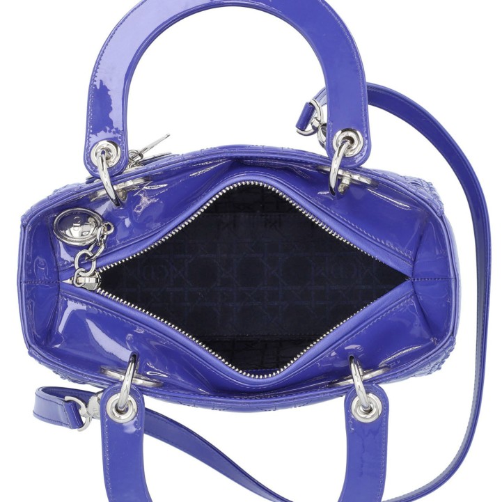 DIOR bag 'LADY DIOR MEDIUM', coll.: 2015, retail price: 5.900,-€. Cannage patent leather in blue with silver-coloured hardware, double handles, logo tag, zip closure and removable shoulder strap. Textile interior with one zip pocket. Signs of wear. 24 x 11 x 20 cm.