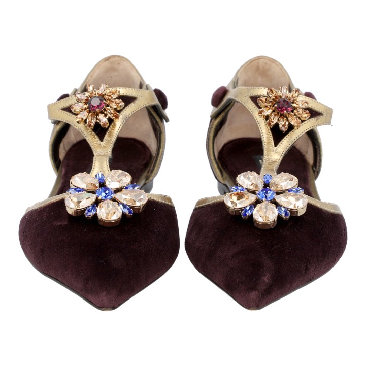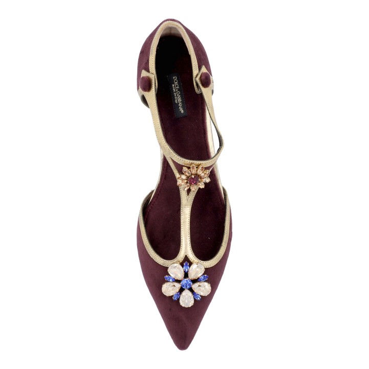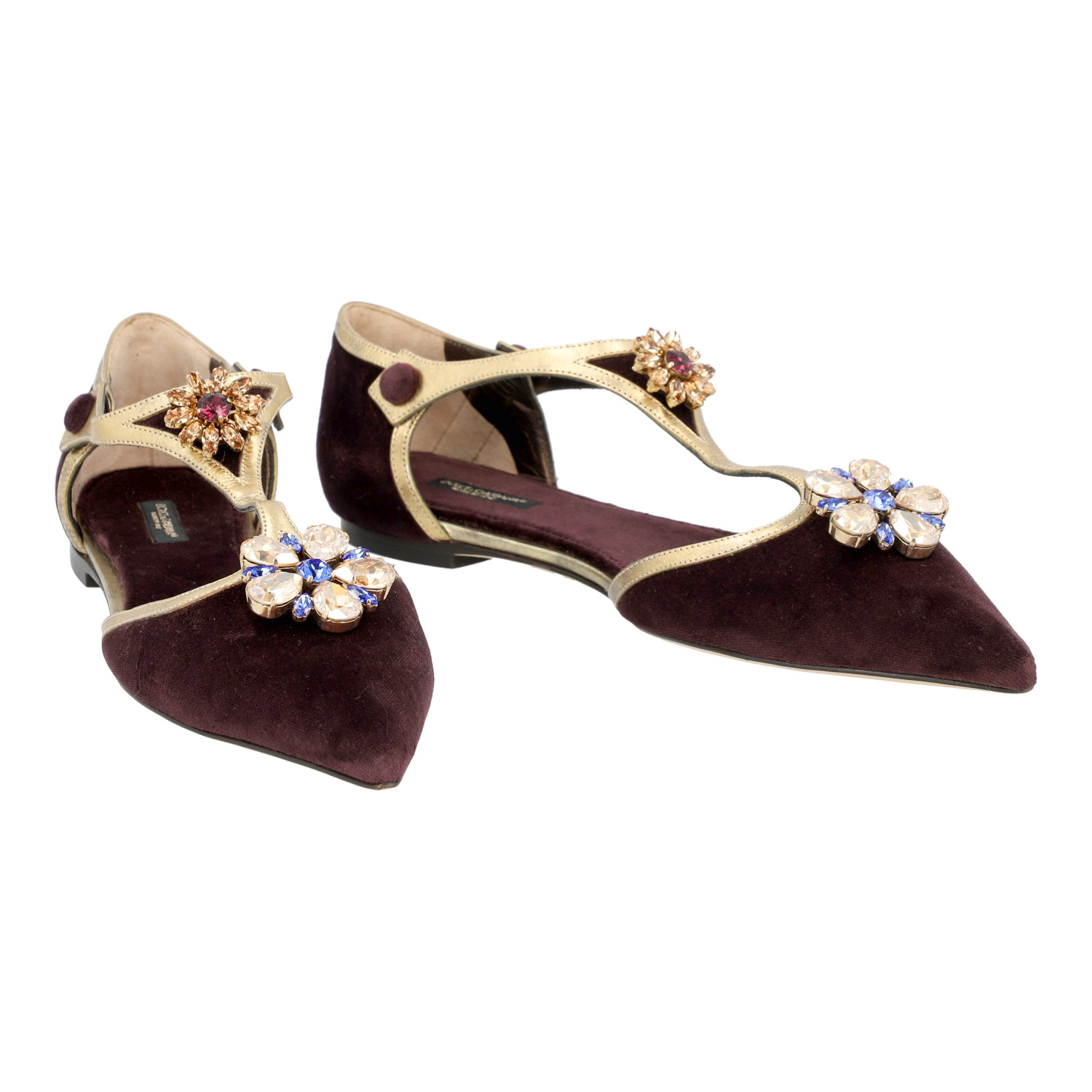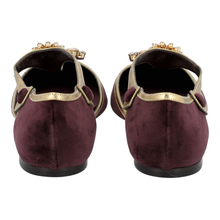 DOLCE & GABBANA ballerina flats, size 40. Bordeaux-coloured velvet with gold-coloured leather details and rhinestone appliqués. Unworn.