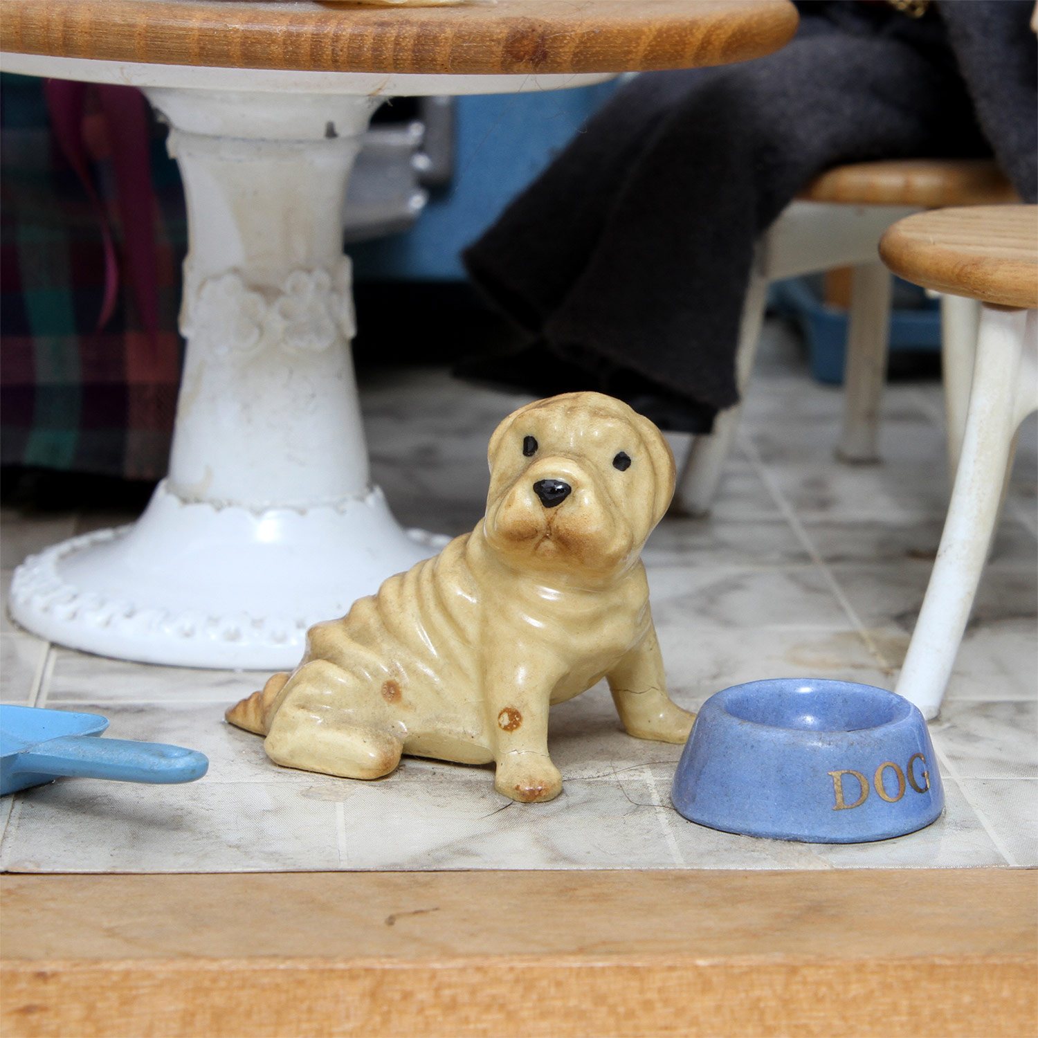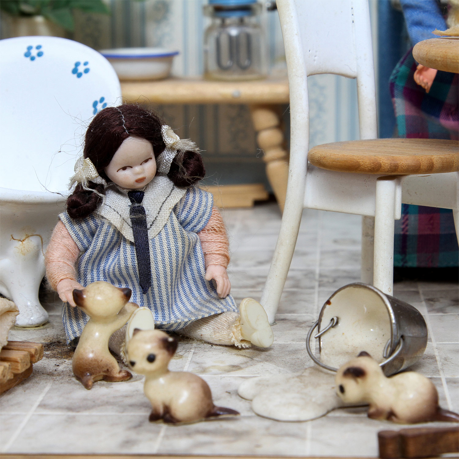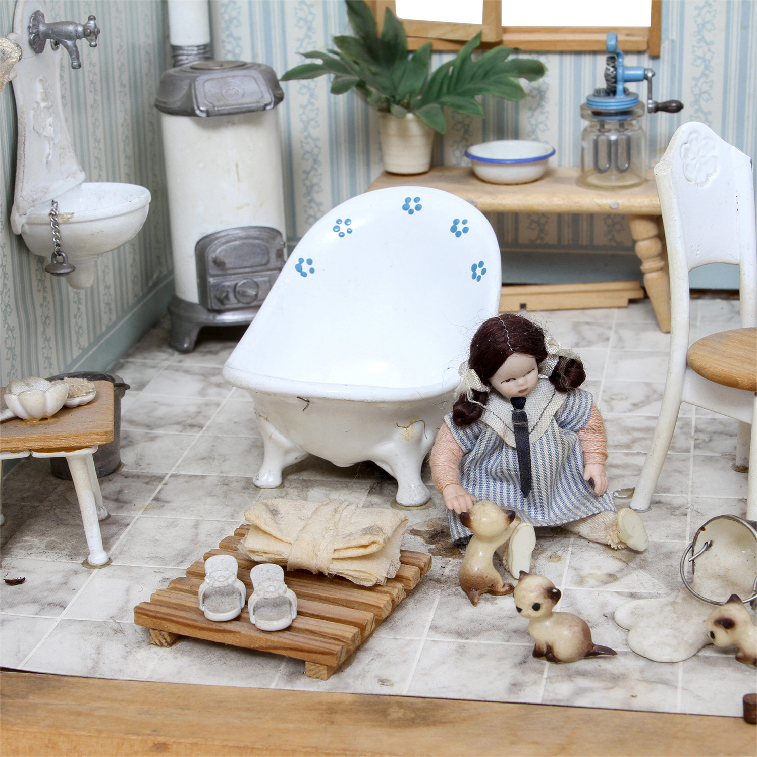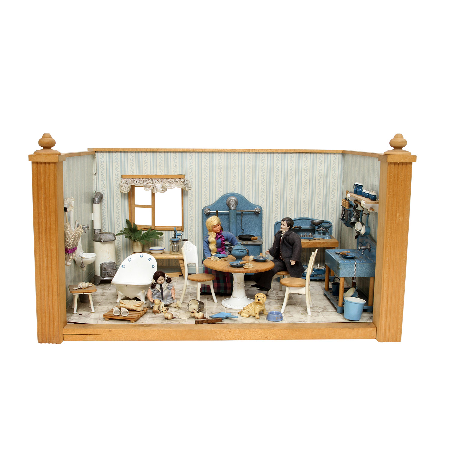 Puppenküche, im Stil der 1930er/40er Jahre, 2.H. 20.Jh., rechteckiges Holzgehäuse m. Tapete an Wänden u. Fußboden, 1 Zimmer m. Sprossenfenster, umfangreiches Inventar, meist fixiert. 1 Fensterflügel fehlt, part. Klebereste, LxB ca. 45x29,5 cm.
