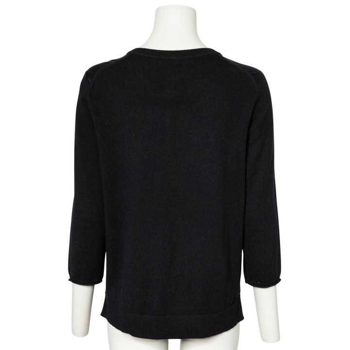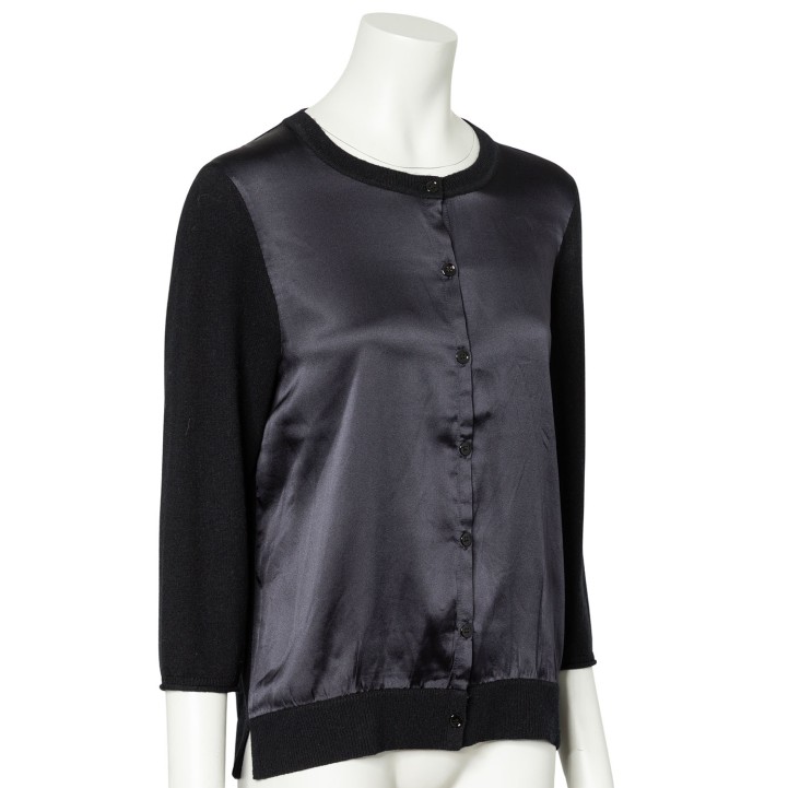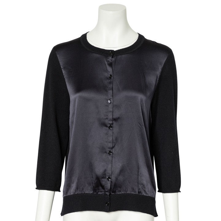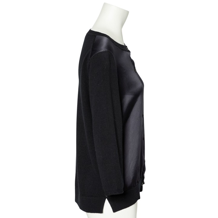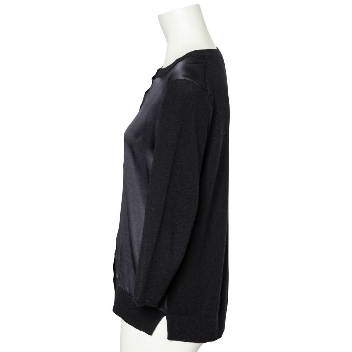 DOROTHEE SCHUMACHER Cardigan, size 5. 70% virgin wool, 30% cashmere in black with silk blend insert in black. Simple design with button placket. Good condition.