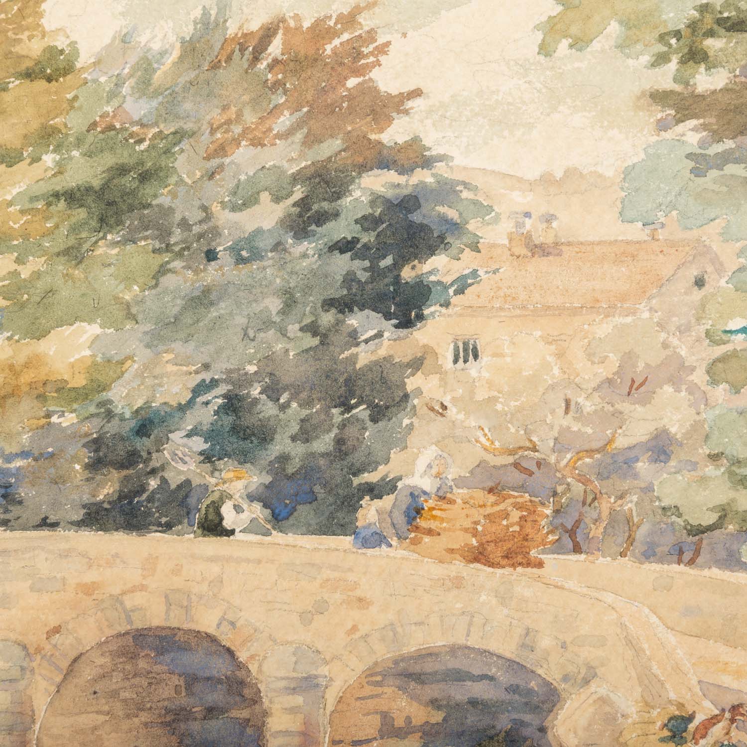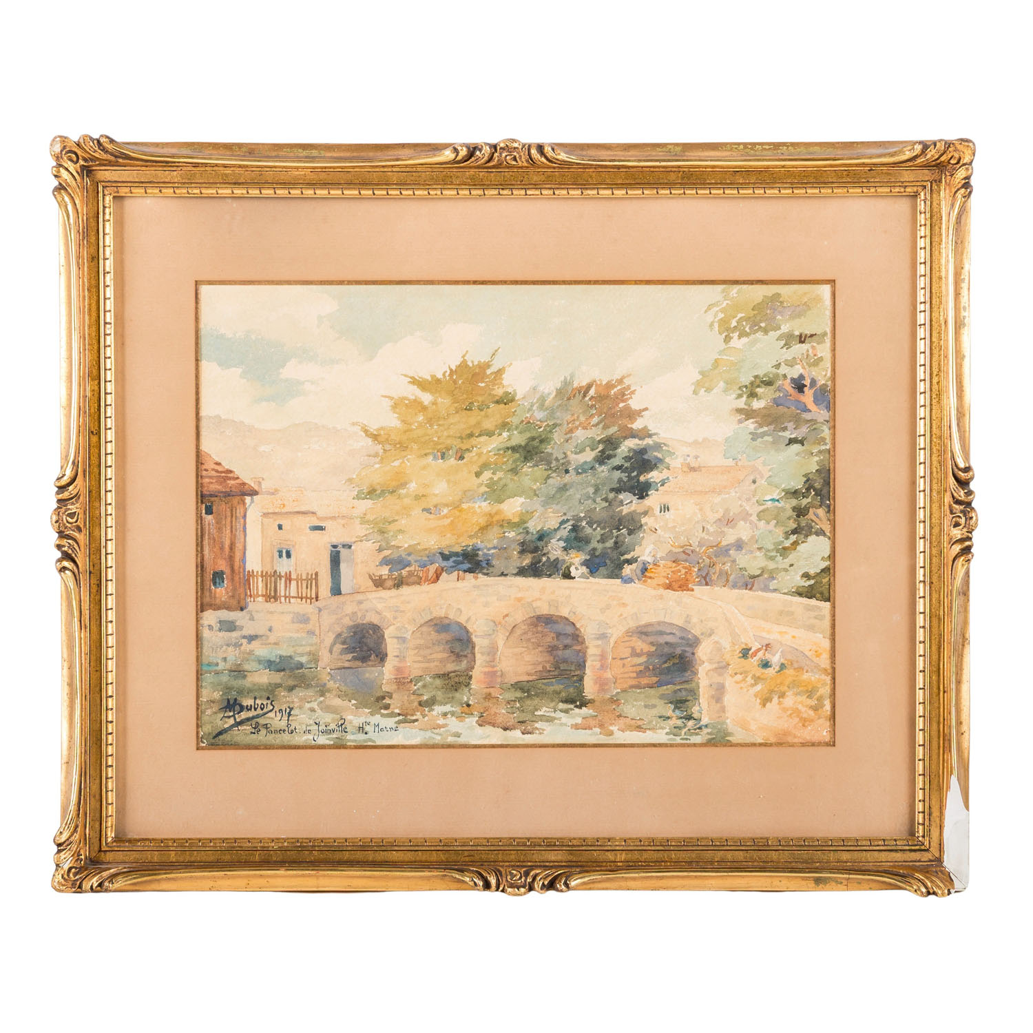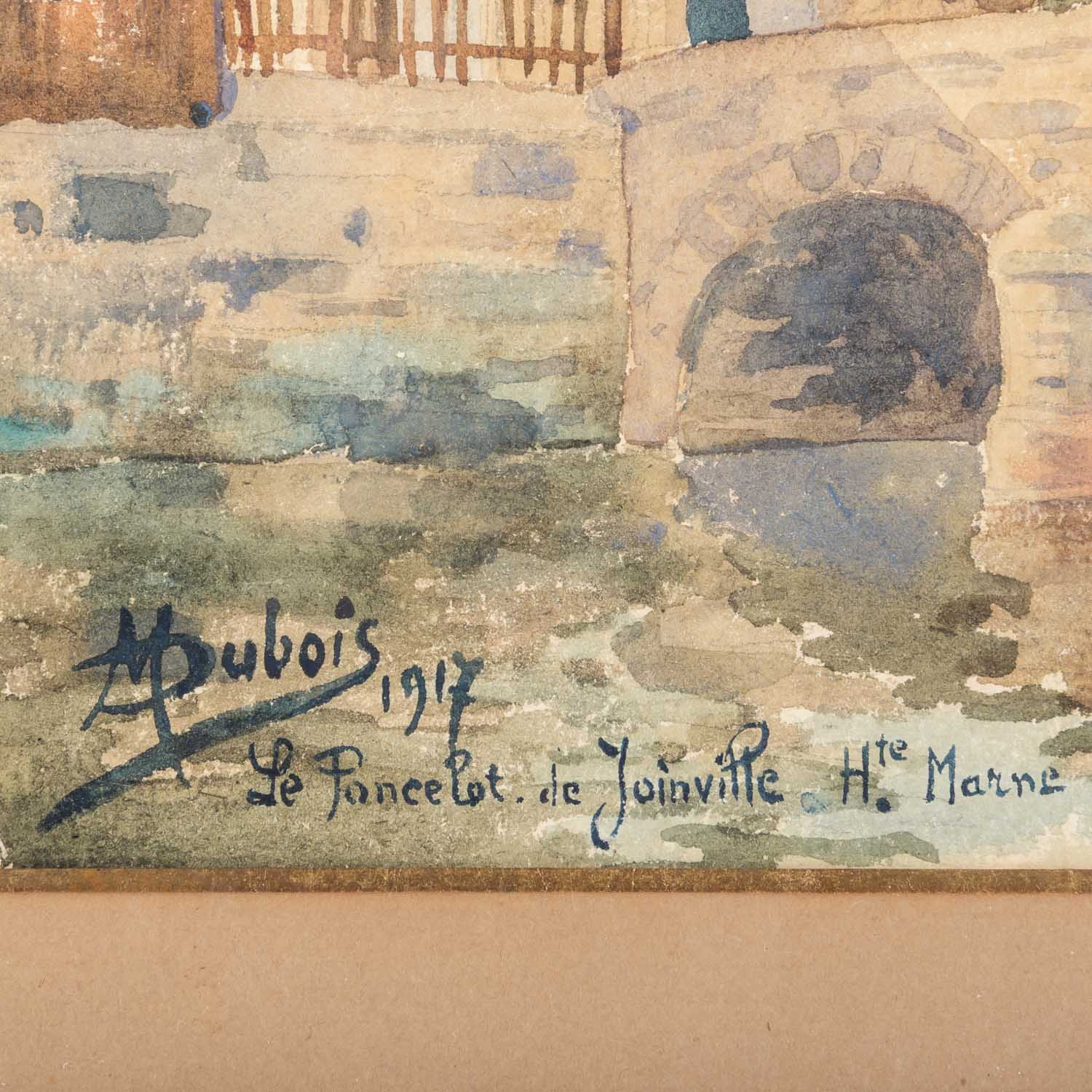DUBOIS, M. (artist 19./20. Jh.), 'Le Pontcelot de Joinville, Haute Marne', 1917, View of the stone arched bridge in front of the village, signed, titled and dated, watercolour, HxW: mat opening approx. 29x38 cm (46x55 cm with frame). Traces of age, browned. Framed behind glass in passepartout (frame edge damaged, missing piece).