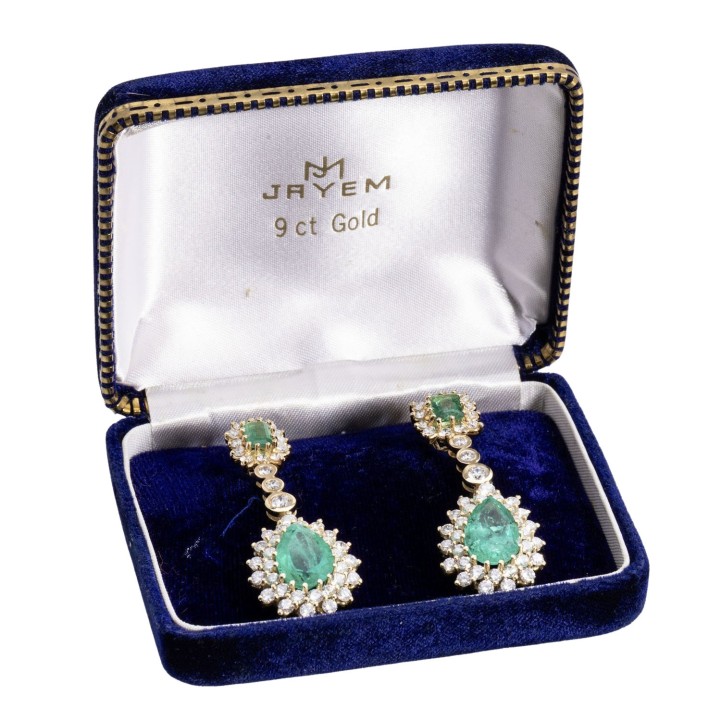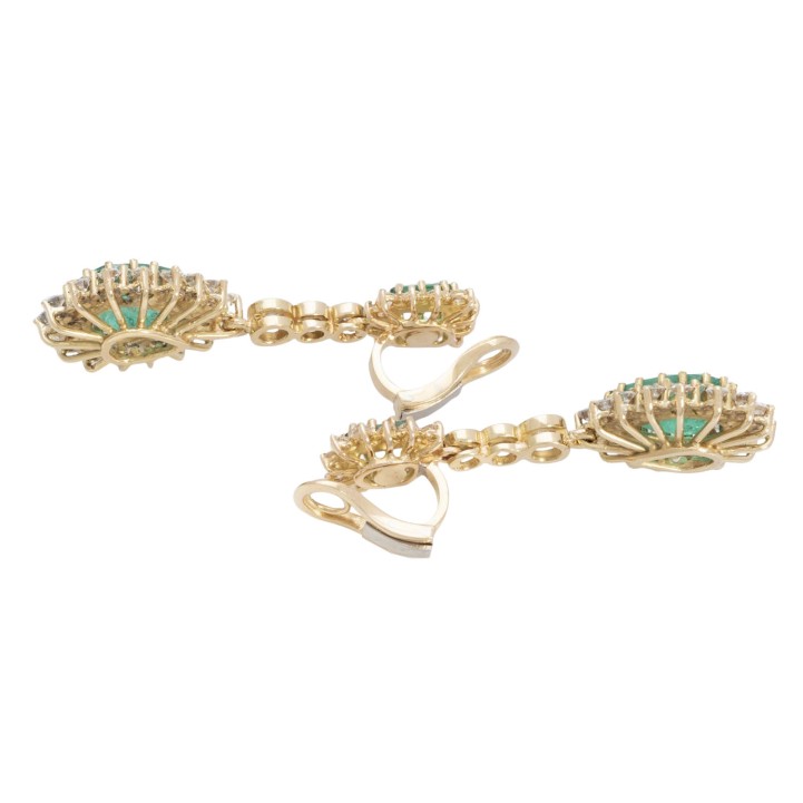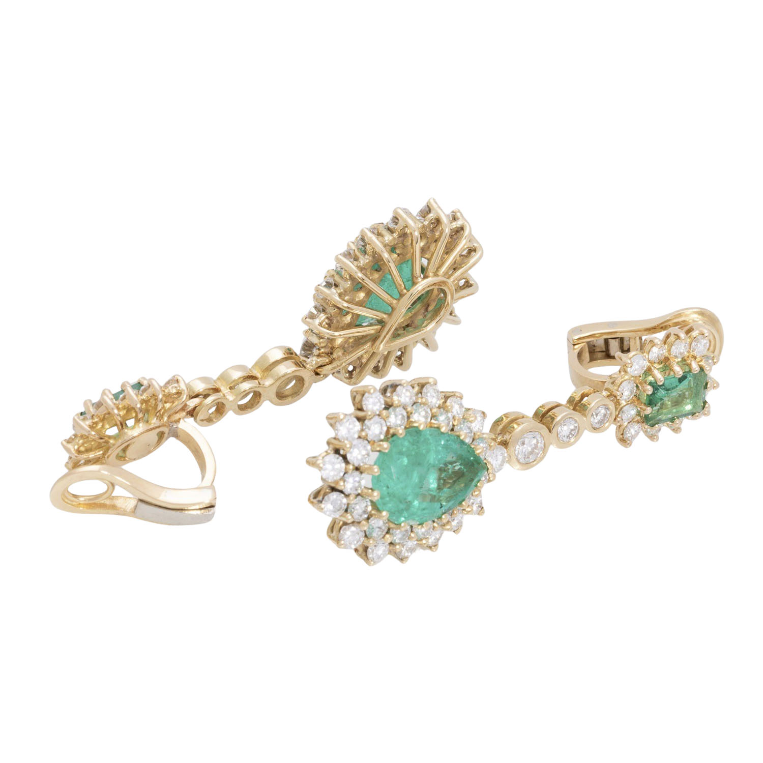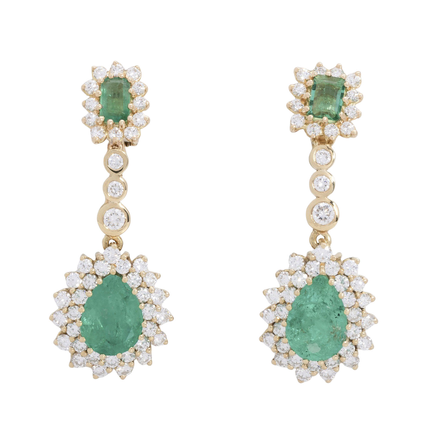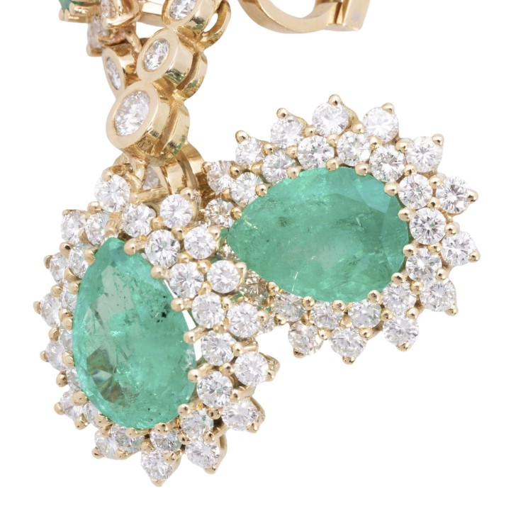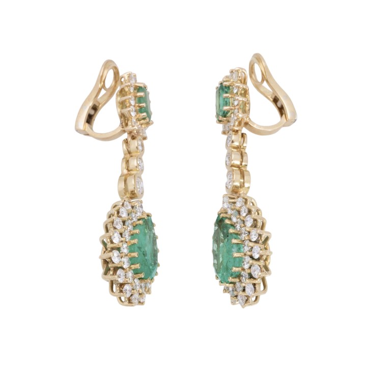 Earclip-hangers with rectangular and pear-cut emeralds totalling ca. 9.2 ct, slight different colours and signs of natural growth and brilliant-cut diamonds totalling ca. 4.2 ct, ca. WHITE (H)/SI, 17.2K yellow gold, 22.2 g, L: 4.7 cm, 2nd half of 20th century, minor signs of wear.
