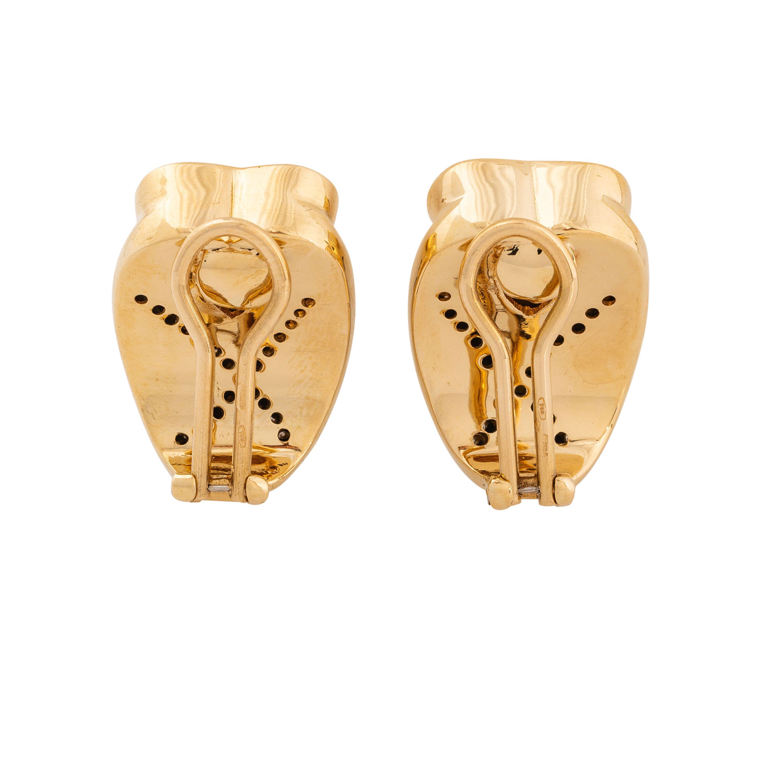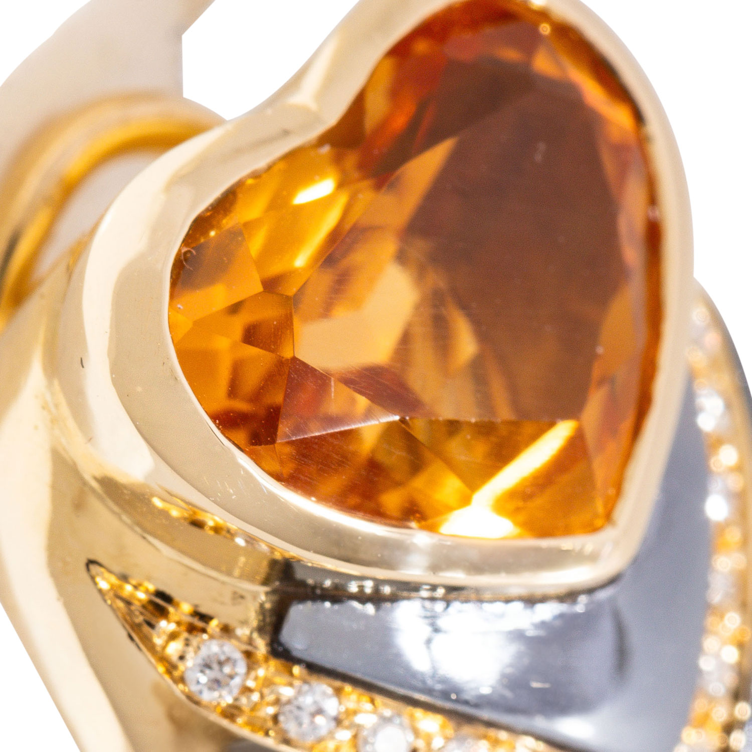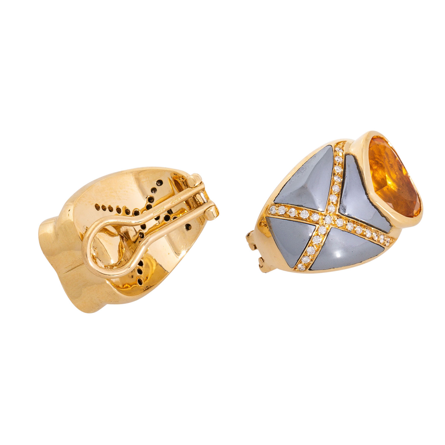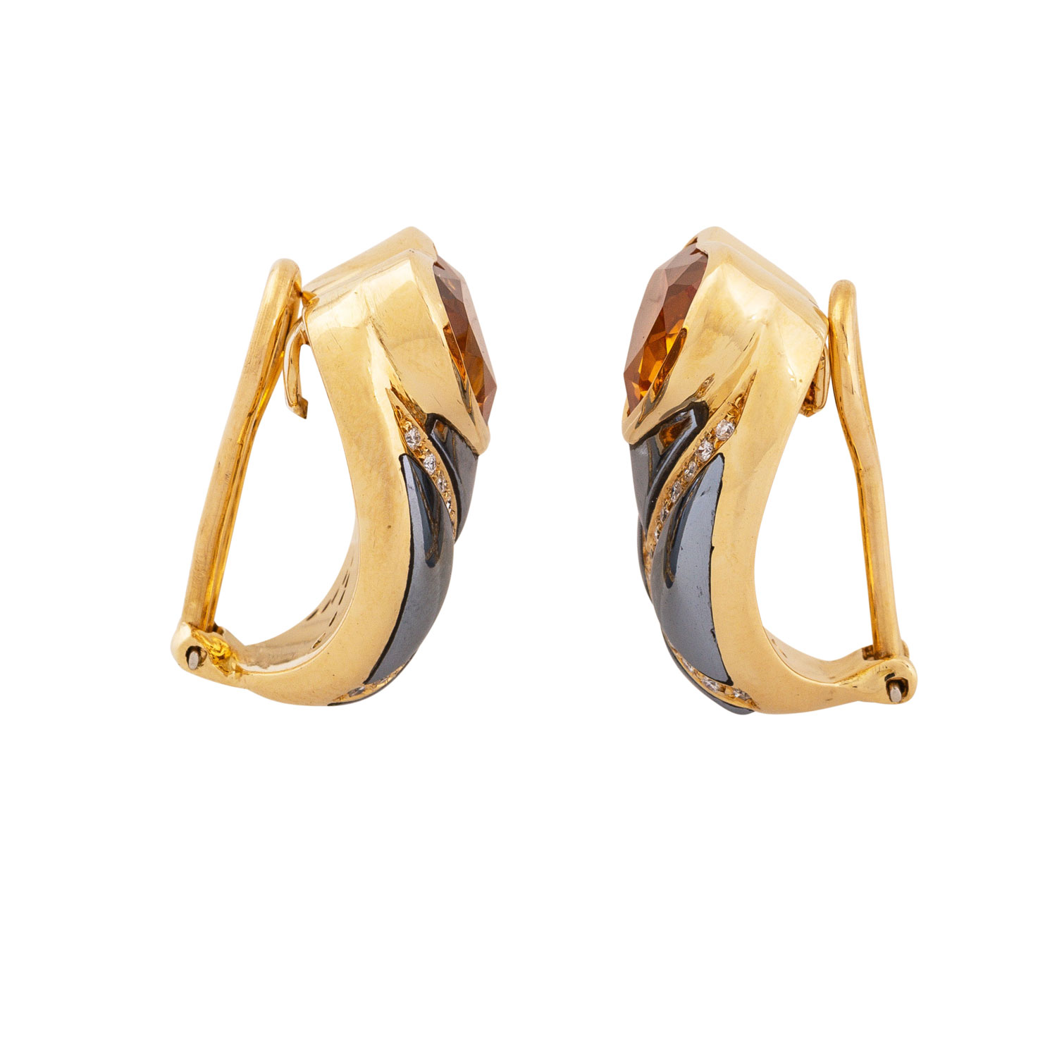Earclips with hear-cut faceted citines, hematite inlays and brilliant-cut diamonds totalling ca. 0.25 ct, good colour and clarity, 18K yellow gold, 21.8 g, late 20th century, good condition, high quality workmanship.