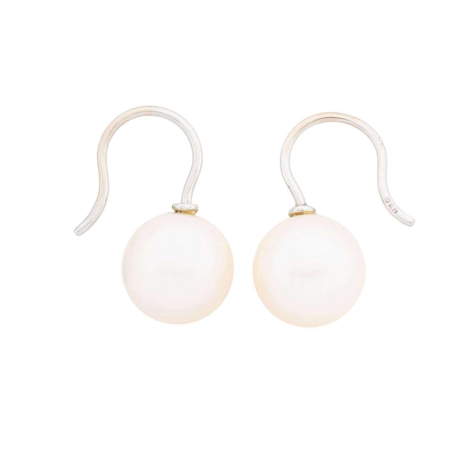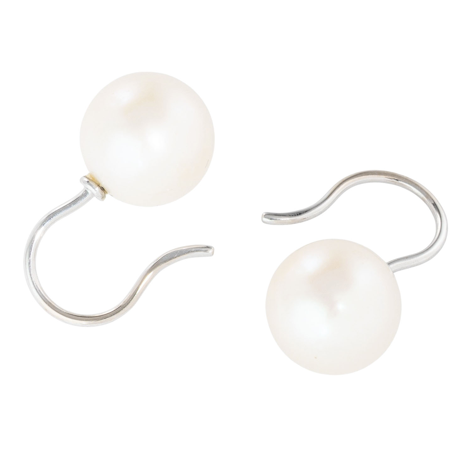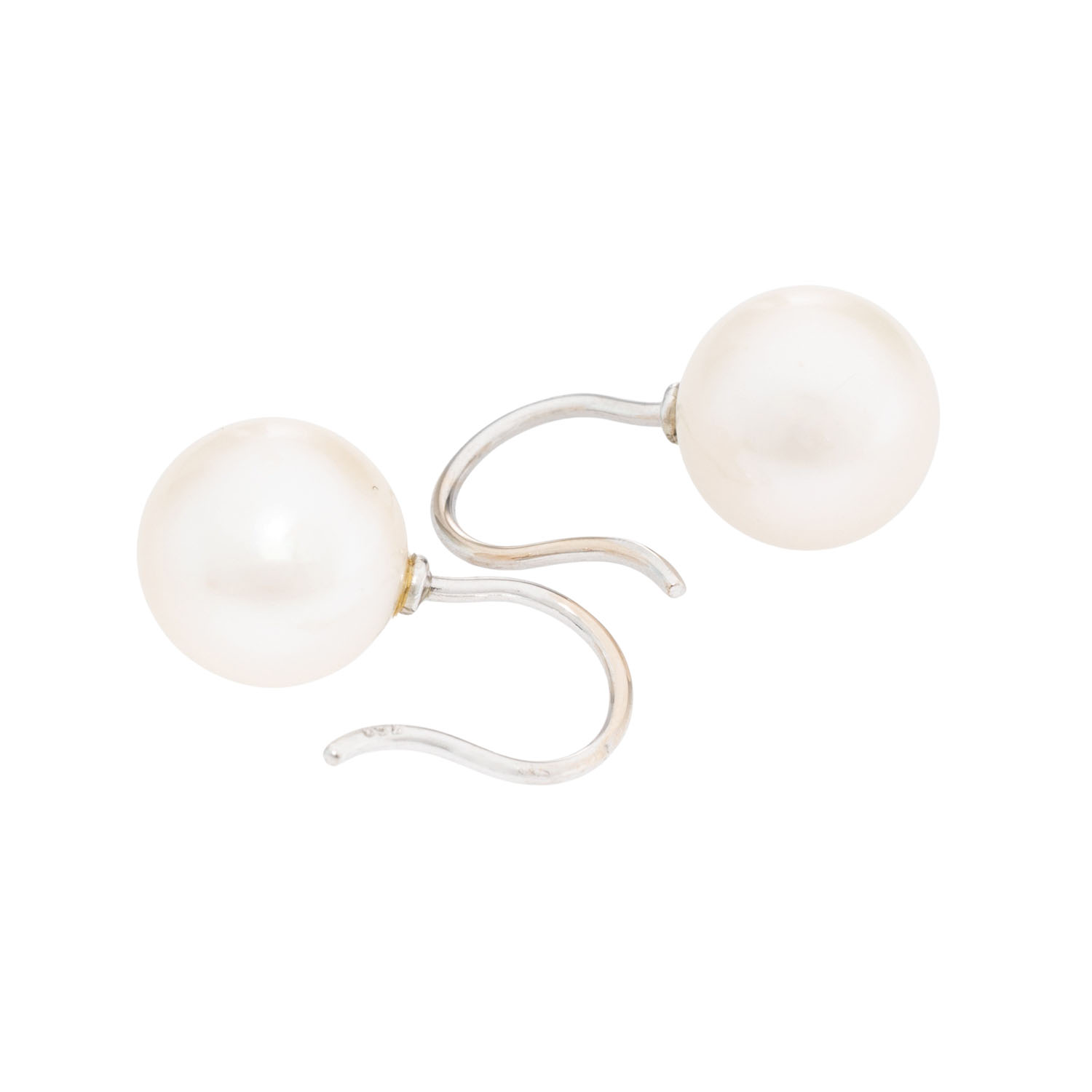 Earrings with 2 freshwater cultured pearls, white-cream, D: approx. 10.6 mm, beautiful luster, 18K white gold, 4.1 g, L: approx. 20.4 mm, W: approx. 0.9 - 10.6 mm, 20./21. century, minimal signs of wear.