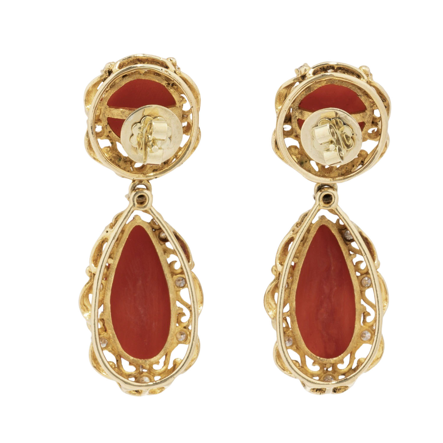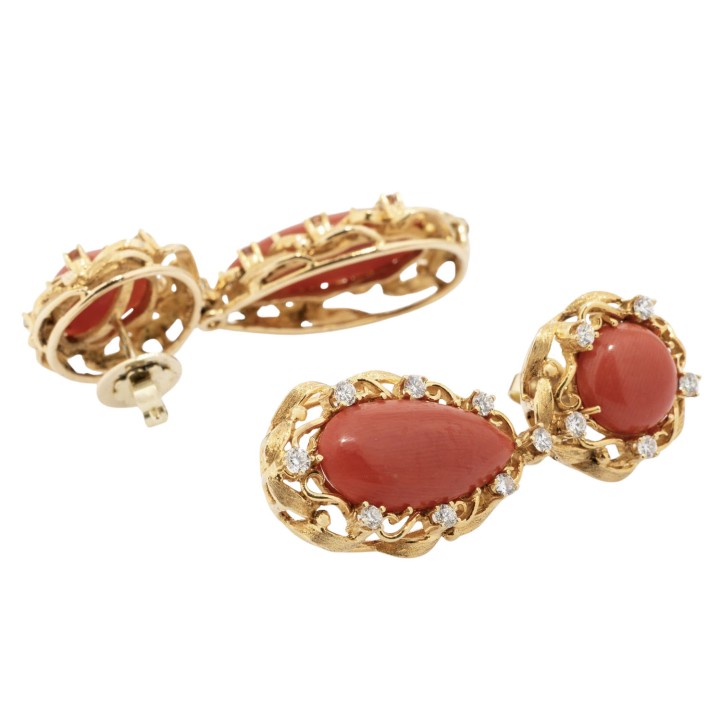 Earrings with 1 round and 1 hanging drop-shaped coral cabochon each, floral frames set with brilliant-cut diamonds totalling ca. 1.5 ct, good colour and clarity, 18K yellow gold, pins and back studs of 14K, 24.1 g, L: 5 cm, 2nd half of 20th century, signs of wear, NO SHIPPING OUTSIDE THE EU!