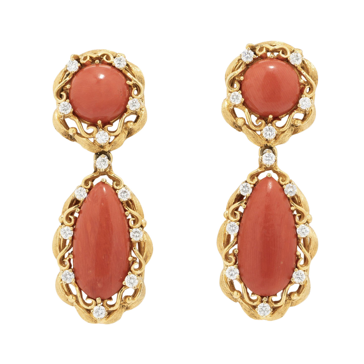 Earrings with corals and diamonds totaling ca. 1.5 ct,
