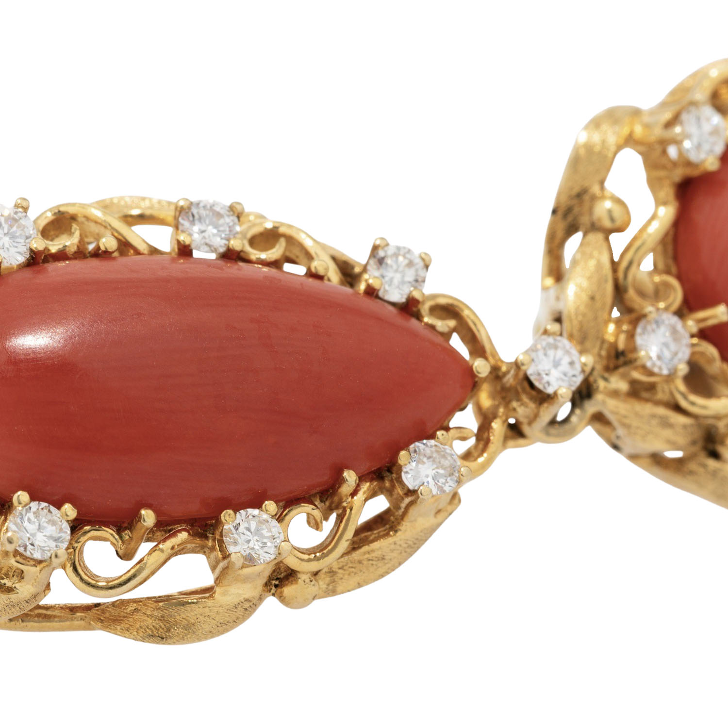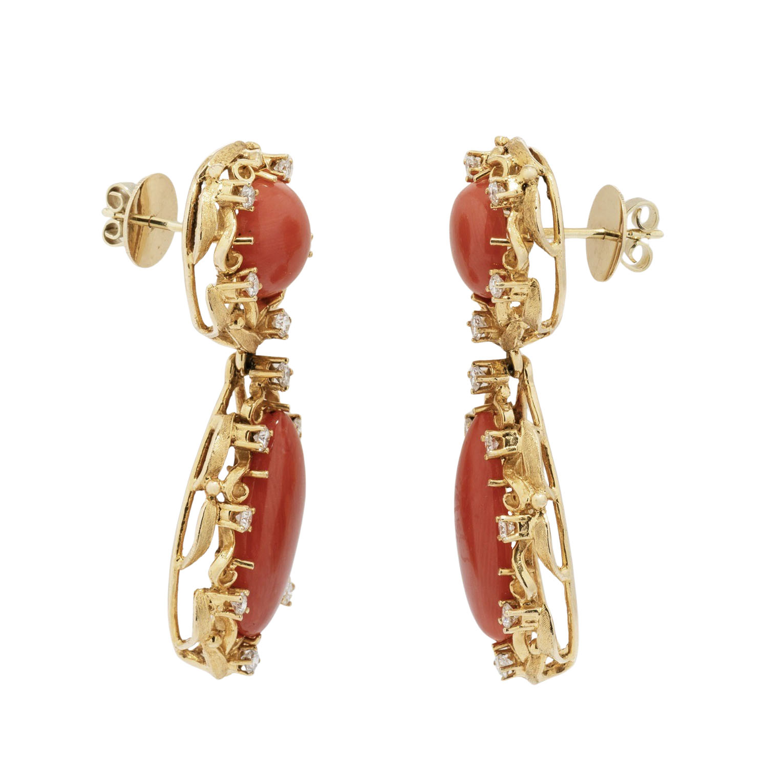Long drop earrings with coral and diamonds totaling ca. 0.2 ct,