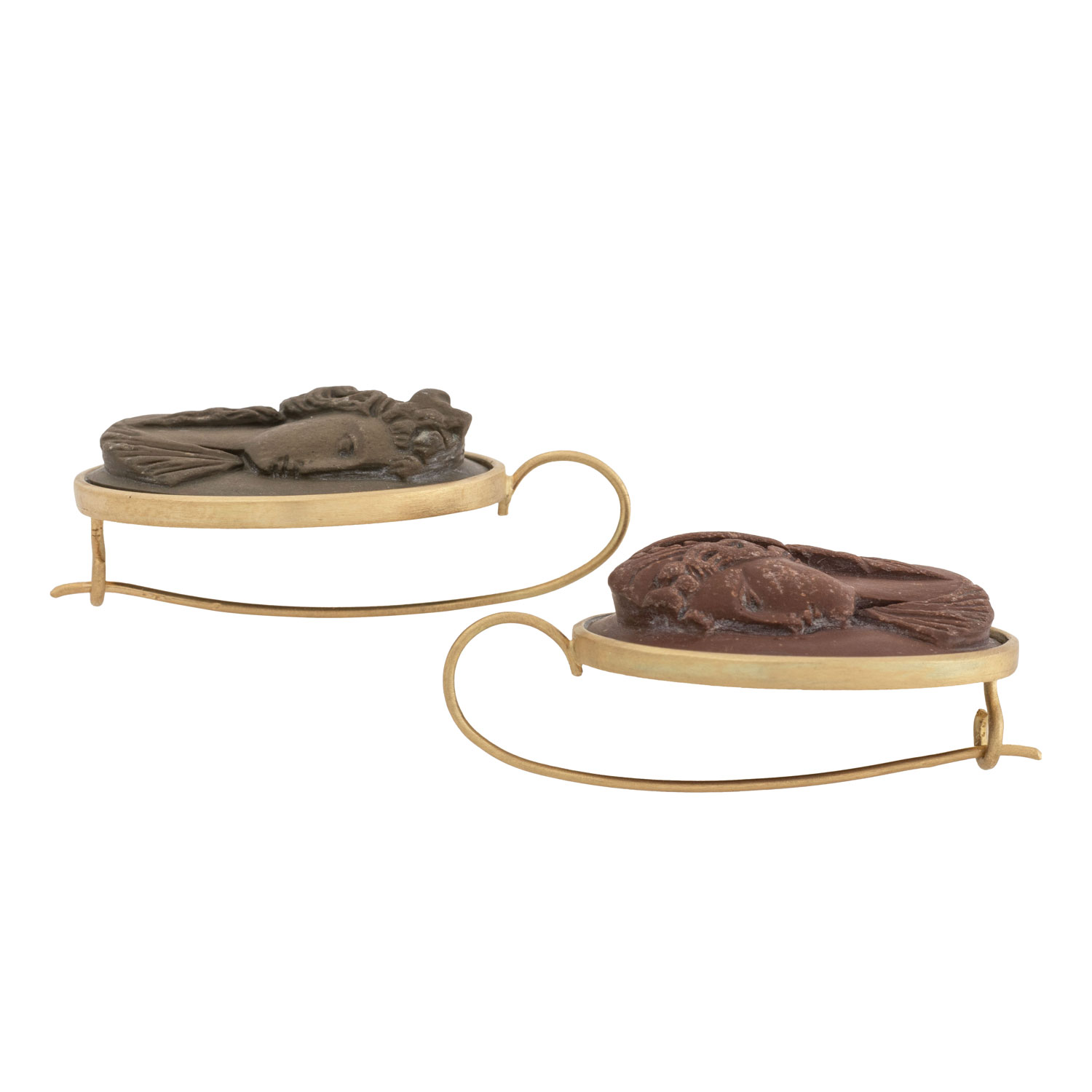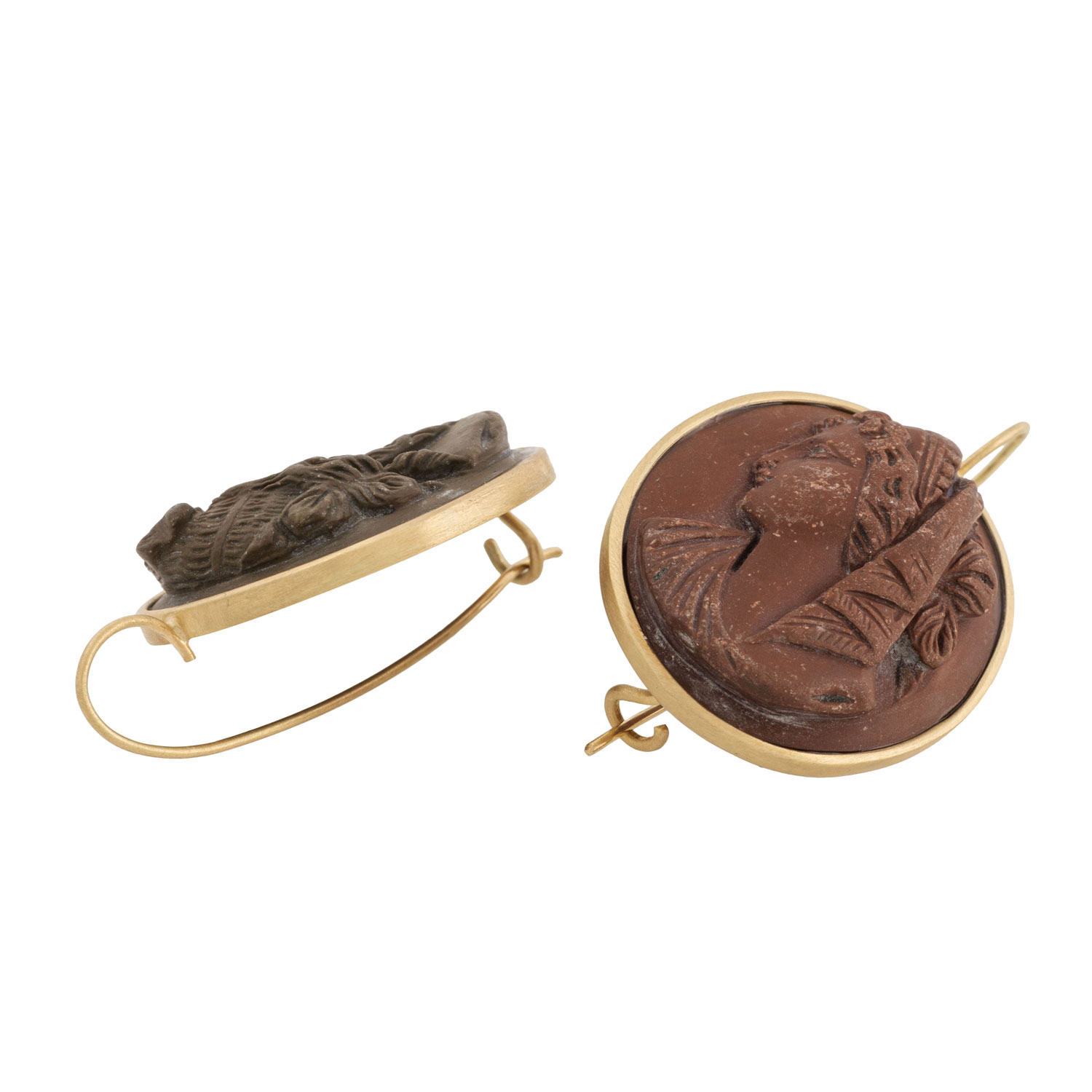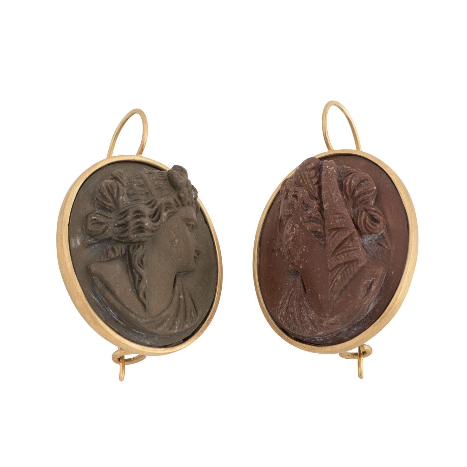 Earrings with lava cameos 'Face to face' in different colour shades, 14K yellow gold, 18.5 g, 3.7x2.6 cm, 21st century, new, signs of glue and work.