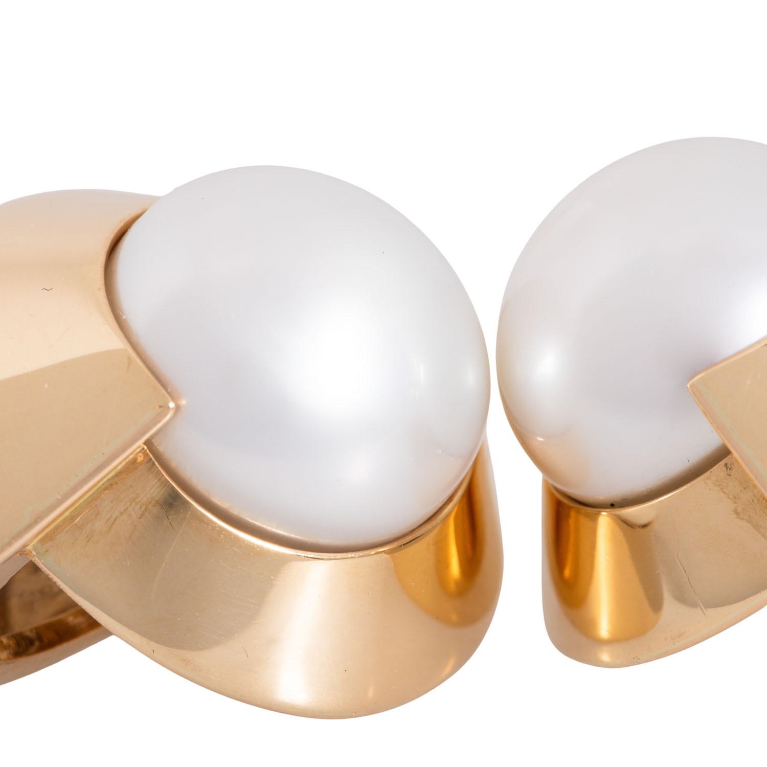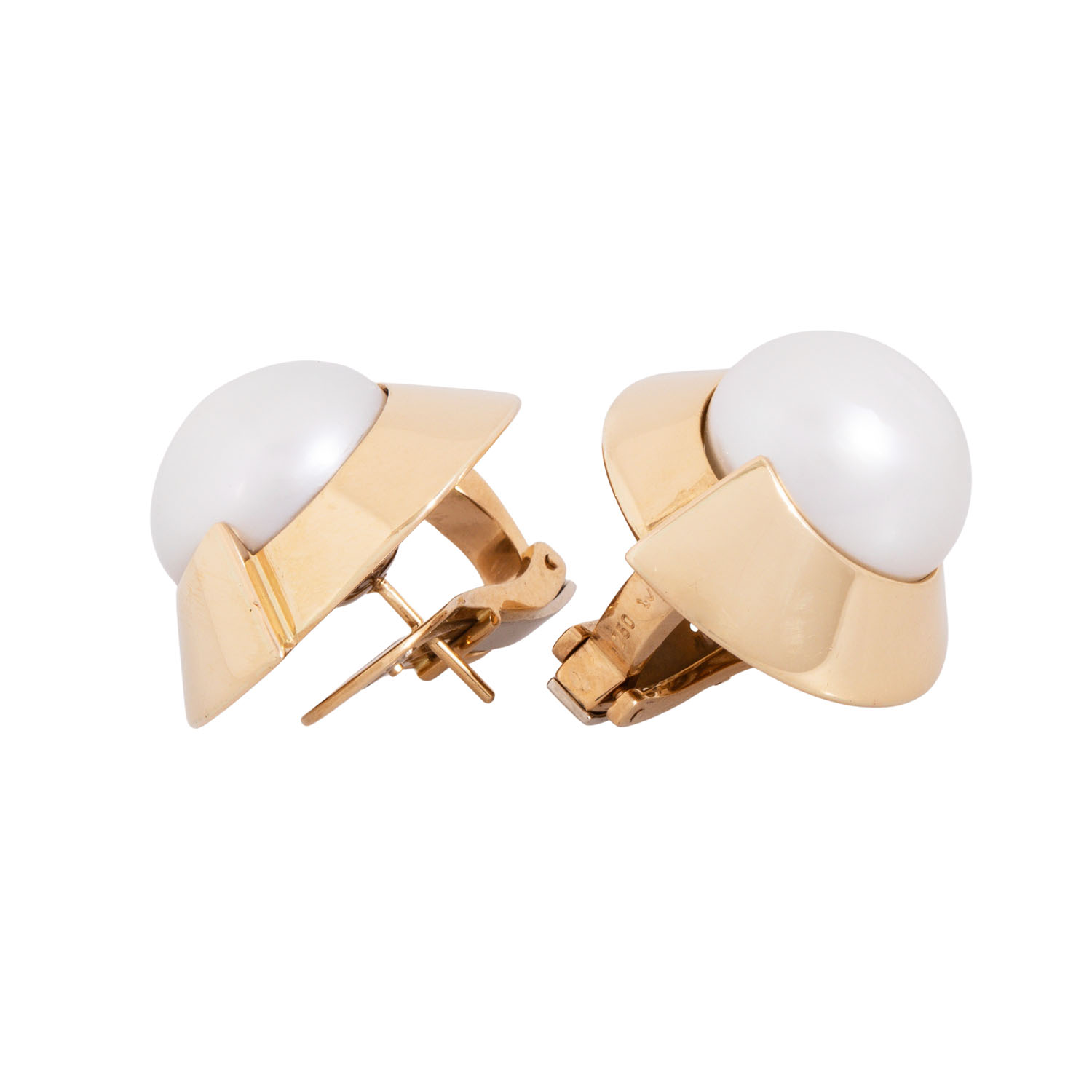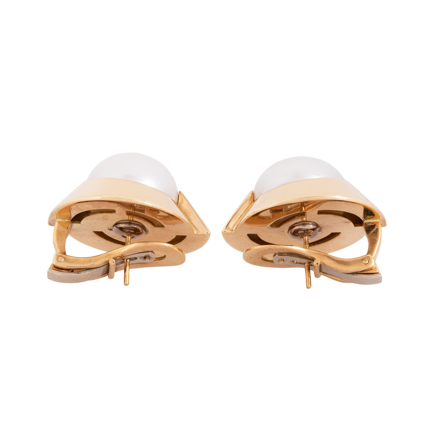 Earrings with South Sea cultured bouton pearls ca. 15.5 mm, of which 1x with small fractures, 18K yellow gold, 29.9 g, D: 2.6 cm, pins with clip-back, late 20th century, minor signs of wear, high quality workmanship.