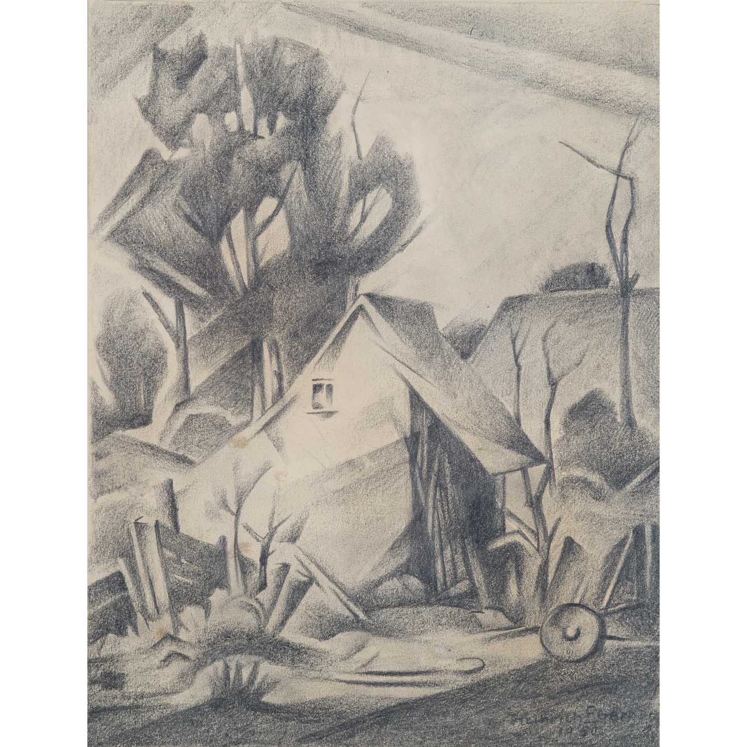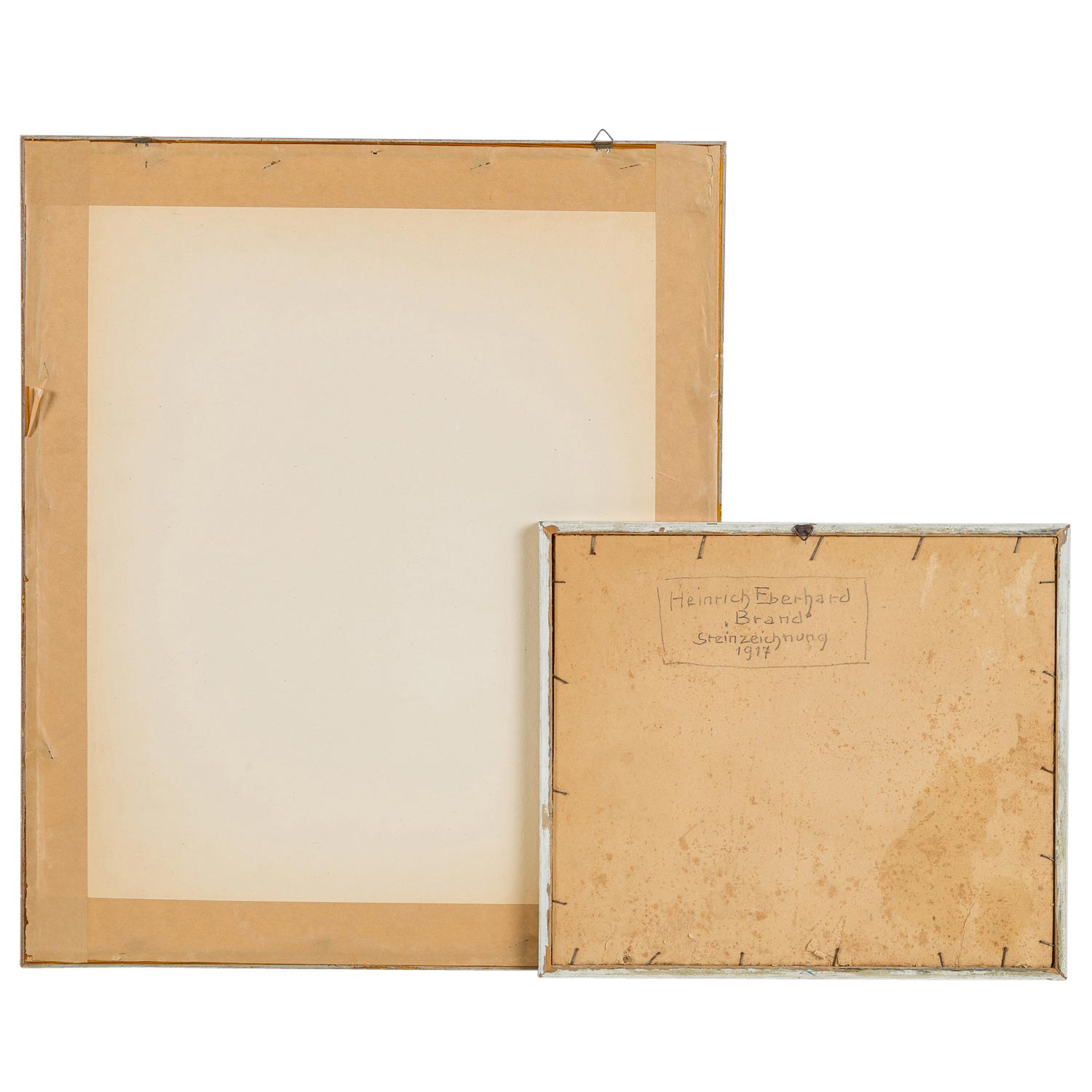 EBERHARD, HEINRICH (1884-1973), 2 works on paper: drawing and lithography, 1x 'house under trees', graphite drawing, signed and dated 1950, HxW: passe-partout cut-out approx. 35x27 cm (52x44 cm with frame); 1x 'Brand', lithograph, titled and signed by hand in pencil underneath, HxW: plate approx. 13x16 cm (28x33 cm with frame), inscribed and dated 1917 on the reverse. Signs of age and browned. Each framed behind glass in a passe-partout (partially damaged).