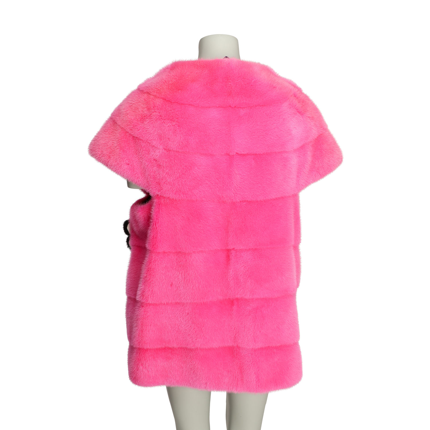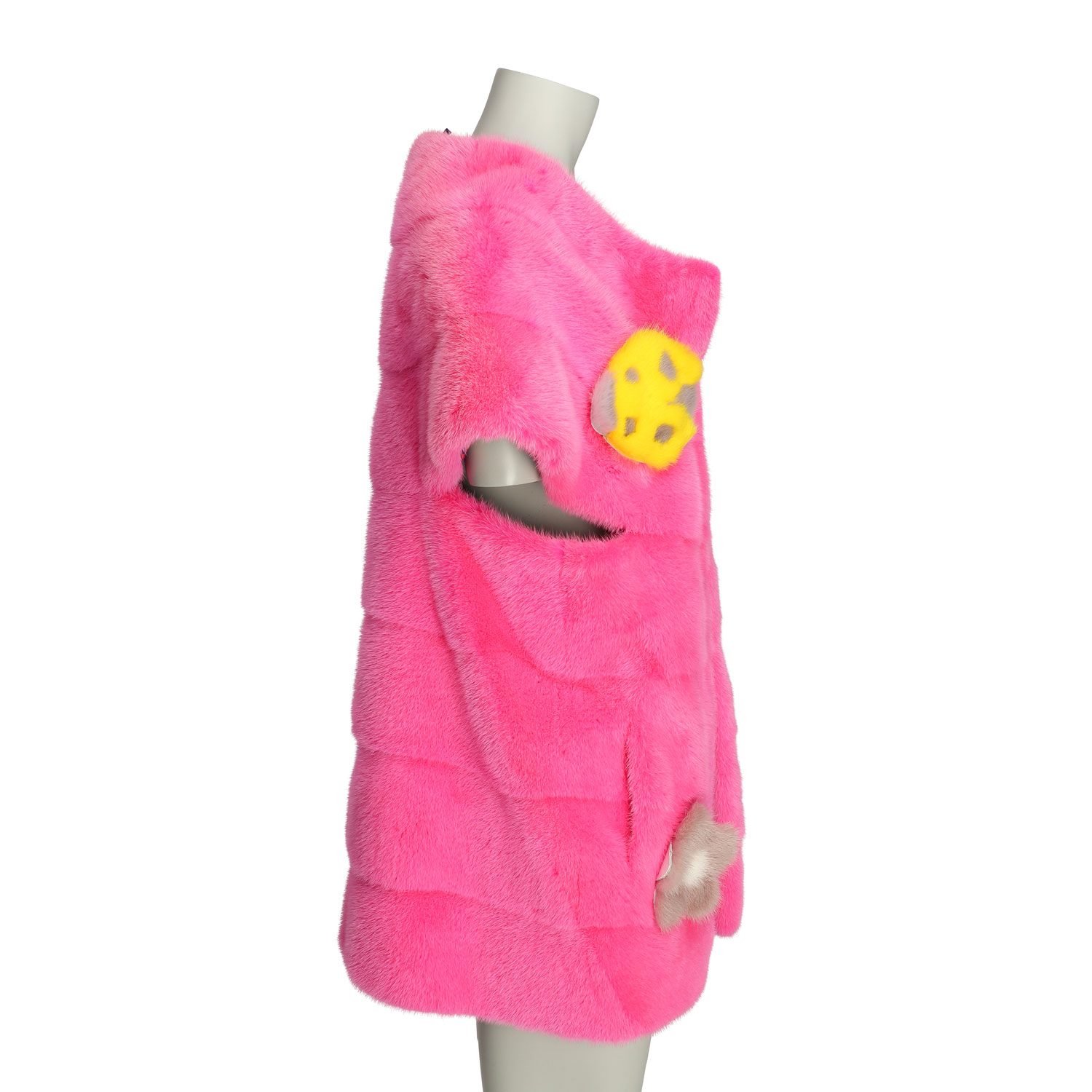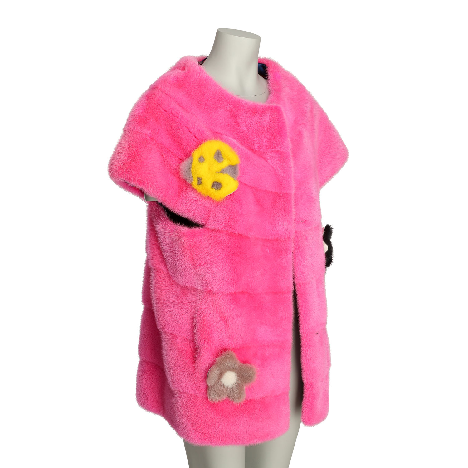 ELCOM vest, size approx. 38/40. Pink dyed mink fur cross-worked with round yoke, armholes, welt pockets, magnetic flowers and ladybirds. Lining with floral design in silk. Very good condition.