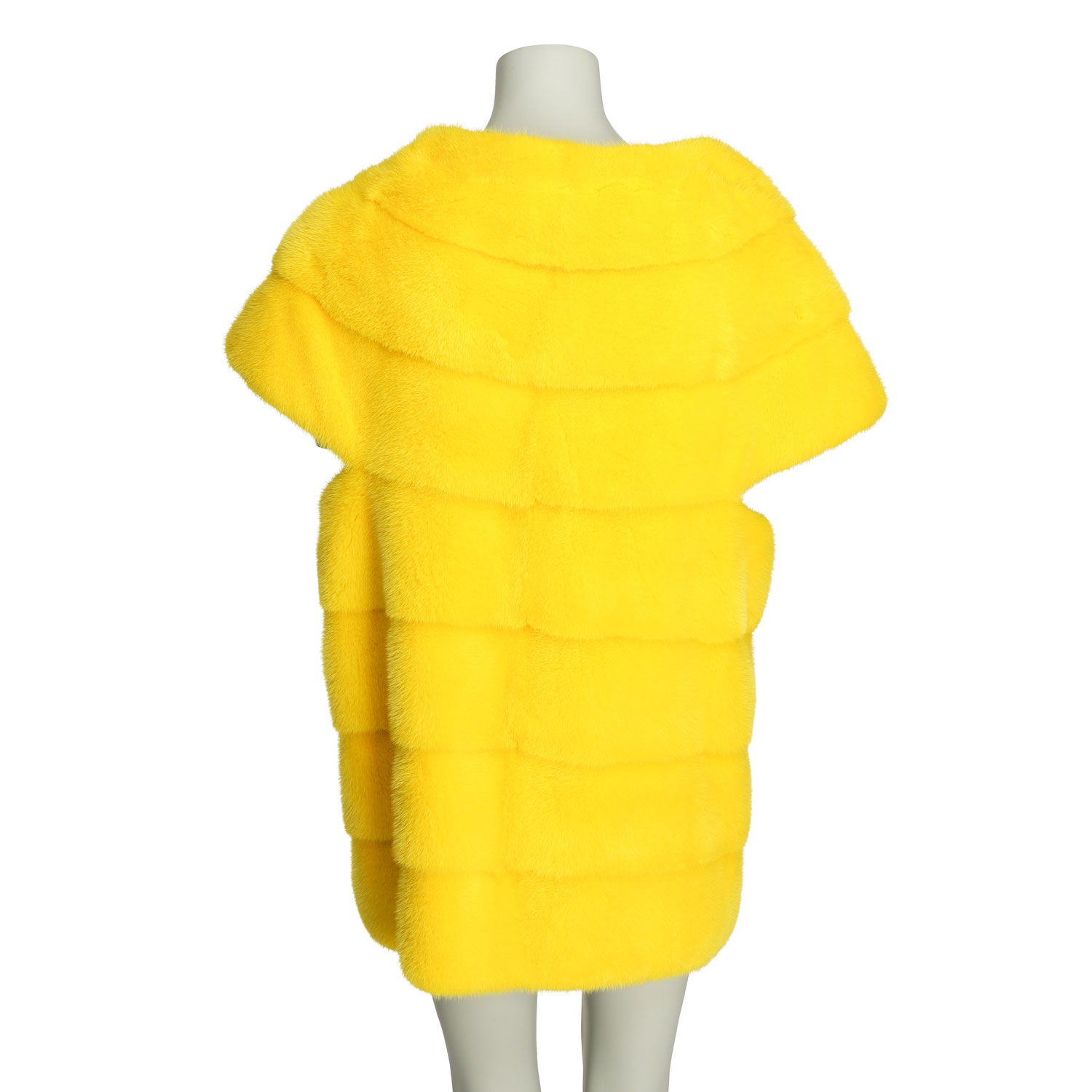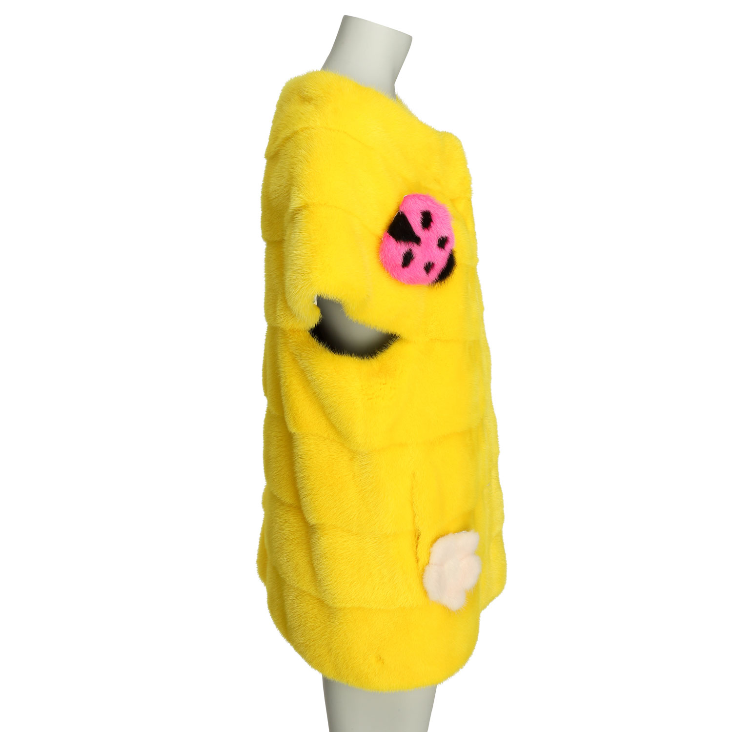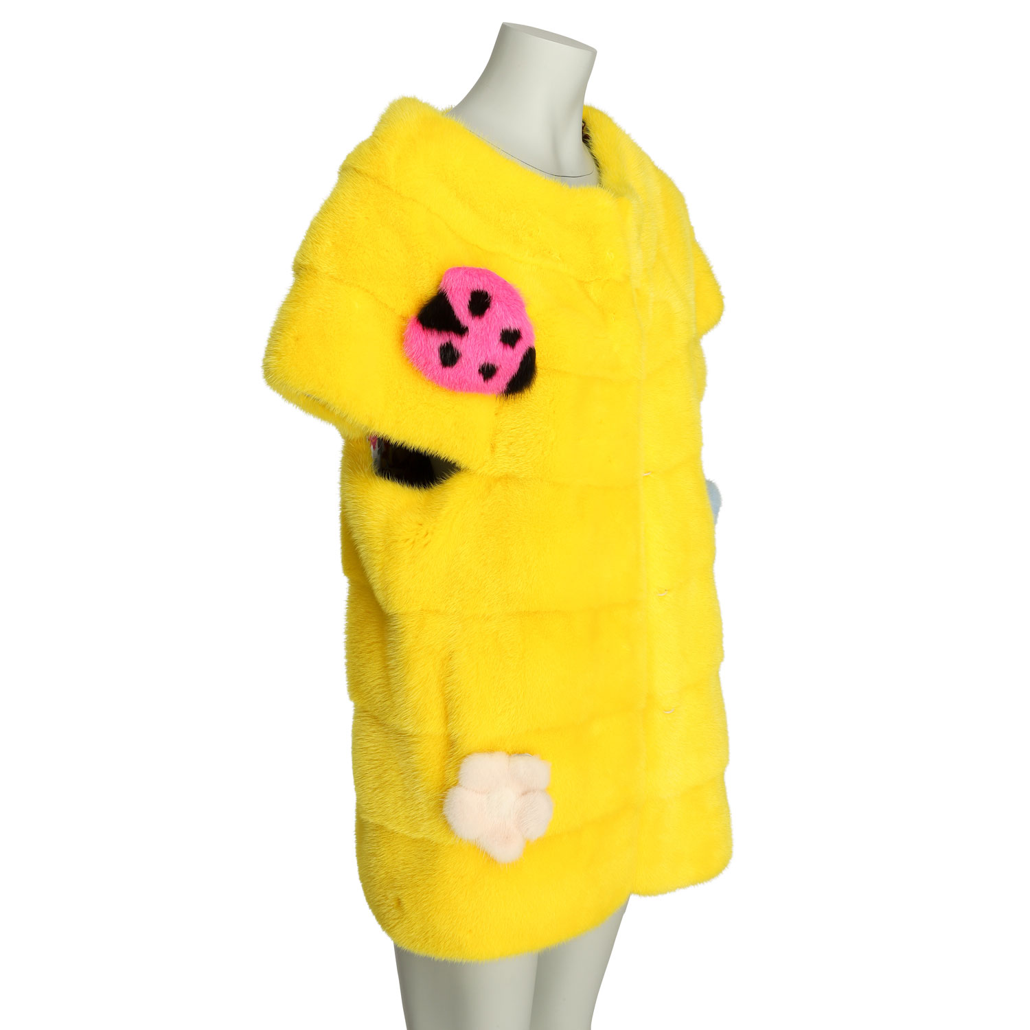 ELCOM vest, size approx. 38/40. Yellow dyed mink fur cross-worked with round yoke, armholes, welt pockets, magnetic flowers and ladybirds. Lining with floral design in silk. Very good condition.