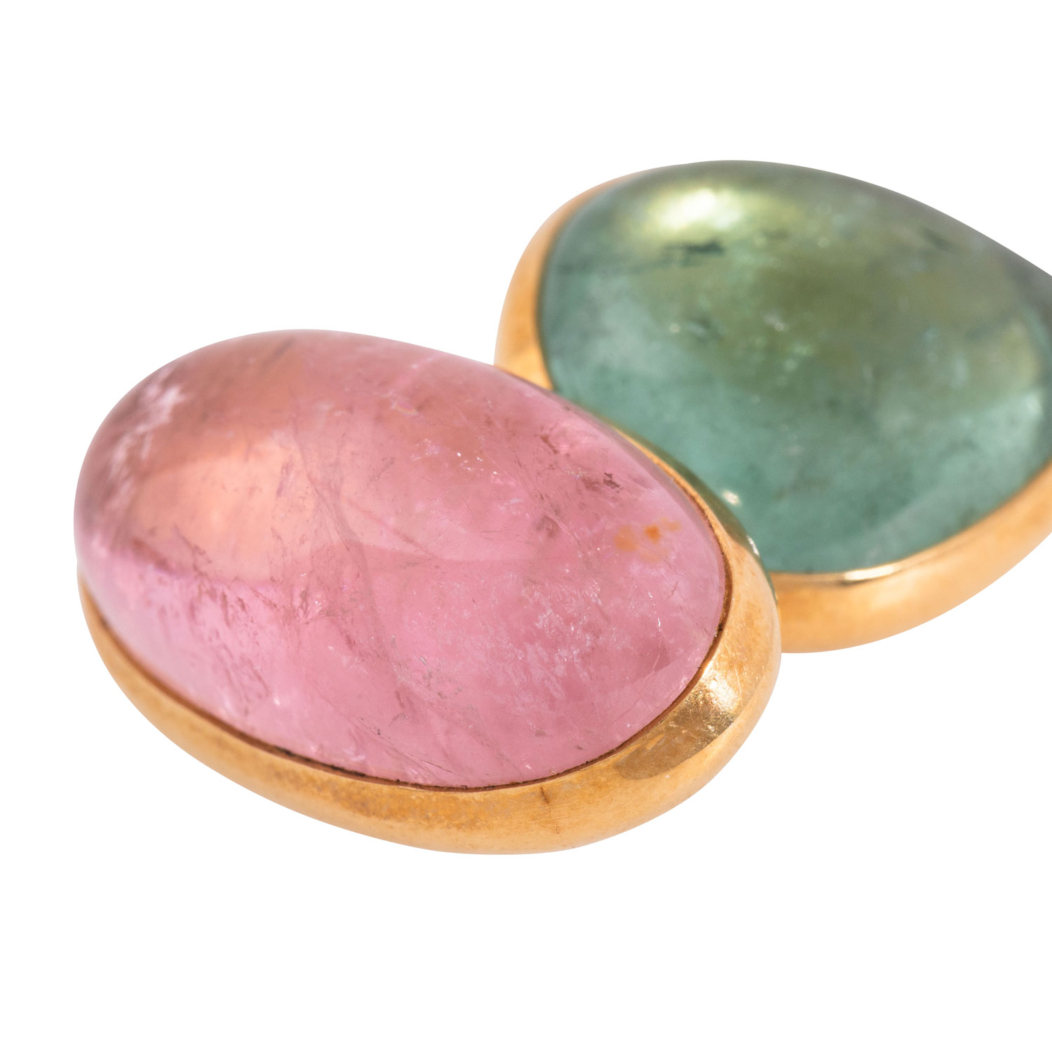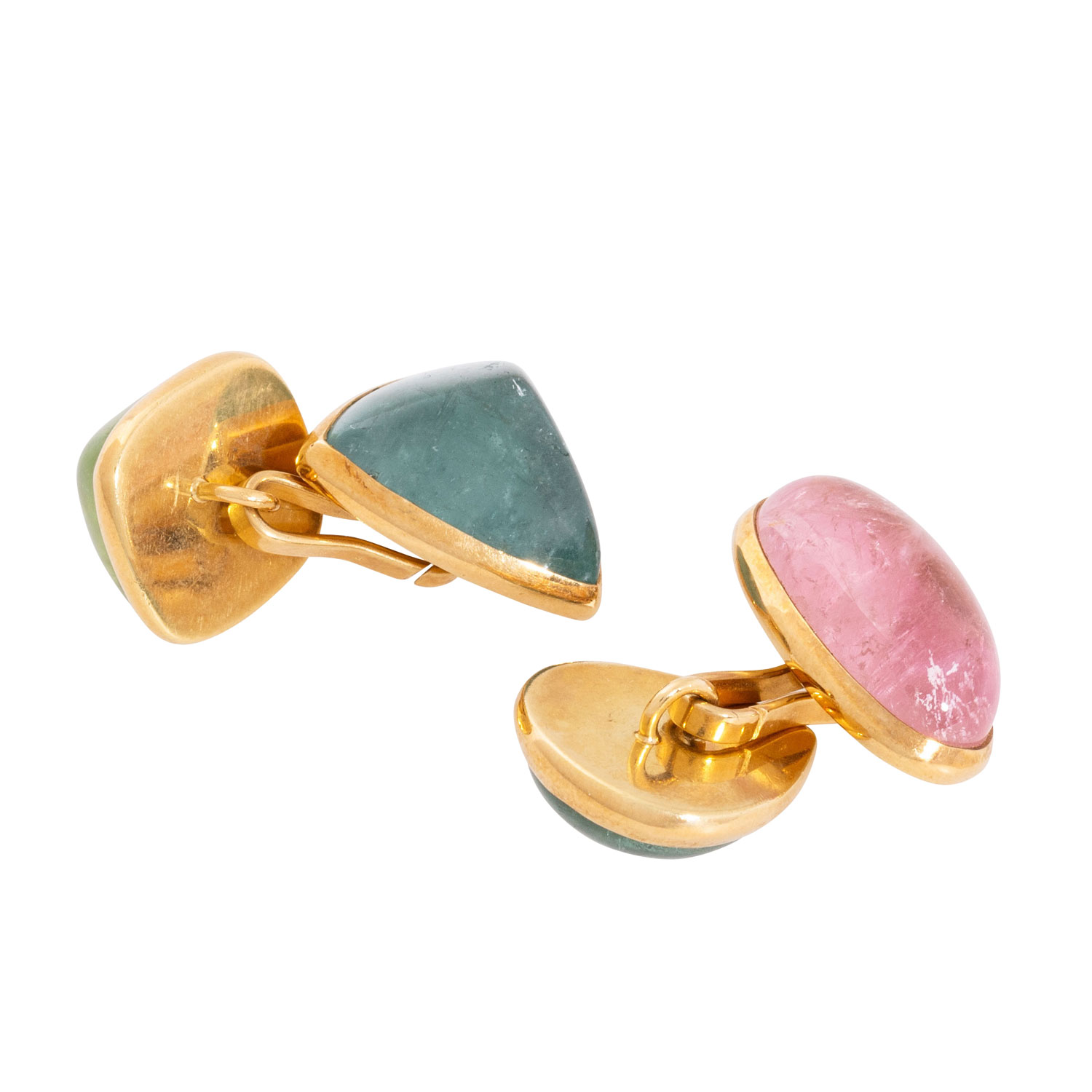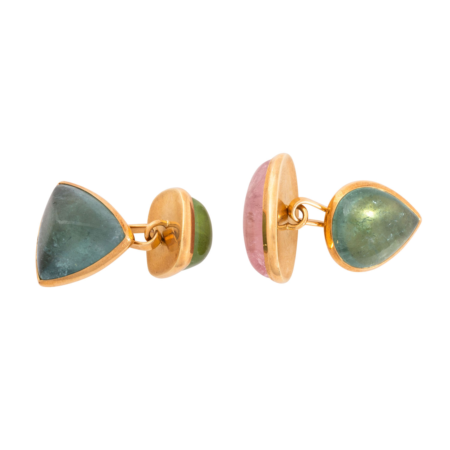 Elegant cuff links with cabochon-cut tourmalines in pastel colours and various shapes, 18K YG 26.6 g, 21th century, very good condition, high quality goldsmith´s work.
