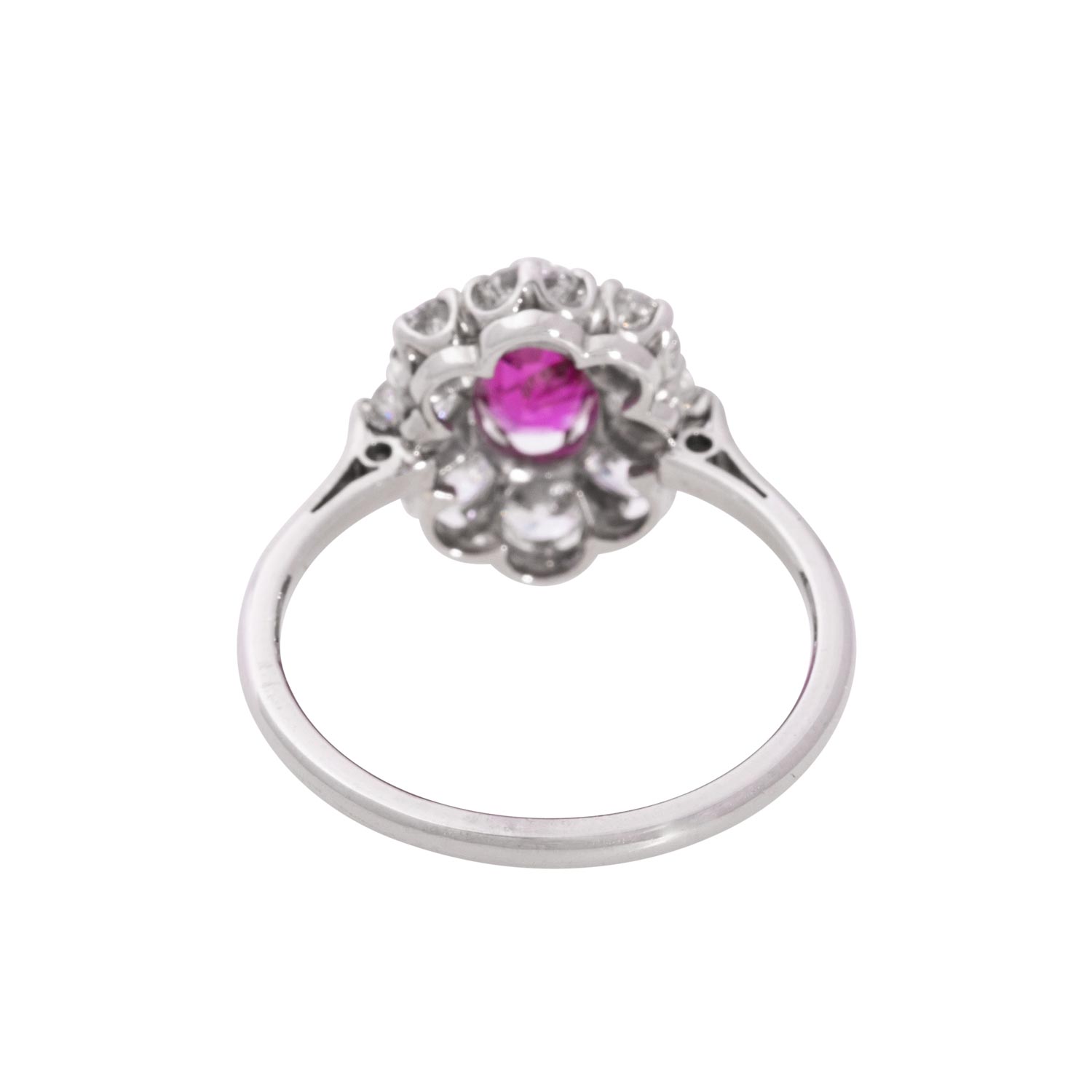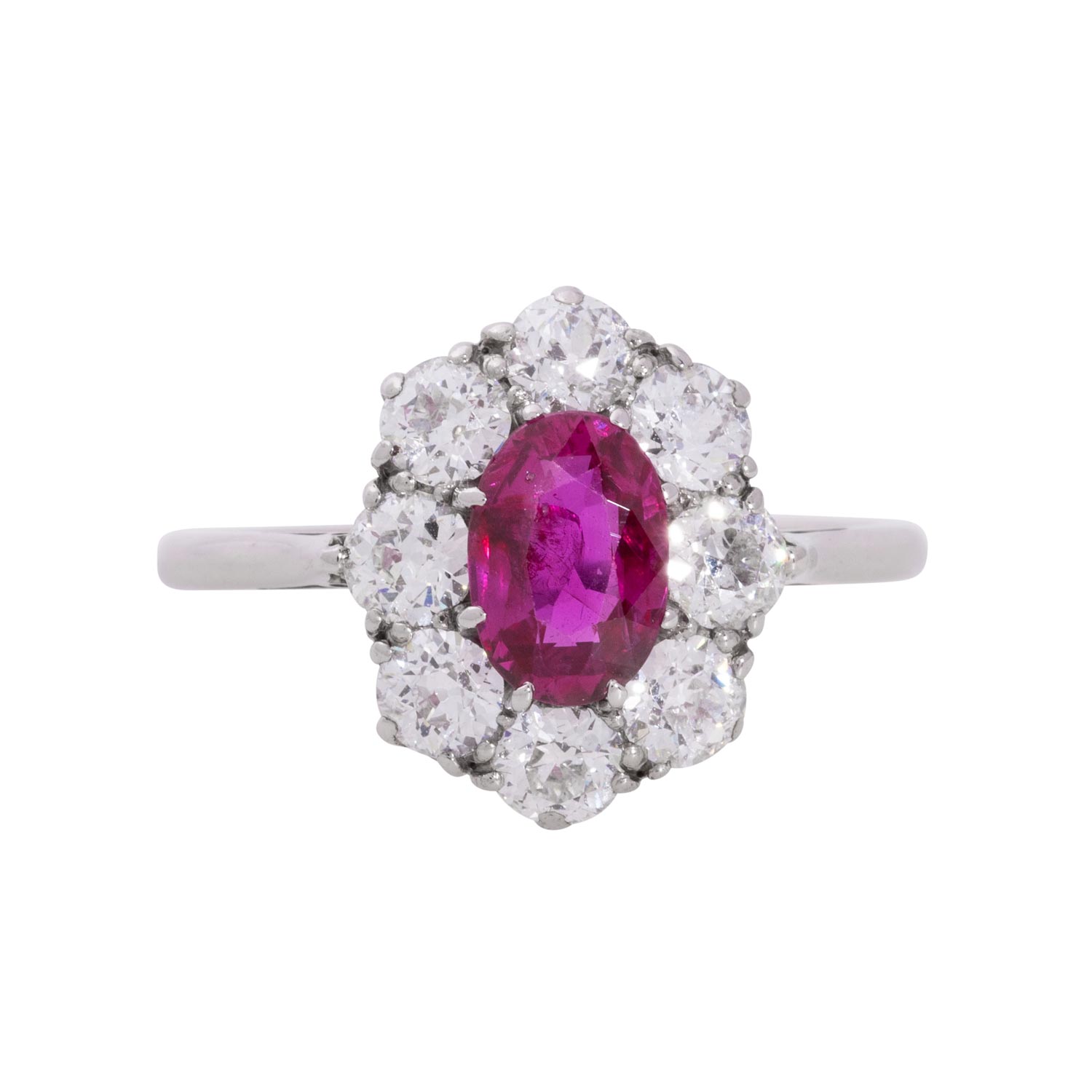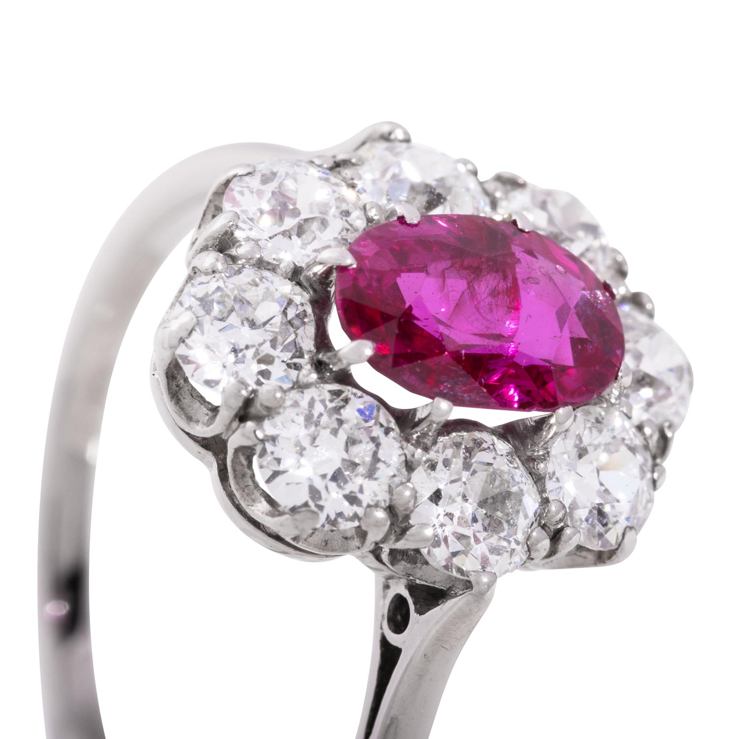 Classic Ring with fine Burma ruby ca. 1.55 ct (no heat) with DSEF report 035644 and old-cut diamonds totalling ca. 1.2 ct, ca. WHITE-STW (H-I)/VS-SI, WG 14K, 3.4 g, ring size 58.5, High jewelry craftsmenship.