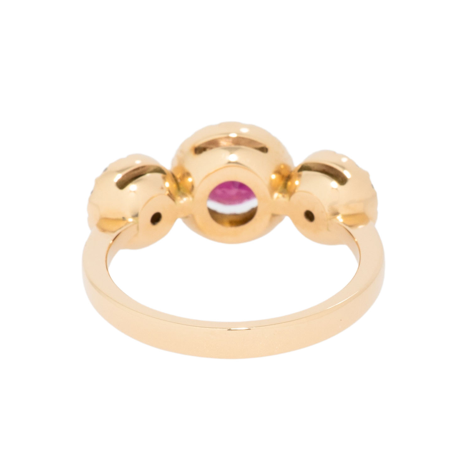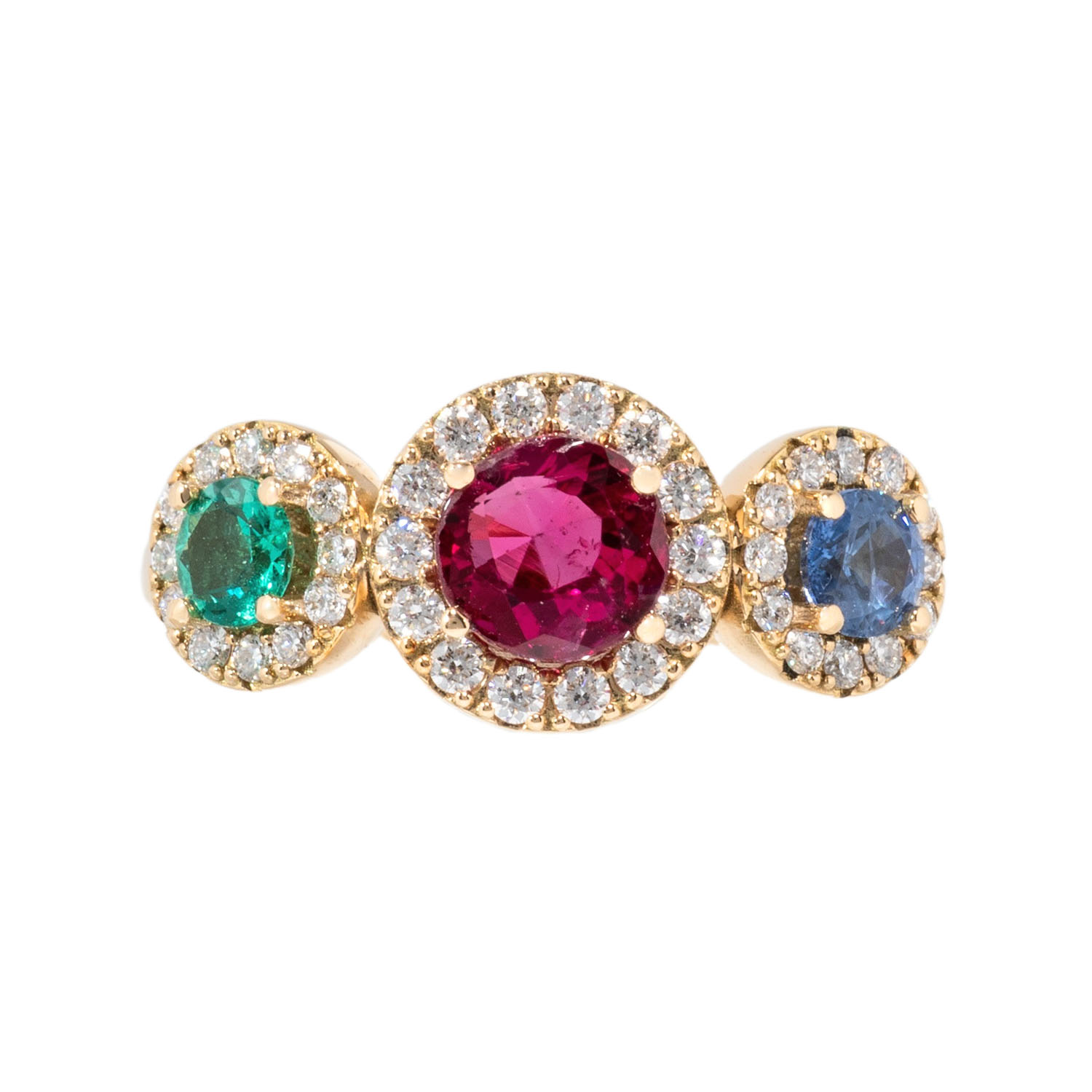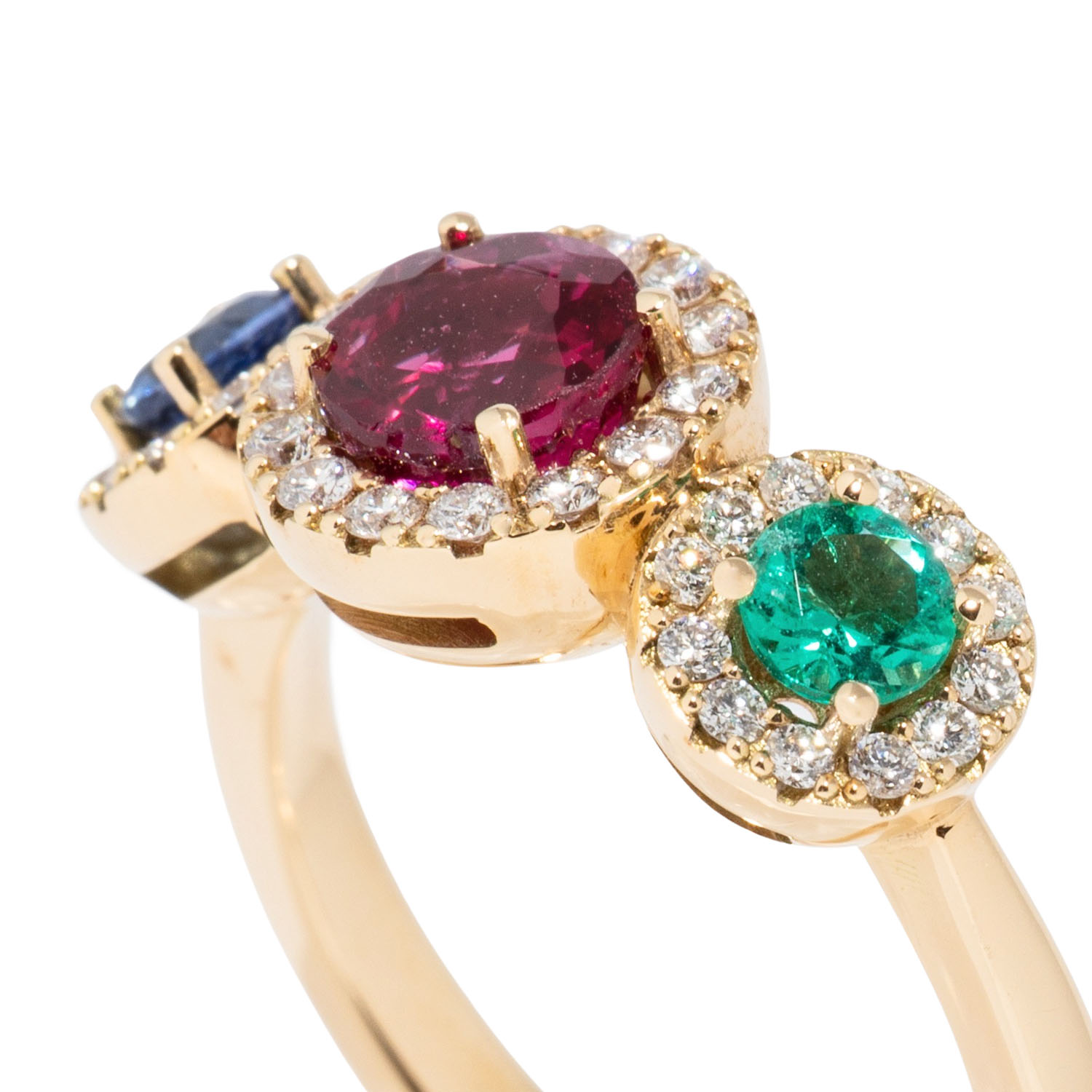 Elegant ring 'faith, love, hope' with a vivid BURMESE Ruby in the center. on the sides an emerald and a sapphire. Brill. cut diamonds tot. ca. 0,40 ct. RW G /VSI. YG 18 K, 5,56 g. Ringsize ca.. 54. DSEF-report 039390 ffor ruby enclosed. High jewelry craftrsmenship.