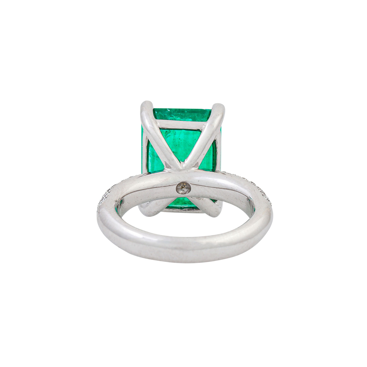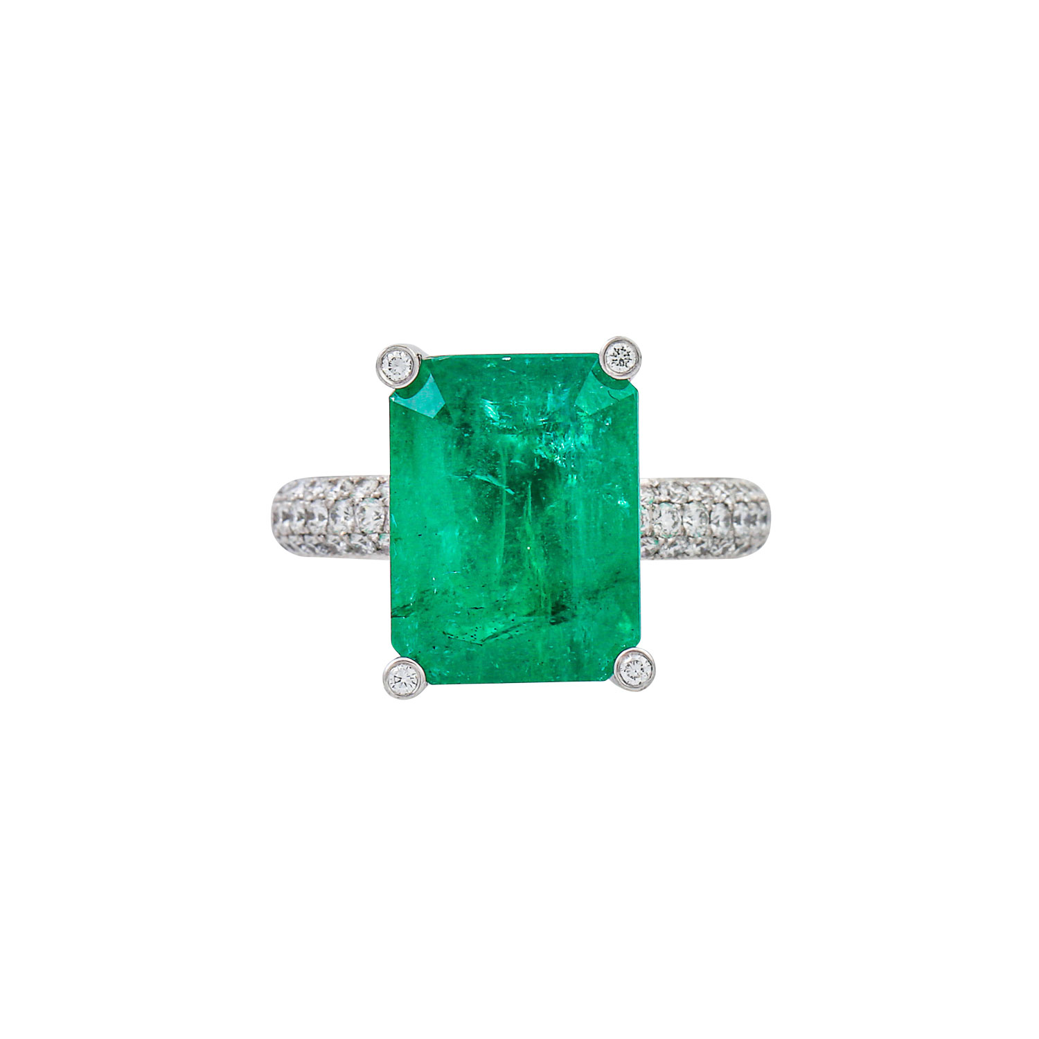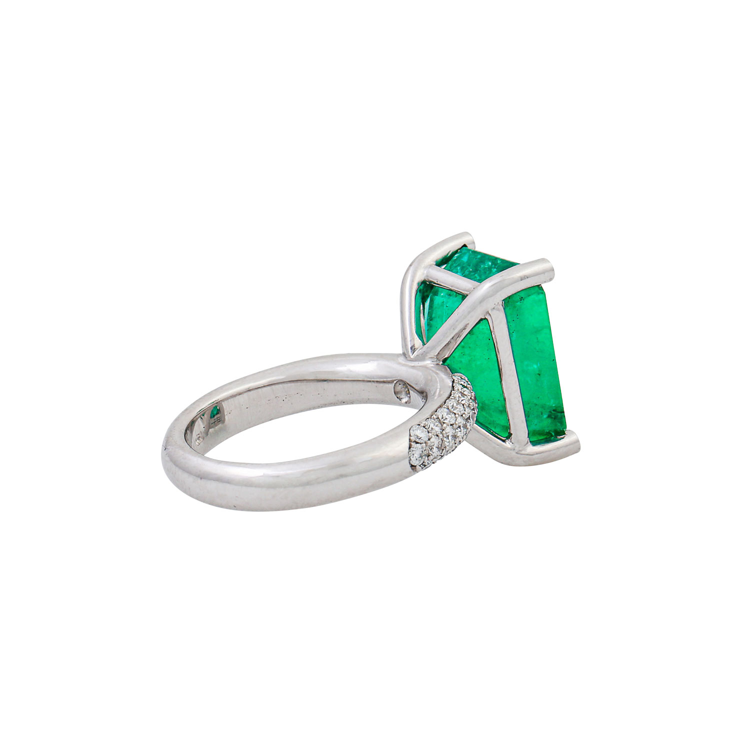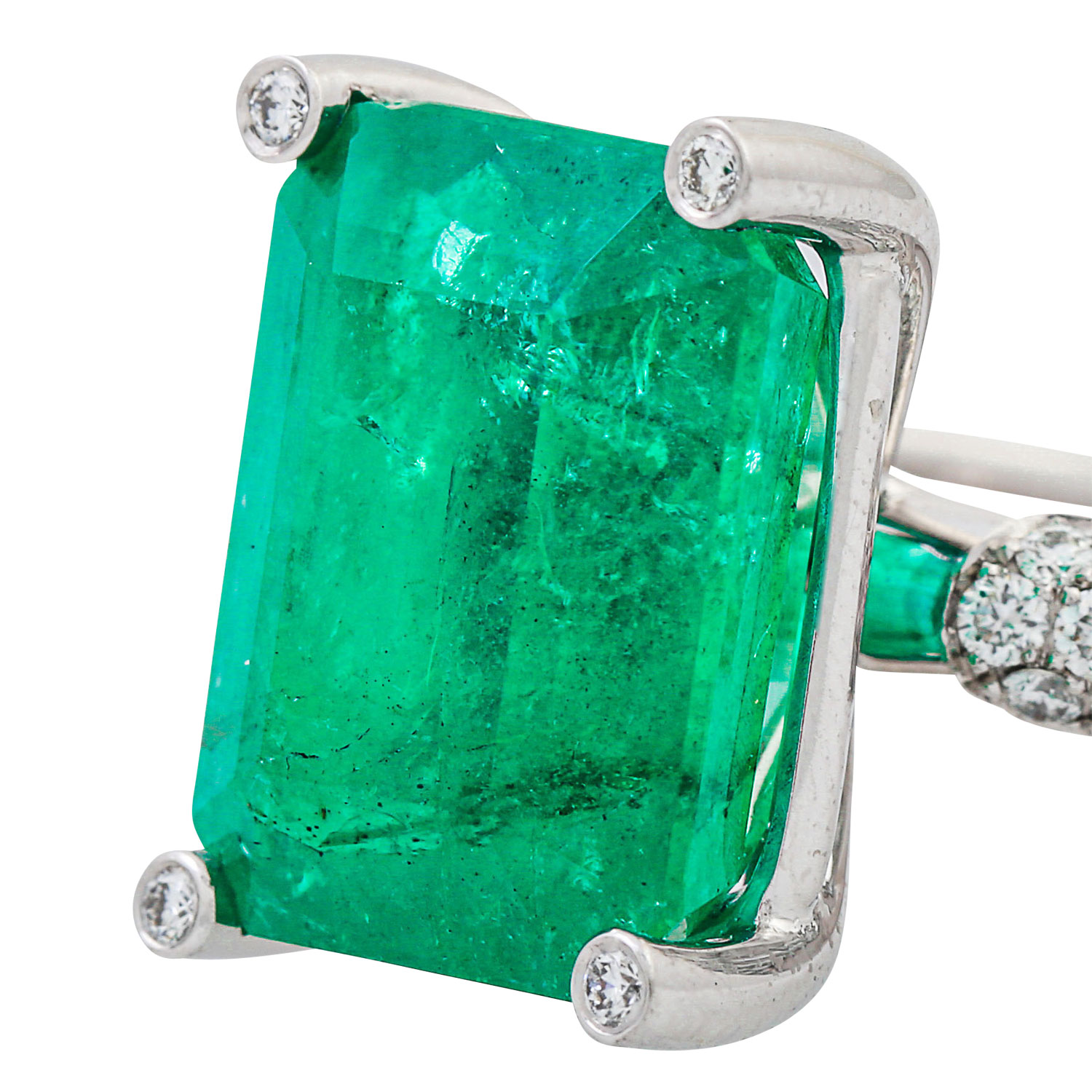 Elegant lady's ring with 1 emerald, ca. 12.28 ct, and 48 brilliant-cut diamonds, totalling ca. 0.47 ct. F/VSI. 18K WG, 15g, ring size 57, 21st century, emerald slightly damaged, high quality goldsmith's work.