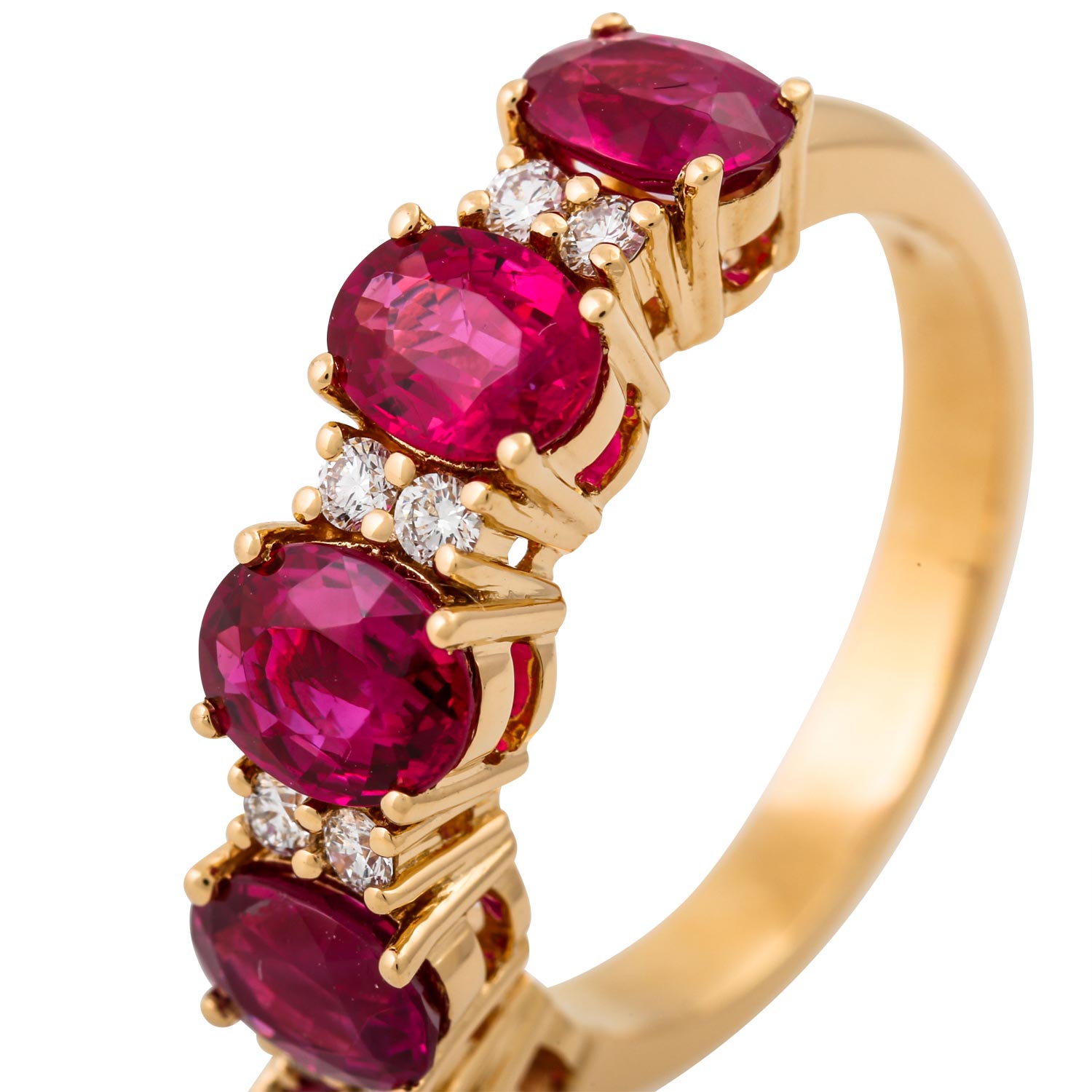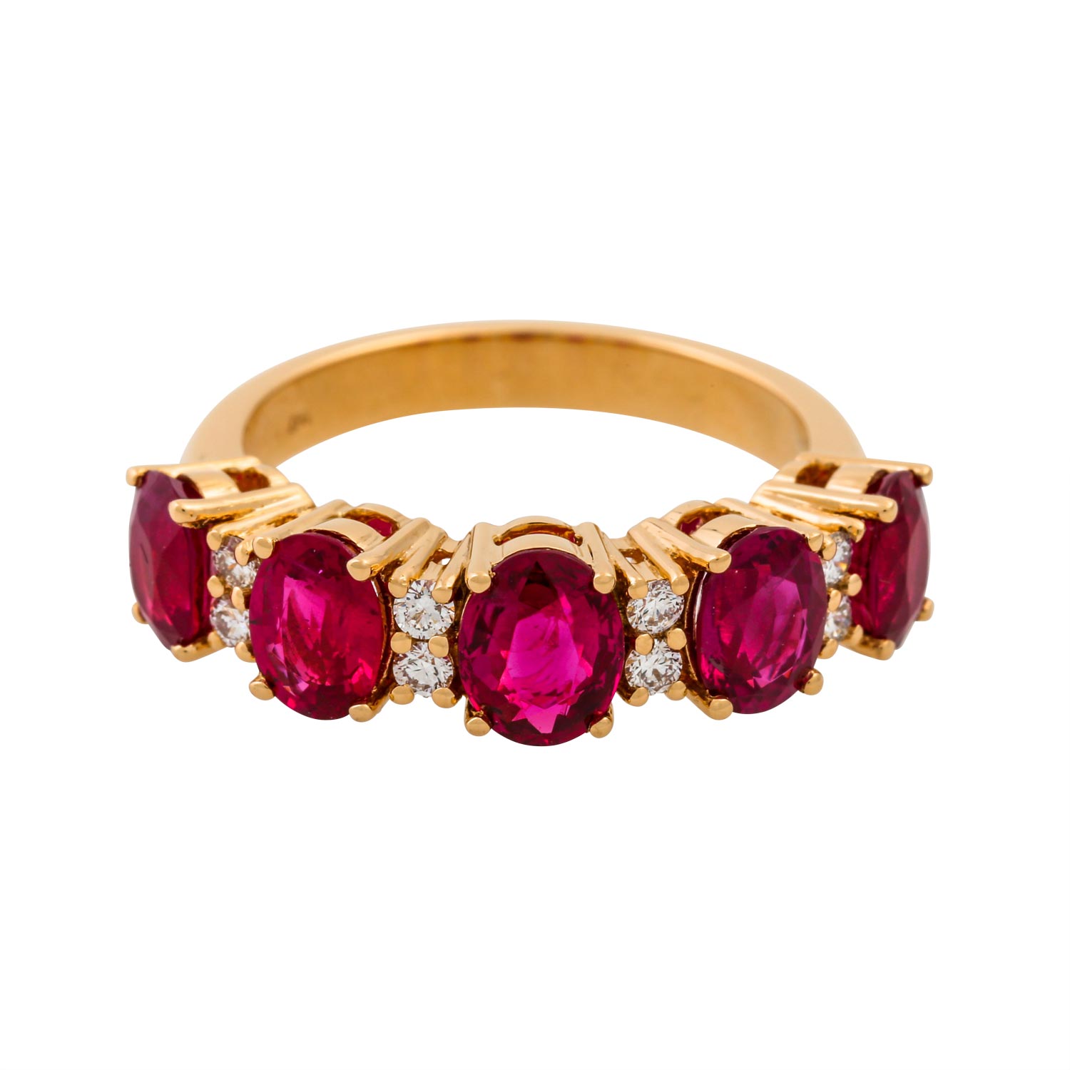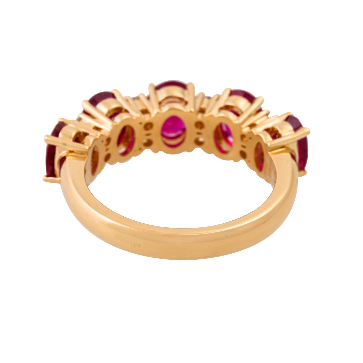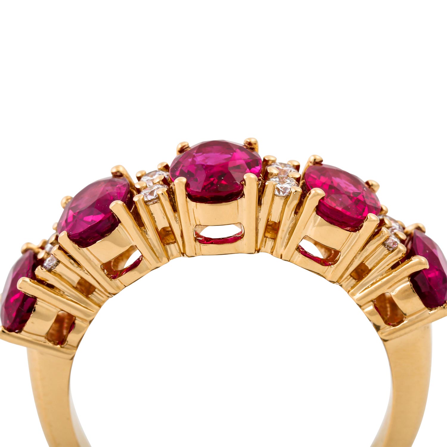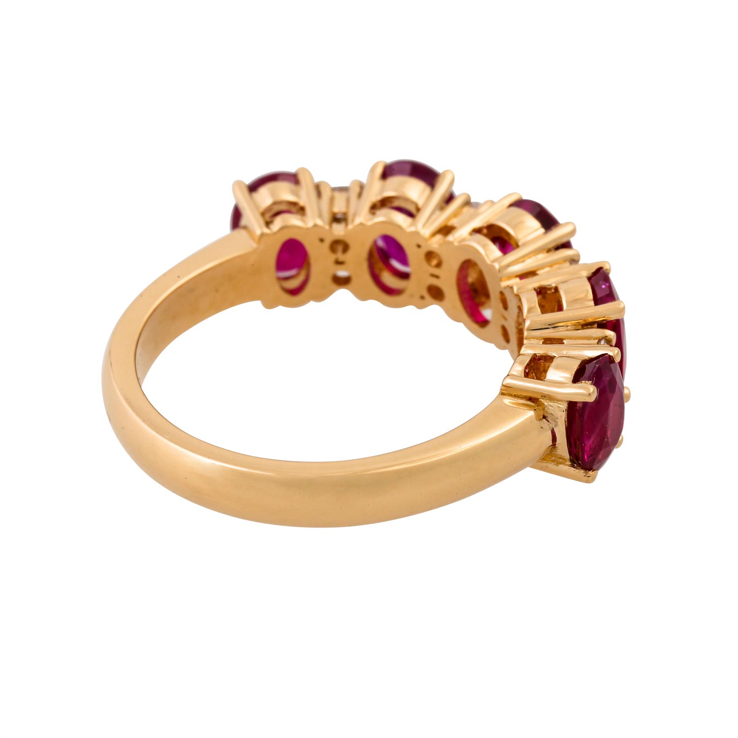 Elegant ring with 5 very fine Burma rubies and 8 brilliant-cut diamonds totalling ca. 0.20 ct, RW (F-G)/VS-SI, 18K YG, 6.8 gr, ring size 55, 21st century, minimal signs of wear, high quality craftsmanship.