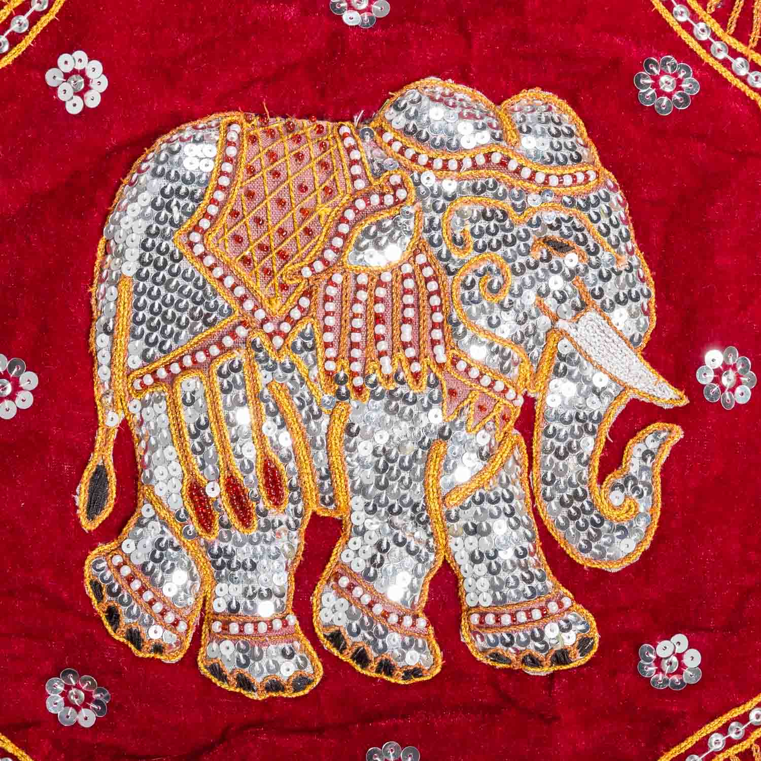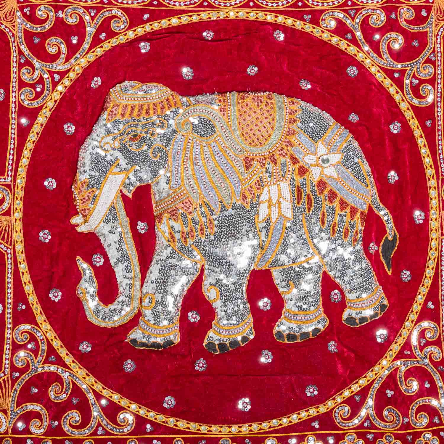 Elephant wall hanging. INDIEN, 20th c., made from red velvet which is embroidered with five elephants made of silver sequins. Border and loops made of silk, HxW: 94x138 cm.