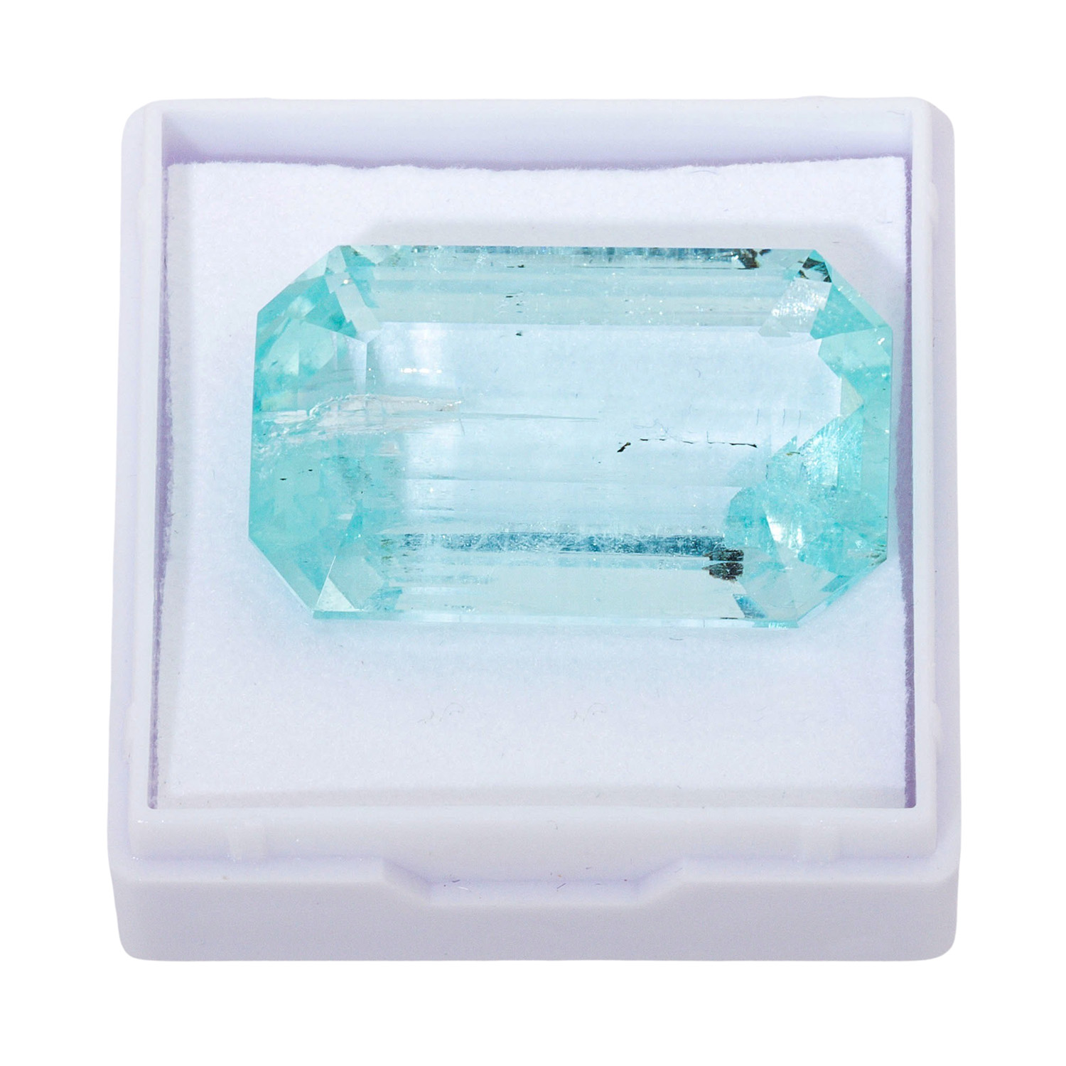 Emerald-cut aquamarine of c. 51.2 ct (27.7 x 12.5 x 13.5 mm), fine colour, nat. growth features, good condition. Replacement value: c. 30 € per ct. All stones without detailed gemological testing!