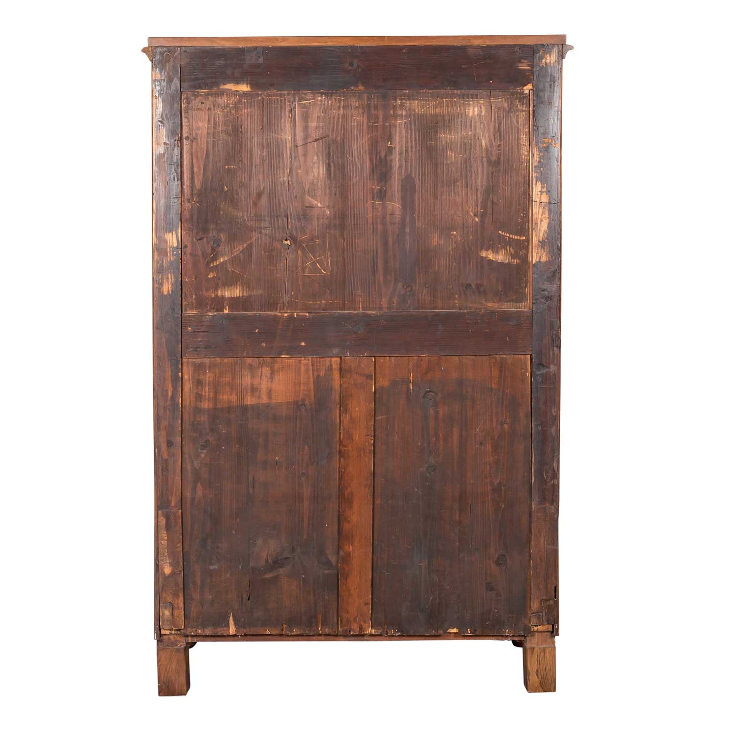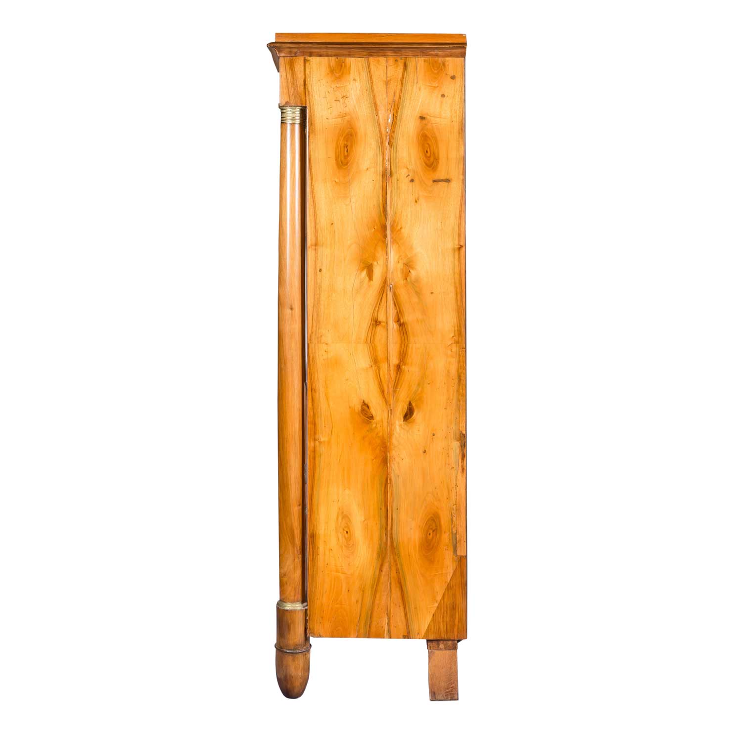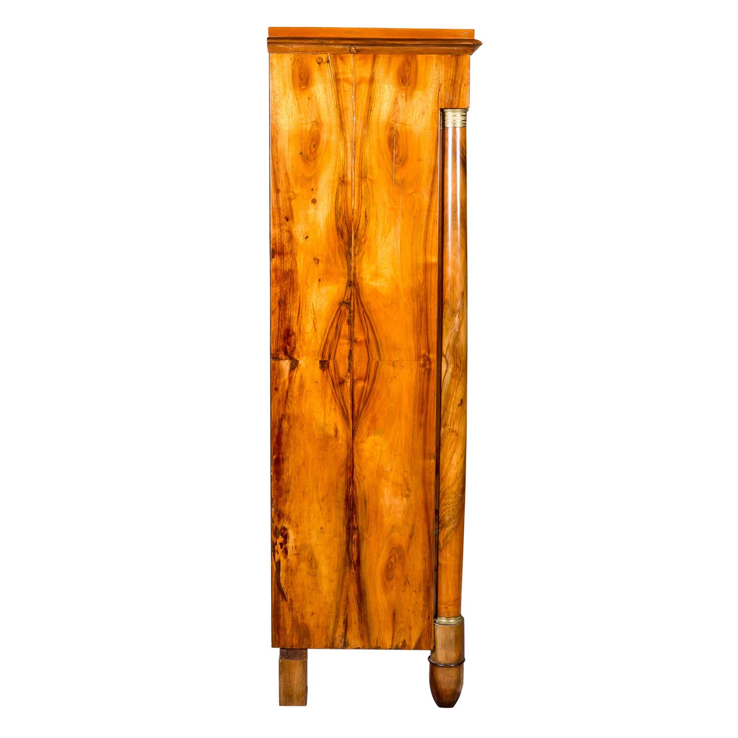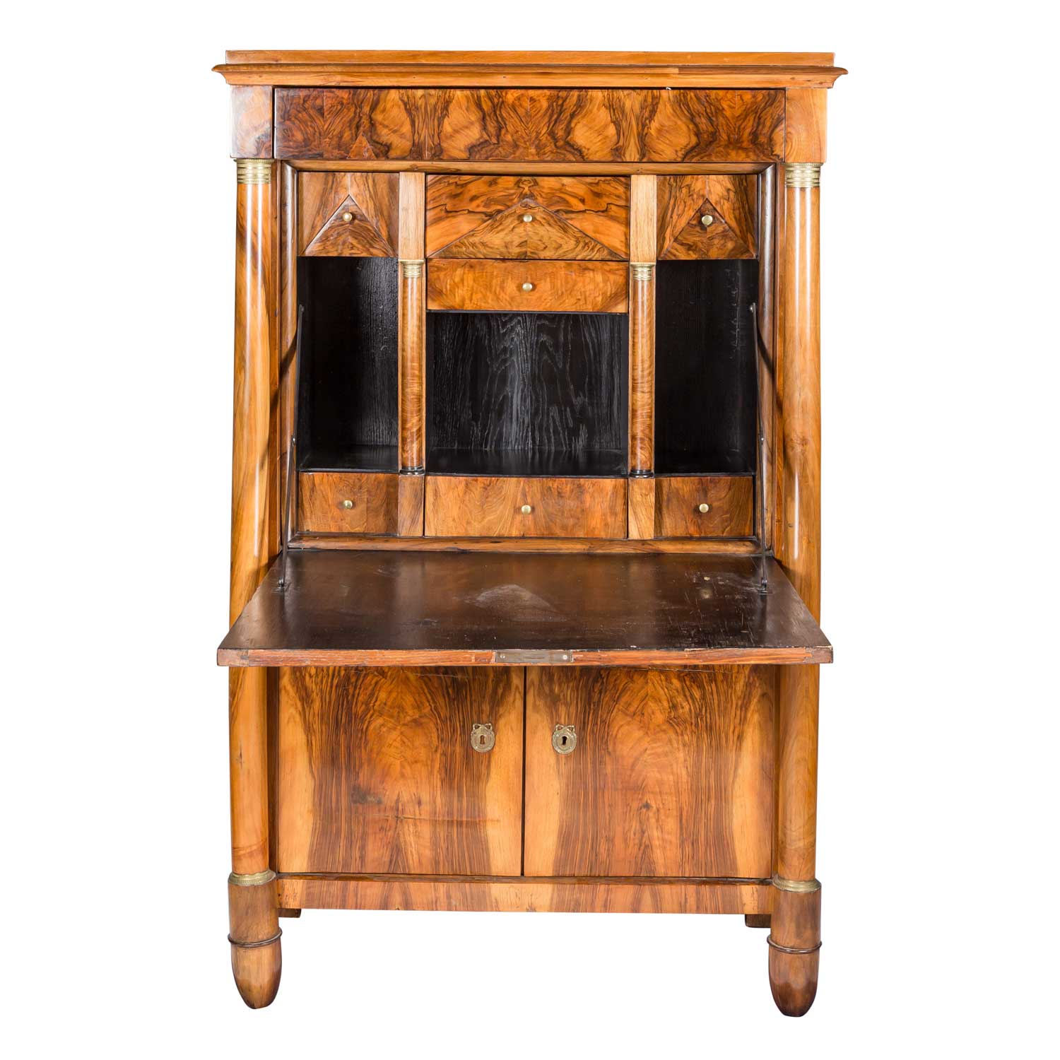 France, c. 1820, walnut, standing on solid block feet, secretary with two doors at the bottom and a writing flap above, the body flanked by two solid walnut columns, above the writing flap we find a head drawer, behind the writing flap, architecturally designed, interior, HxWxD: 165/106/52 cm. Traces of age, originally with a loose black marble top.