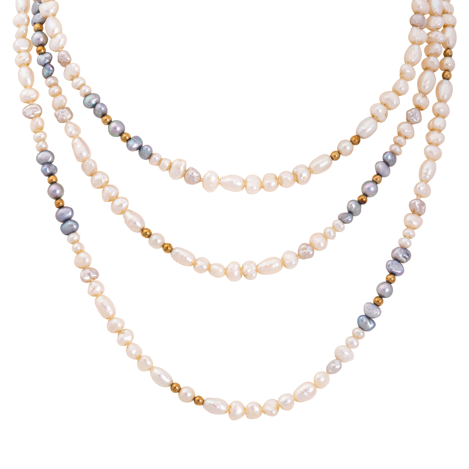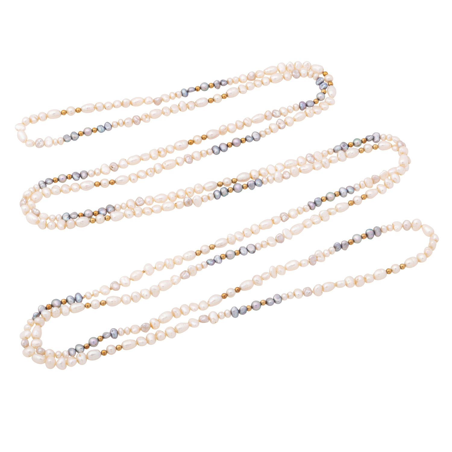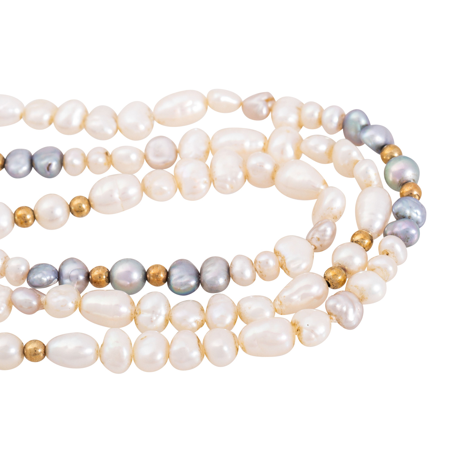 Endless pearl necklace with 56 gold balls and 392 freshwater cultured pearls, 308 of which are baroque and 14 round, D: approx. 4.8 mm, white pearls and 56 baroque and 14 round, D: approx. 4,9 mm, gray pearls, 14K yellow gold, total. 62.1 g, L: approx. 200 cm, W: approx. 3.6 - 5.9 mm, 20th/21st century, minor signs of wear.
