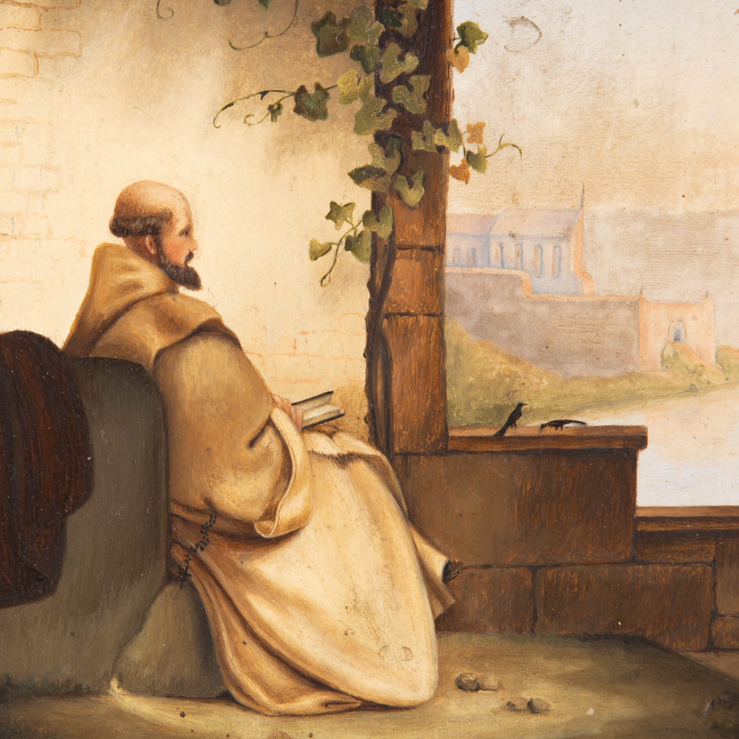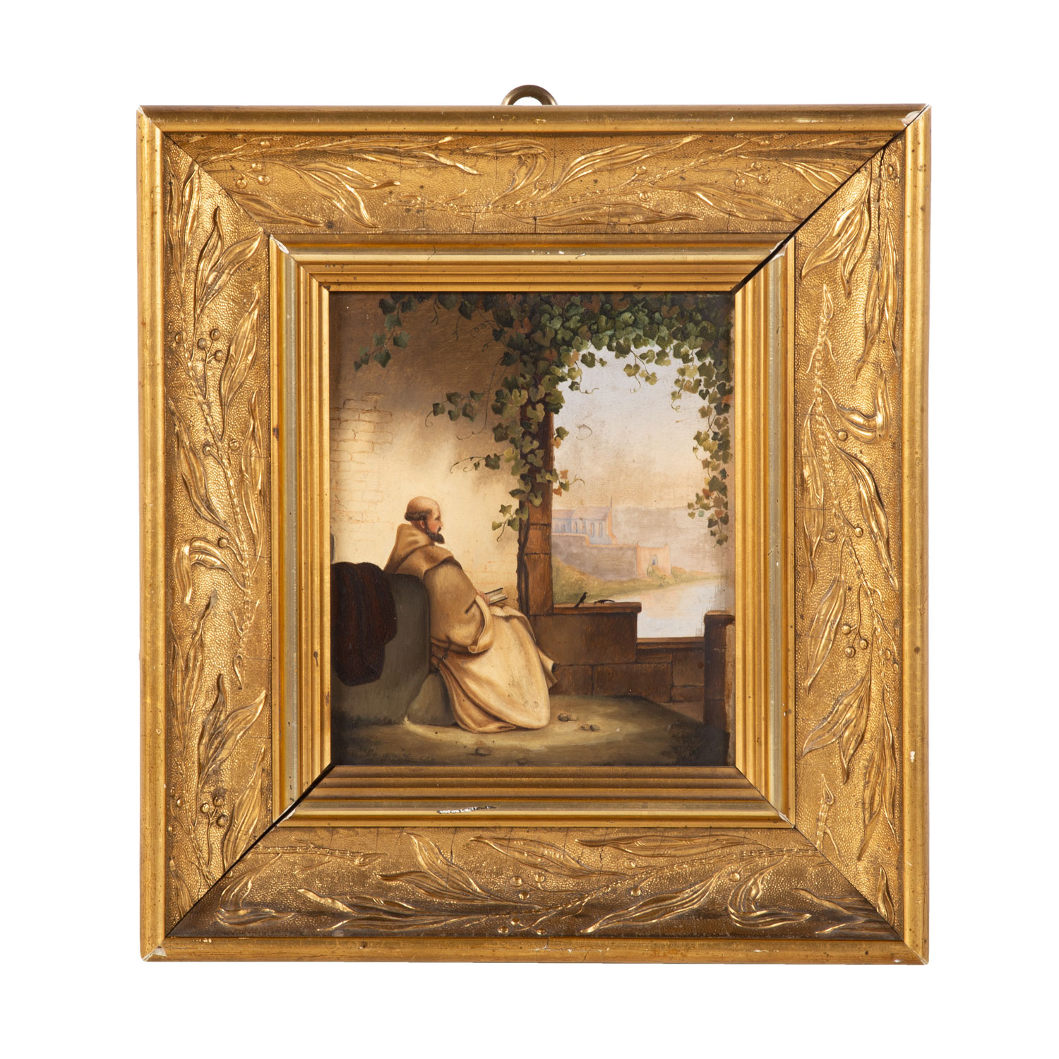ENGLISH PAINTER OF THE 20th CENTURY 'Reading Monk in the Shade of a Vine'.Oil on panel, HxW: 18/15,5 cm. Frame, HxW: 29/27 cm.