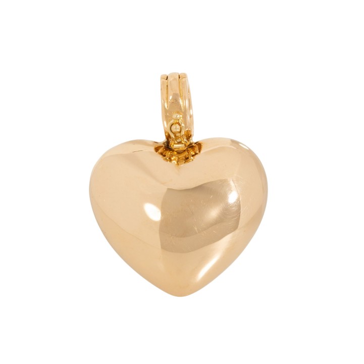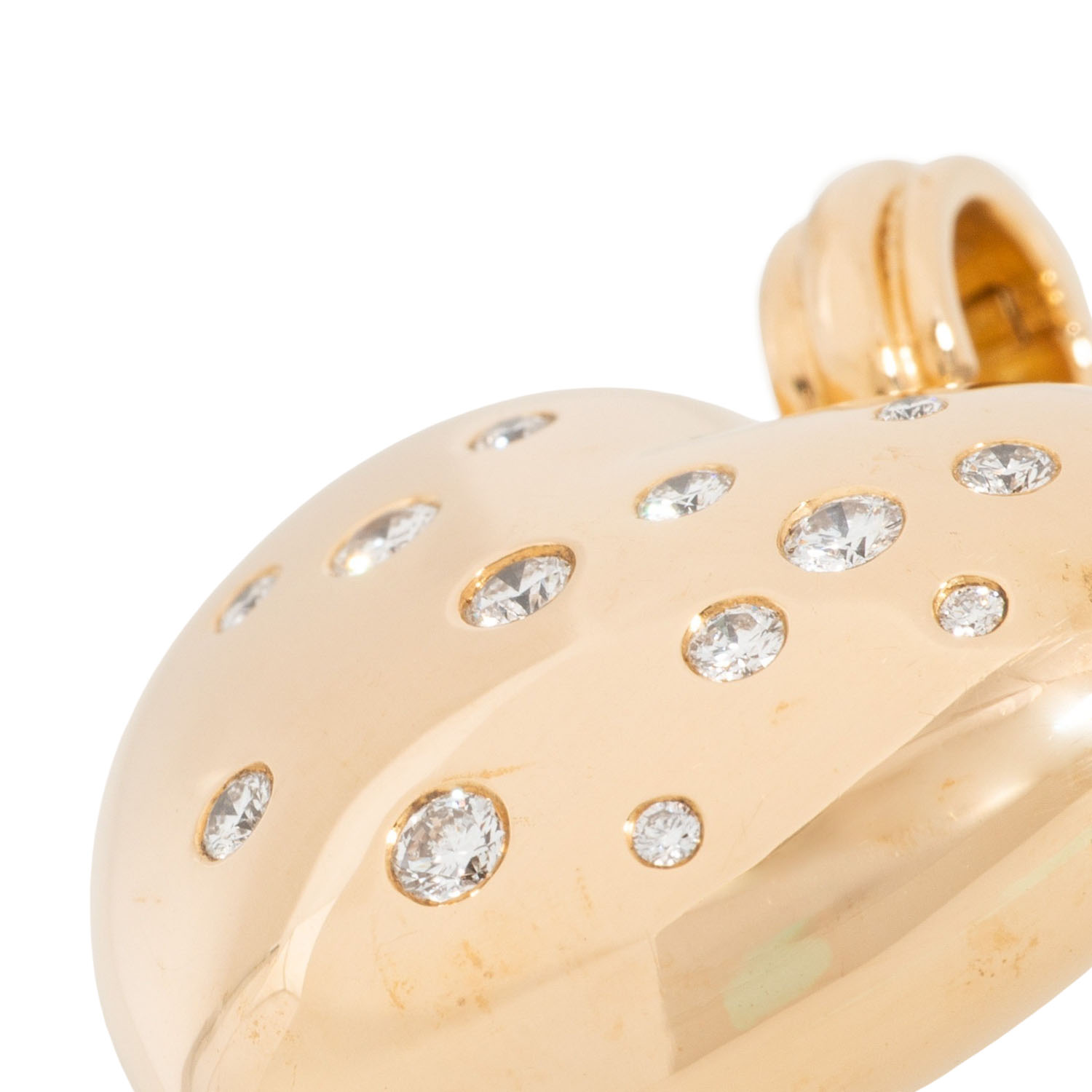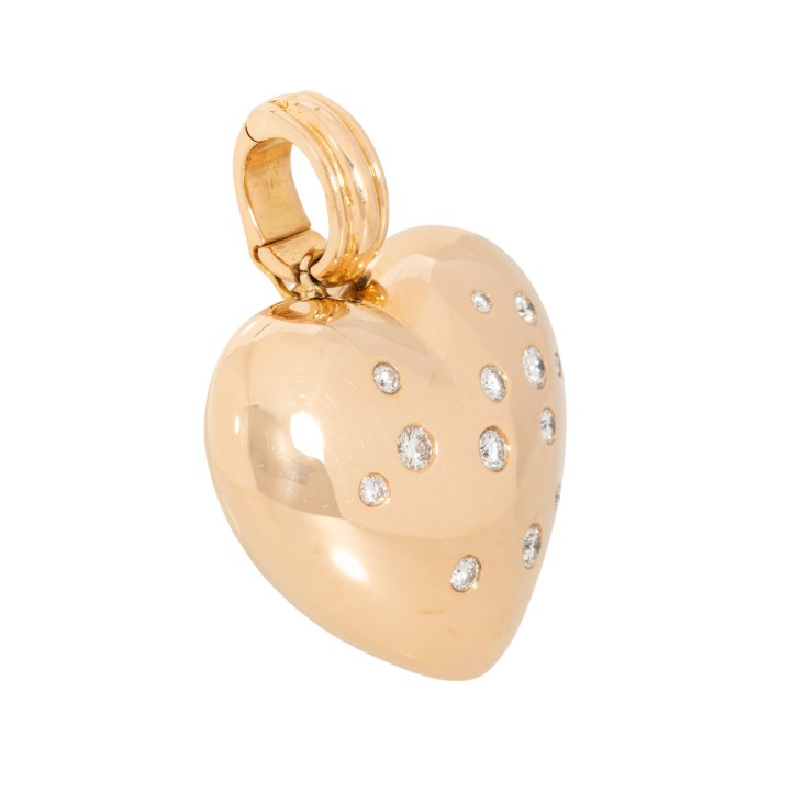 Pendant/hanger 'Heart', set with 13 brilliant cut diamonds, totalling ap. 0.56 ct, good colour and clarity, 18K yellow gold, 17.9 g, L x B: 36 x 29 mm, safety catch at flap, late 20th century, minimal signs of wear.
