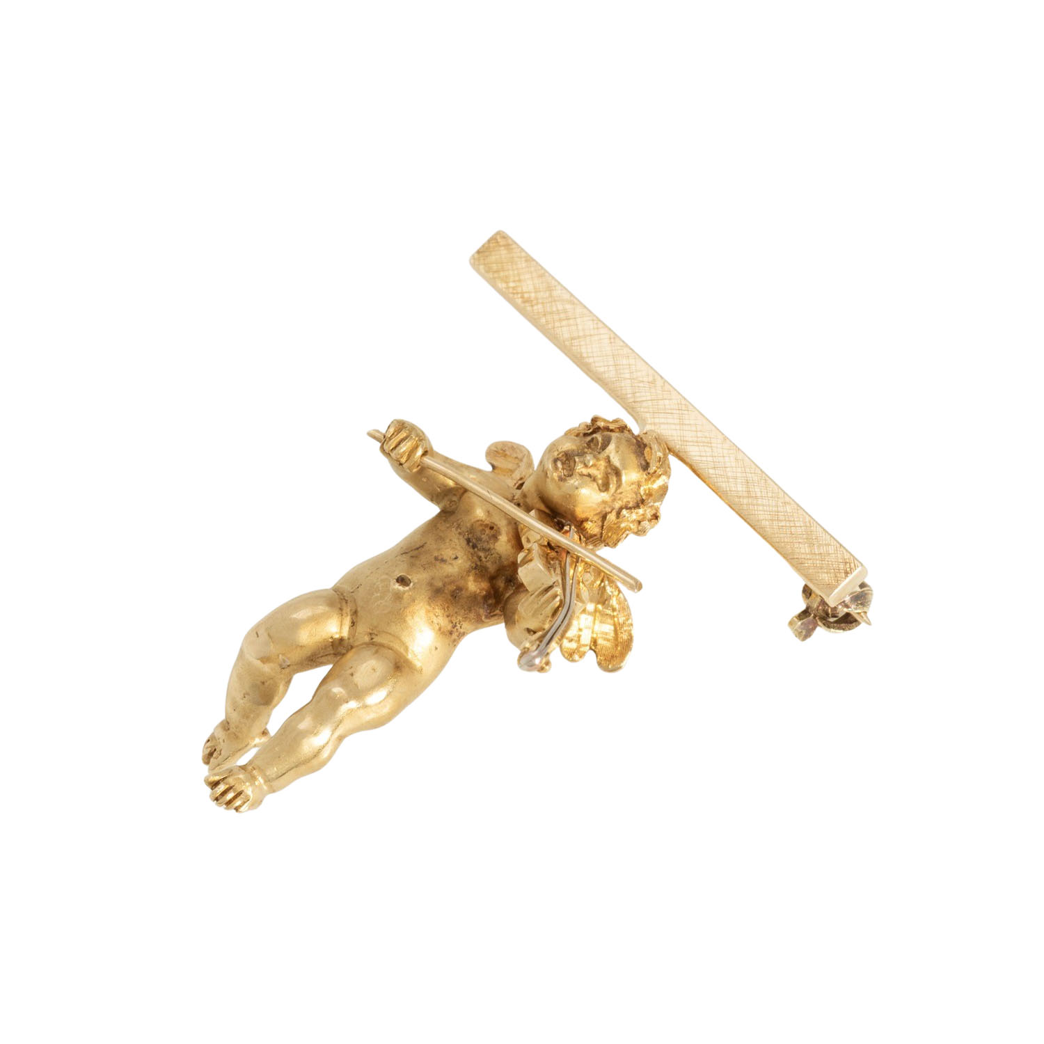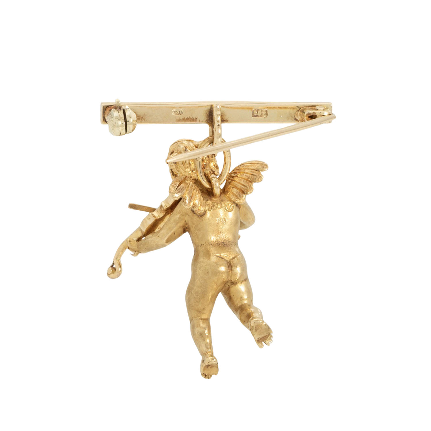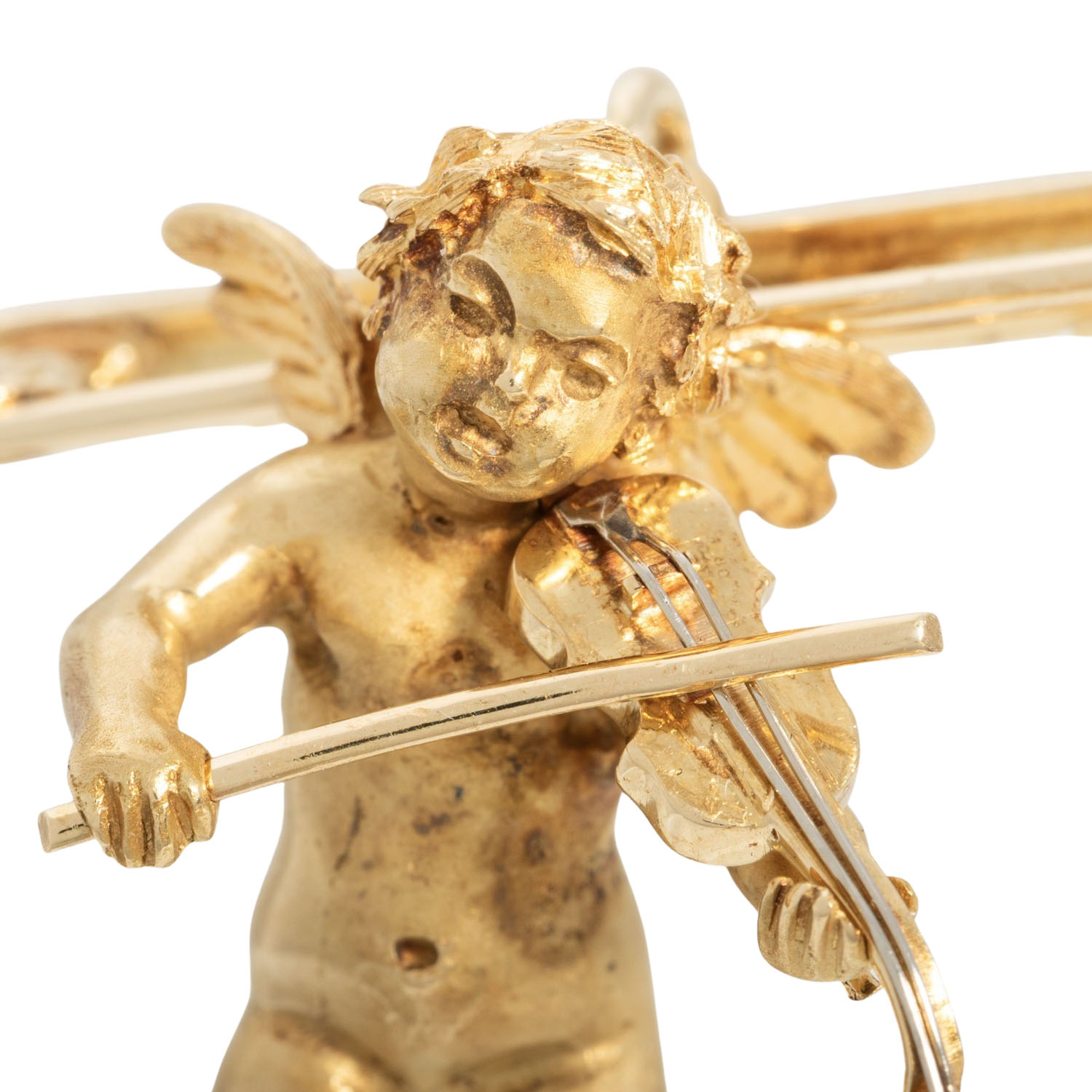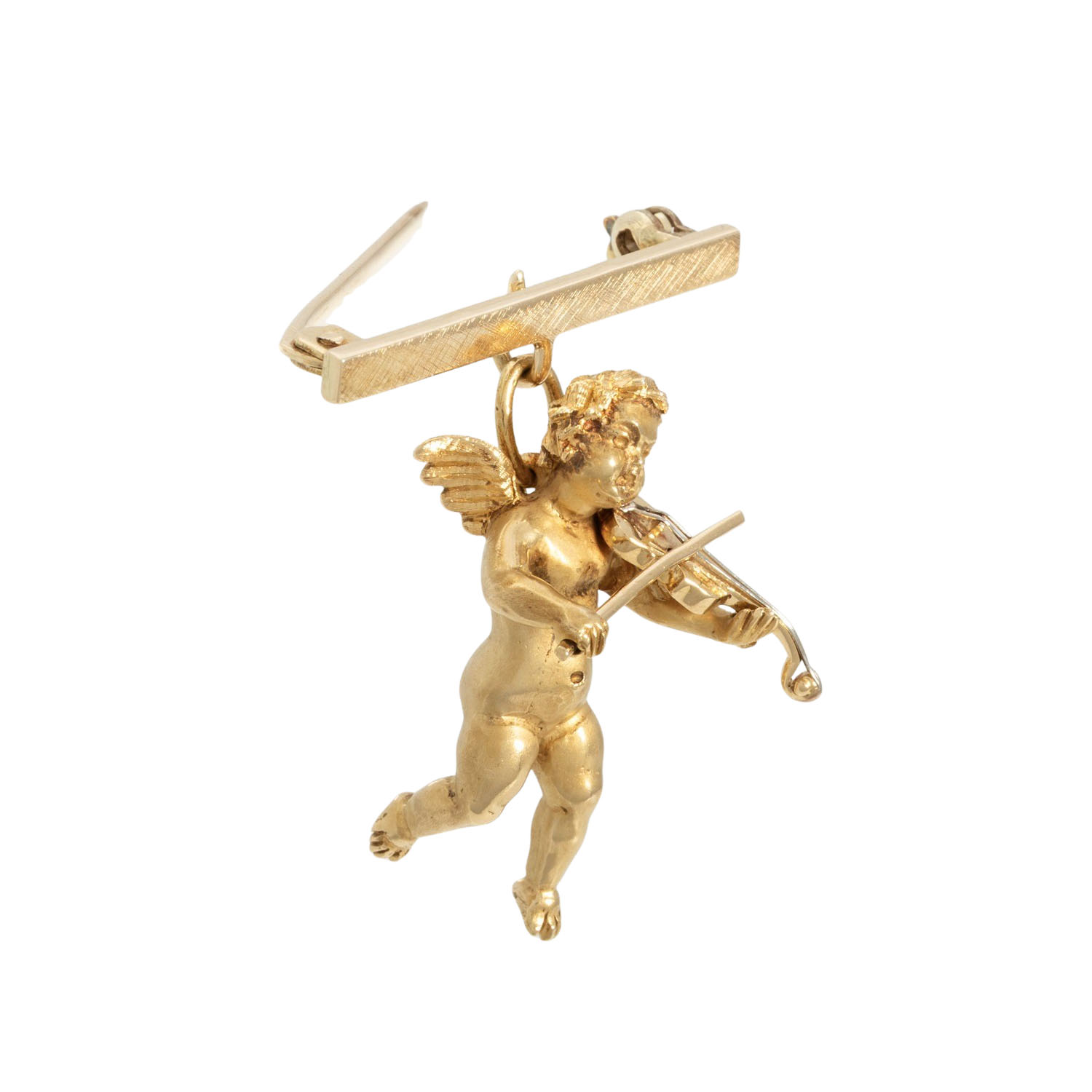 Pendant 'Putto playing the violin' fixed to brooch pin, GG, totalling 16.5 g, L x W: 31 x 36 mm, pendant 18K yellow gold, 13.8 g, L x W: 31 x 24 g, brooch 14K yellow gold, 2.7 g, L x W: 3 x 12 mm, surface line matted, ball hook, mariage, mid 20th century, minimal signs of wear.