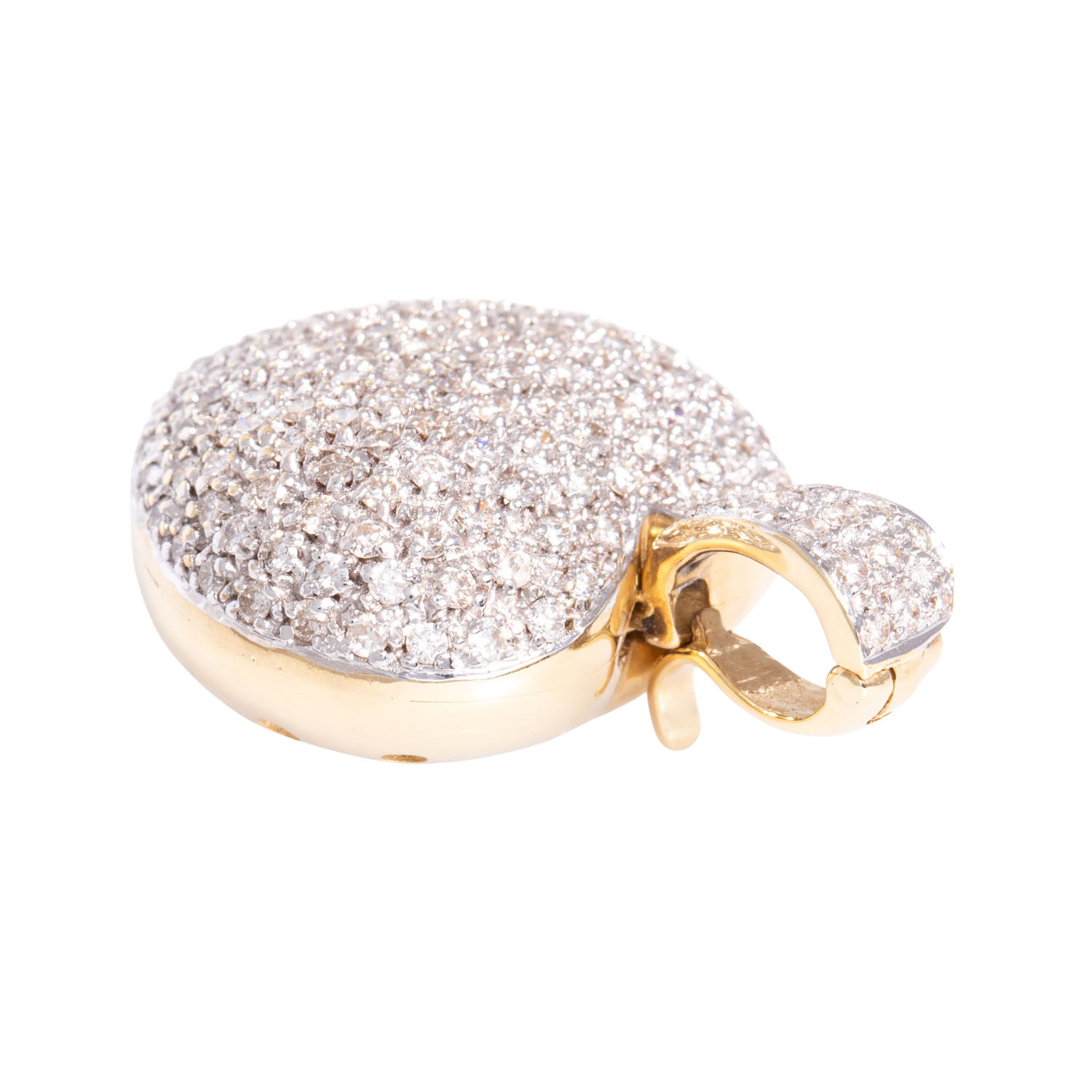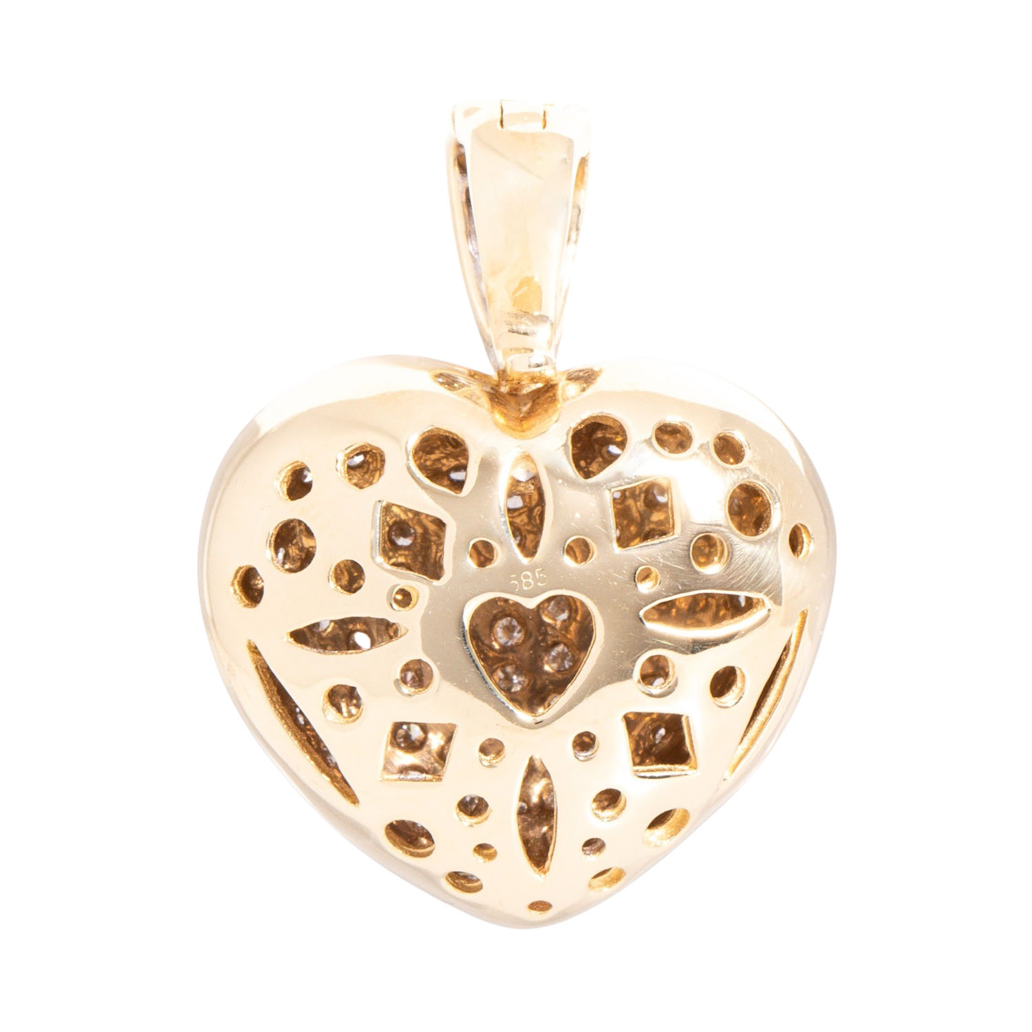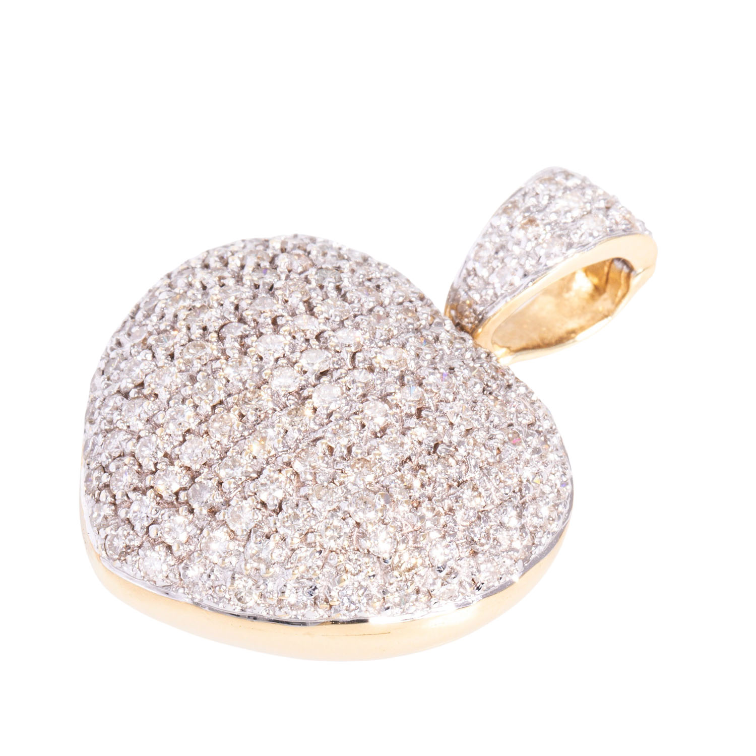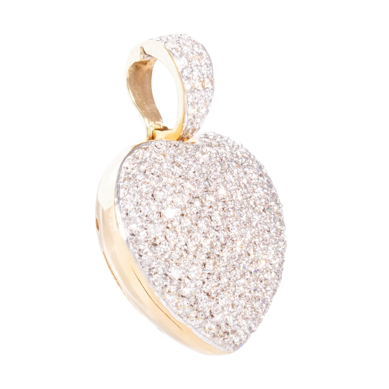 Pendant 'Heart' with numerous brilliant-cut diamonds totalling ca. 2.5 ct, medium color a. clarity, 14K YG, settings rhodium plated, 13.5 g, ca. 3.5x2.5 cm, around 2000, minor signs of wear.