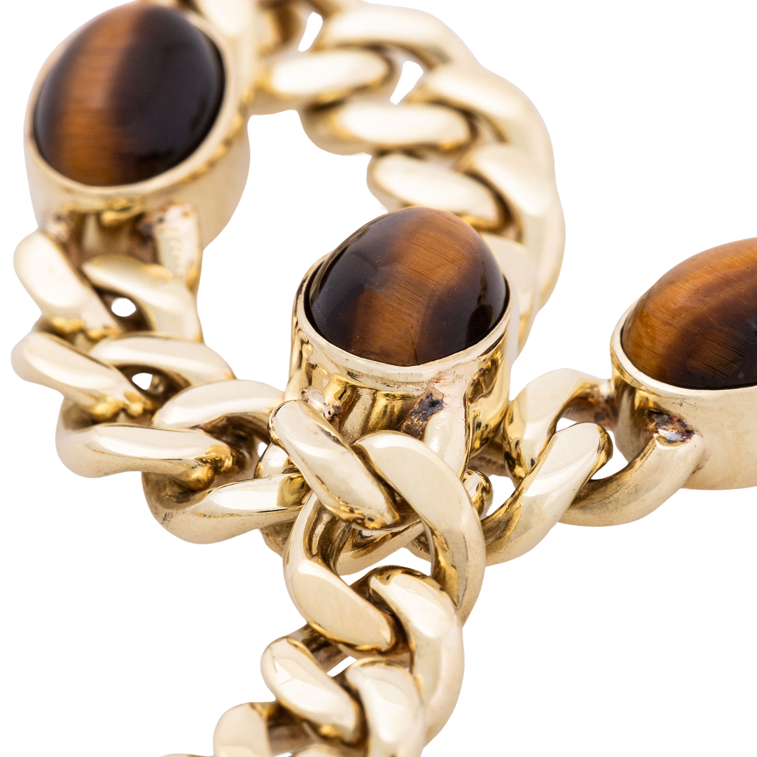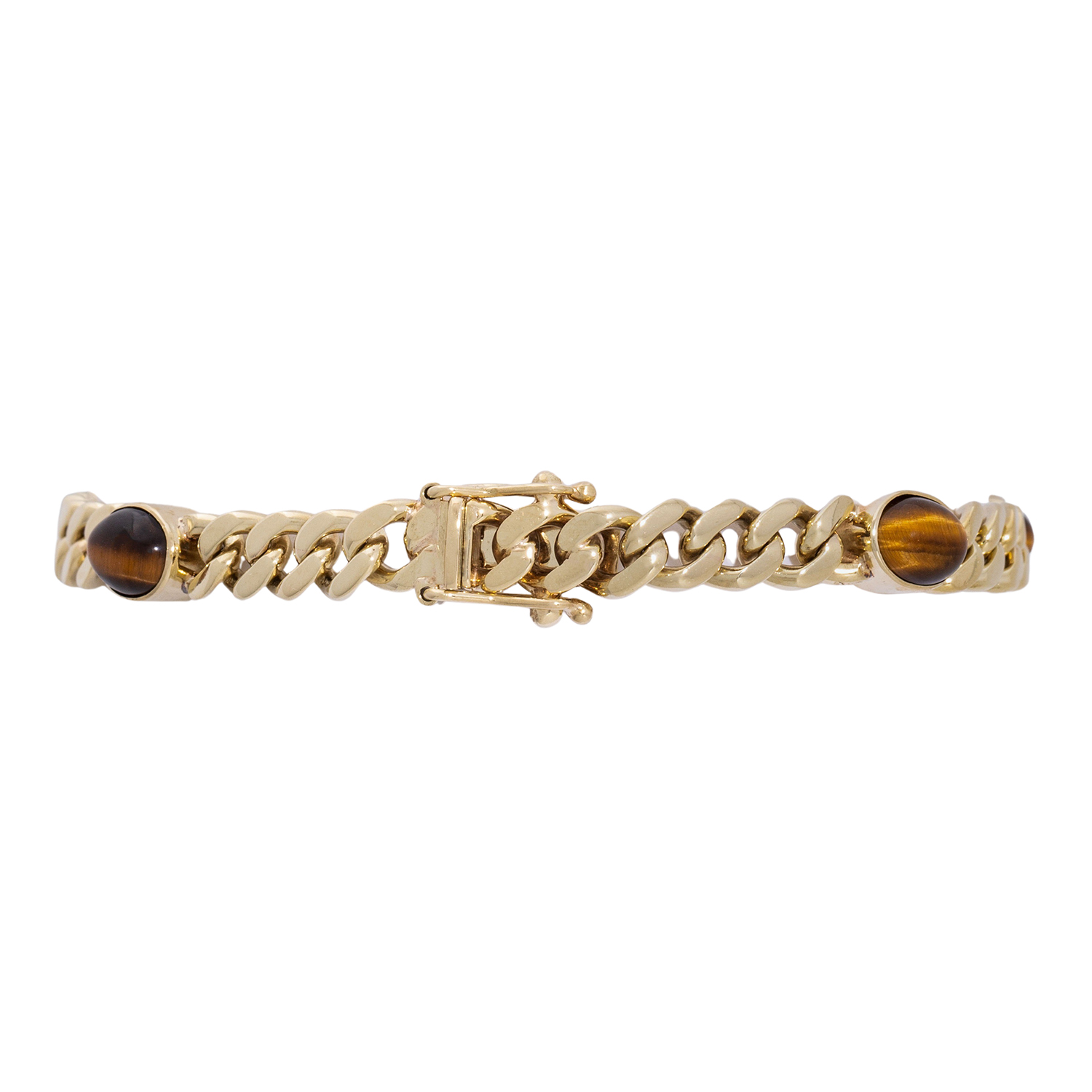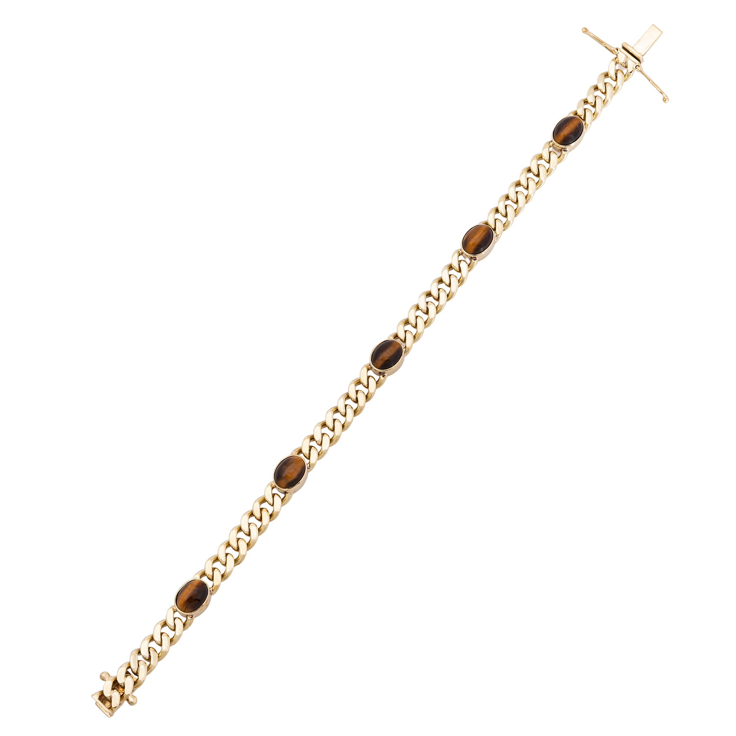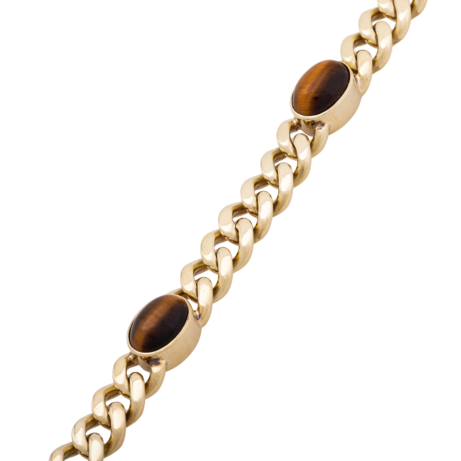 Curb link bracelet with 5 tiger eye cabochons, ca. 6 x 7.5 mm, 14K yellow gold, 22.3 g, L: ca. 19 cm, W: ca. ca. 0.6 cm, late 20th century, minimal signs of wear, box clasp with 2 safety catches.