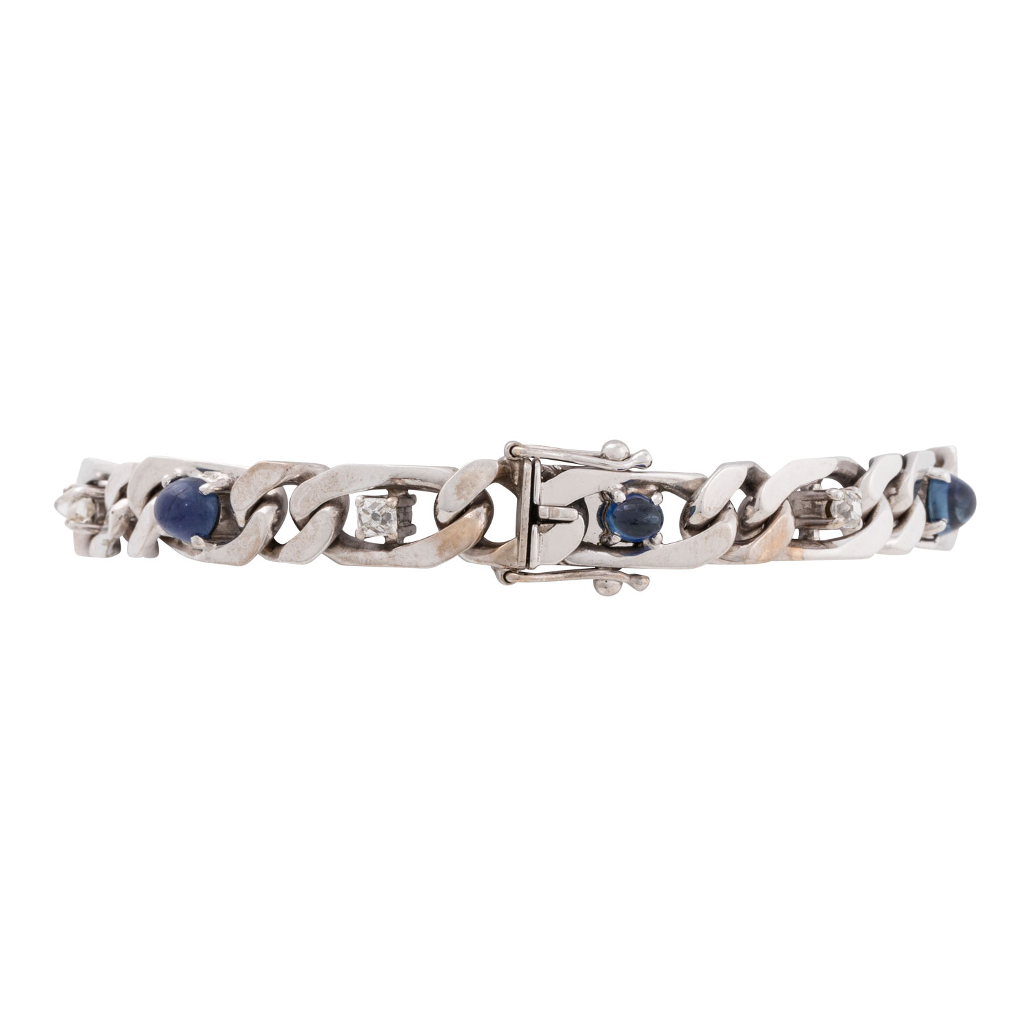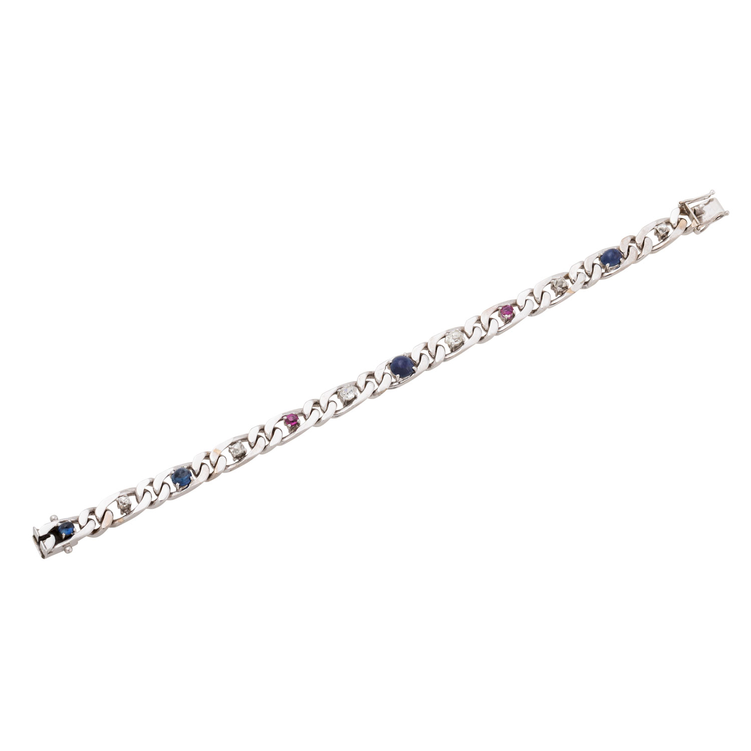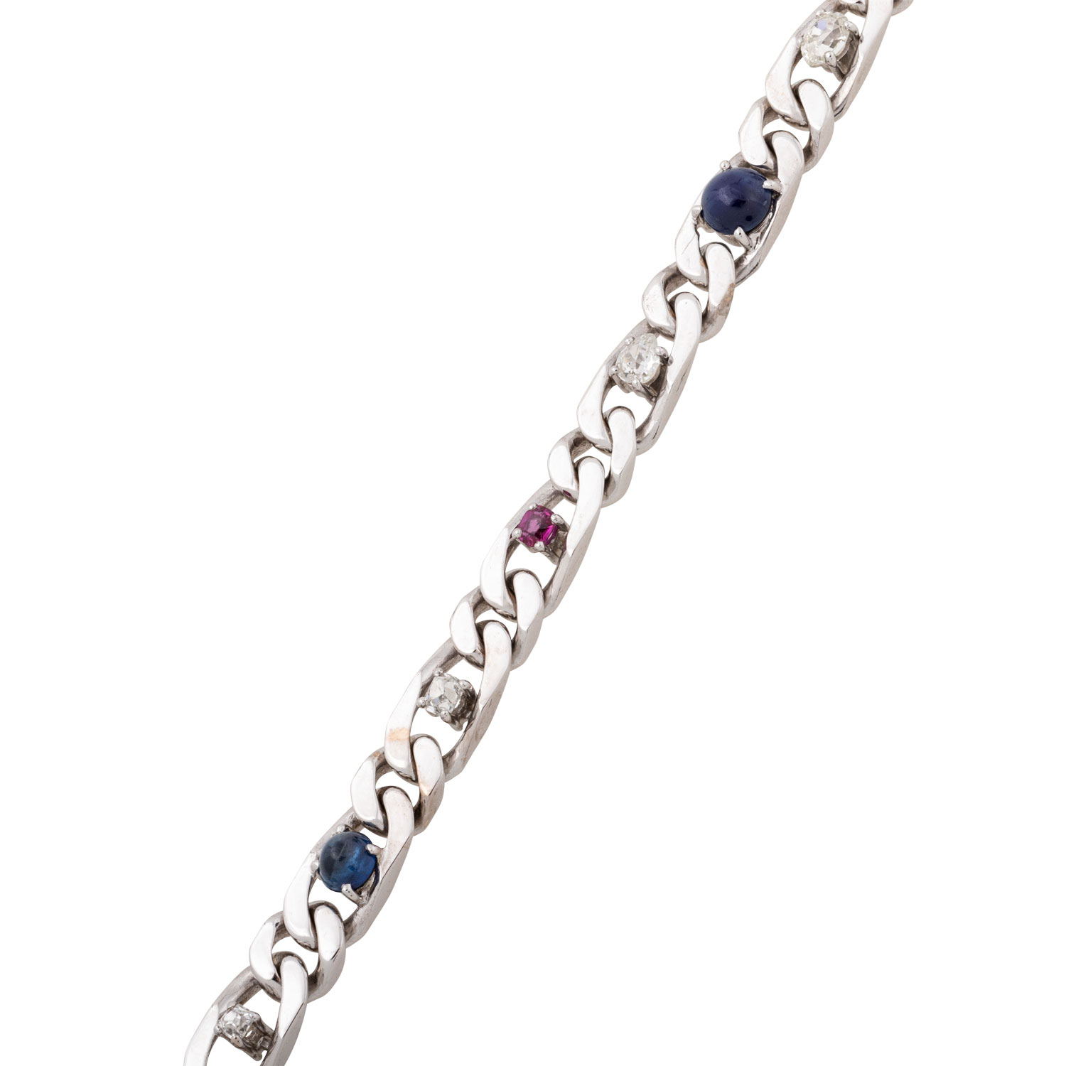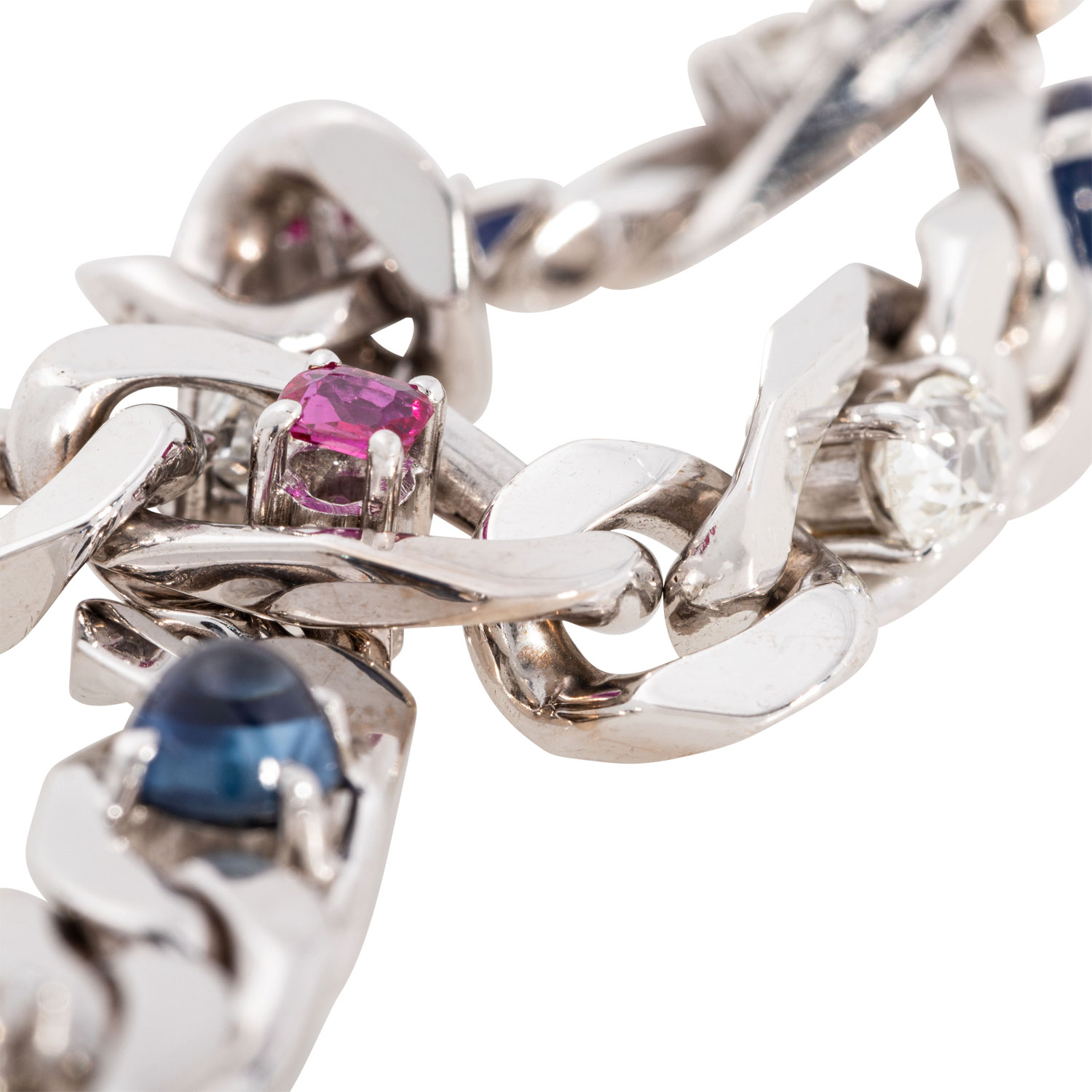 Curb link bracelet with 4 cab. sapphires, 2 faceted rubies and 6 diamonds, 2 pear-cut totalling ca. 0.46 ct, 4 table-cut totalling ca. 0.45 ct, ca. WHITE-TW (H-K)/SI-P1, partly with chipped/broken., round- and oval-cut sapphires, D: ca. 4 - 5.6 mm, oval-cut rubies, ca. 3.3 x 2.7 mm, 18K white gold, 31.7 g, L: ca. 19 cm, W: ca. 7.5 mm, end of 20th century, signs of wear, rhodium plating stained.