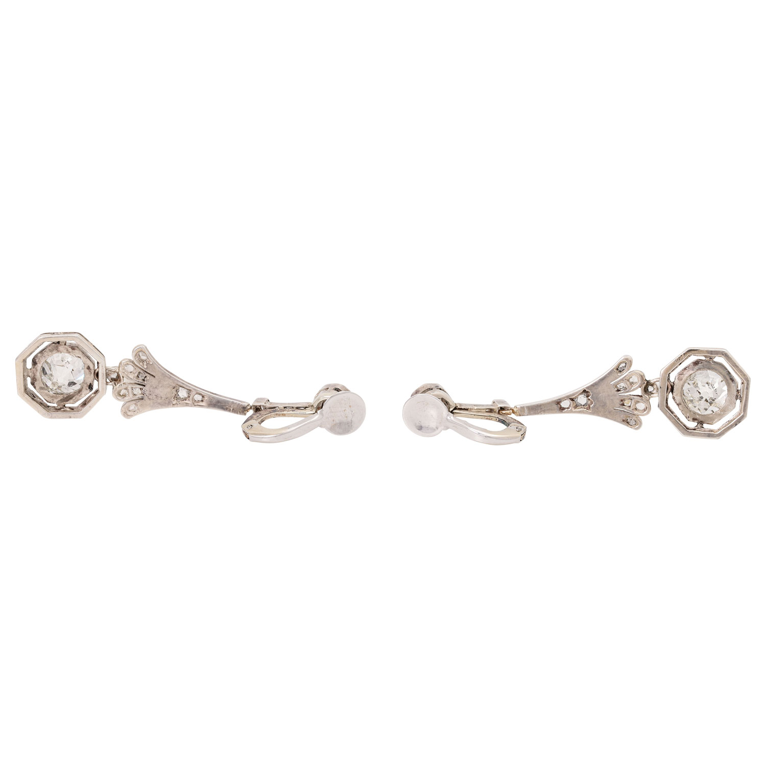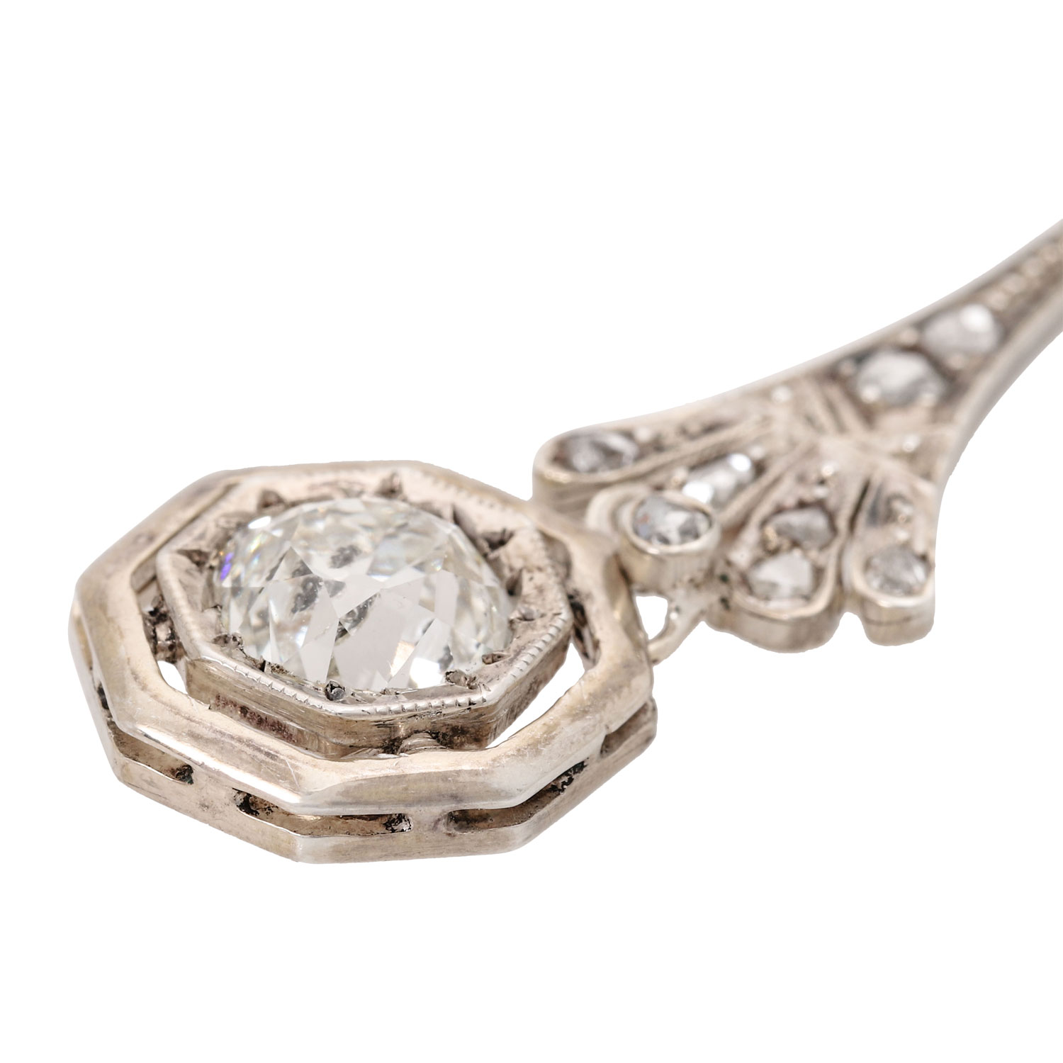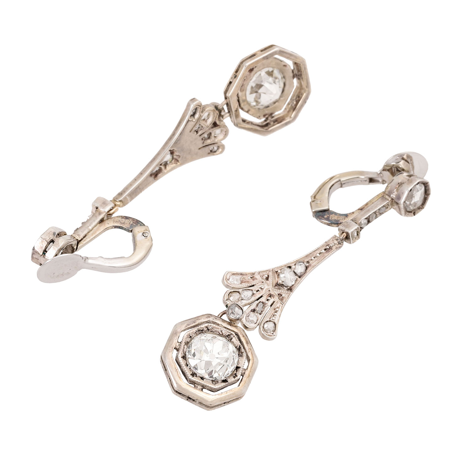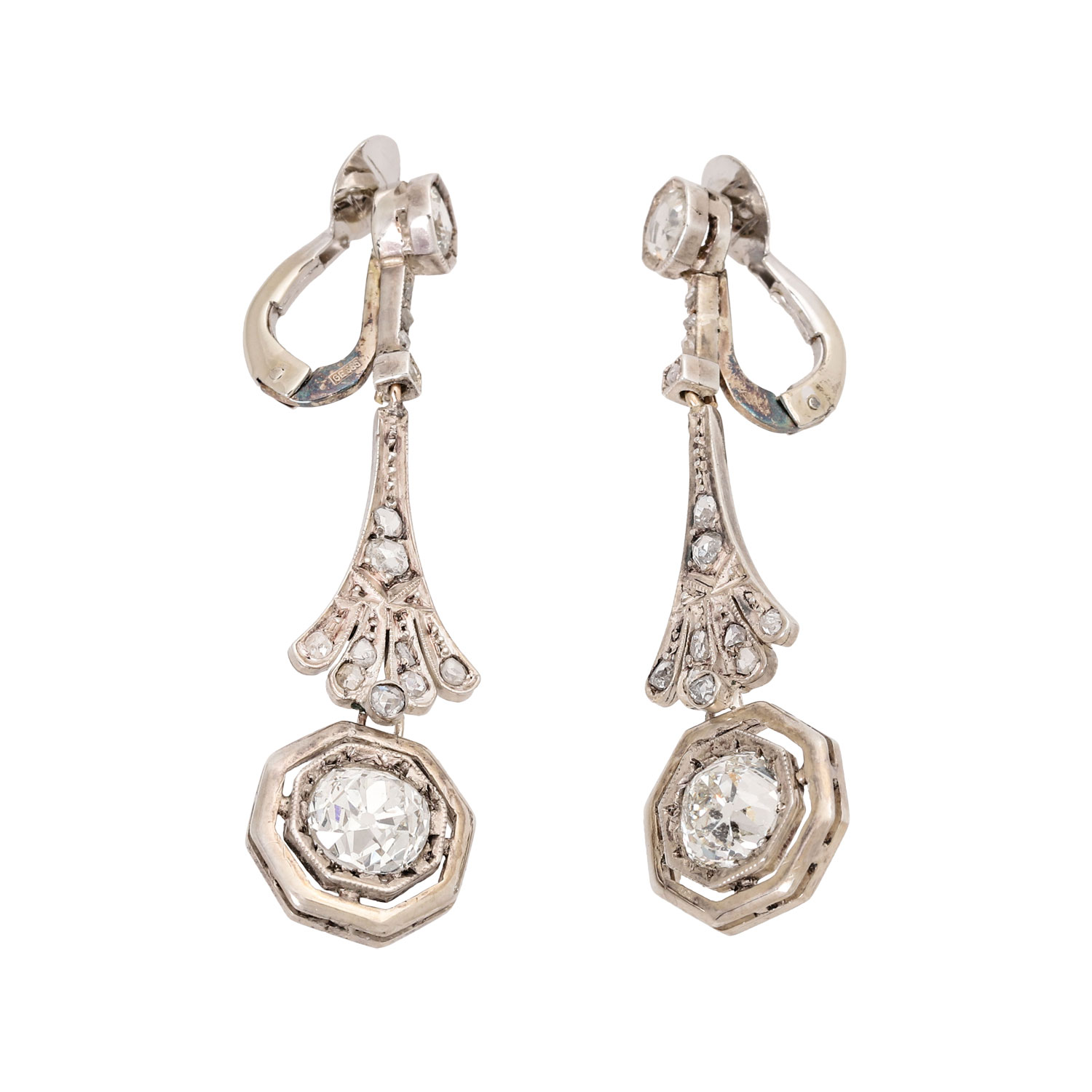 Pair of ear hangers with old-european-cut diamonds, 2 large stones of ca. 1.5+1.6 ct each, ca. STW (J)/SI2-P1, further rose-cut diamonds totalling ca. 0.50 ct, pendants silver, clips 14K WG, 7.3 gr, L: ca. 4.5 cm, 1st half 20th century, signs of wear, incl. case. Pendants should be re-affixed.