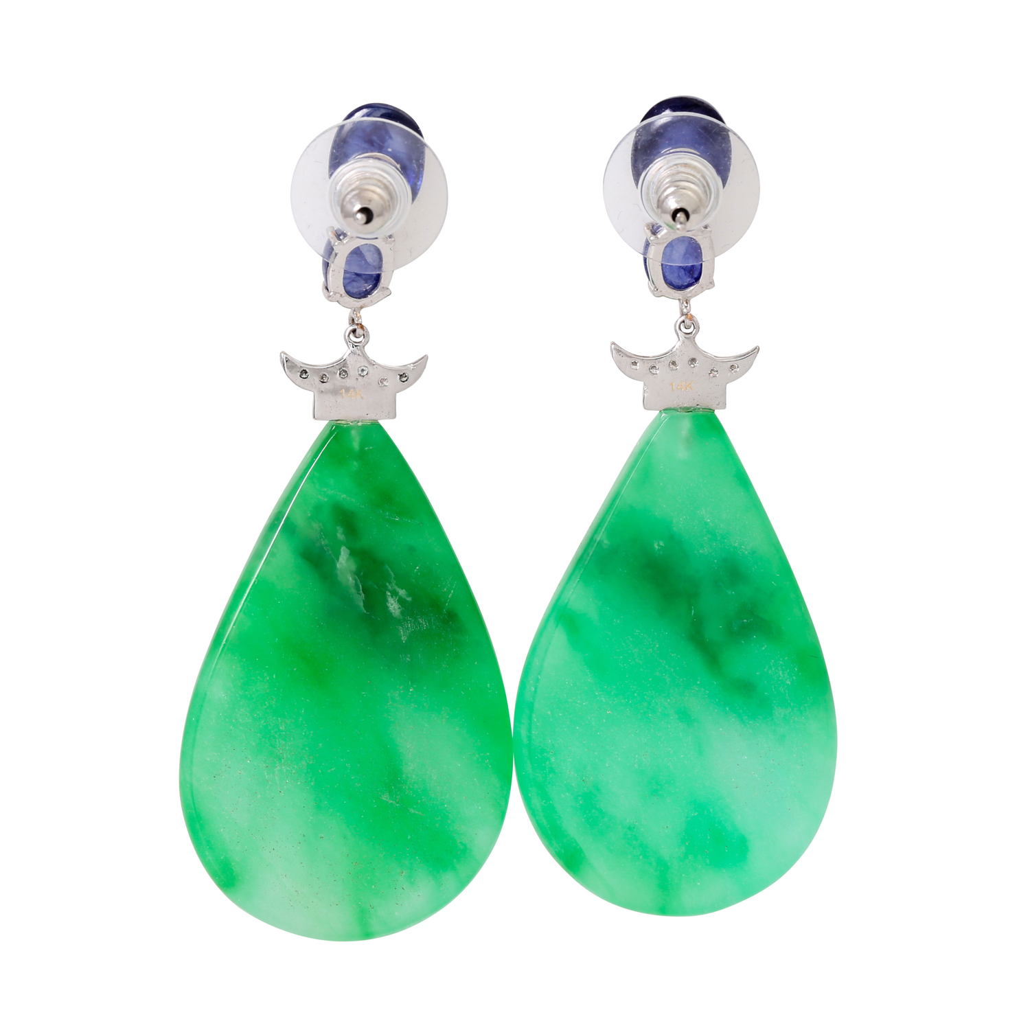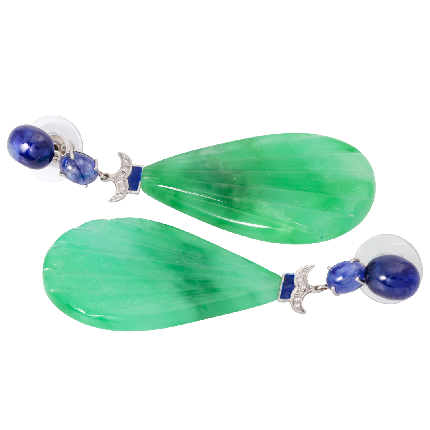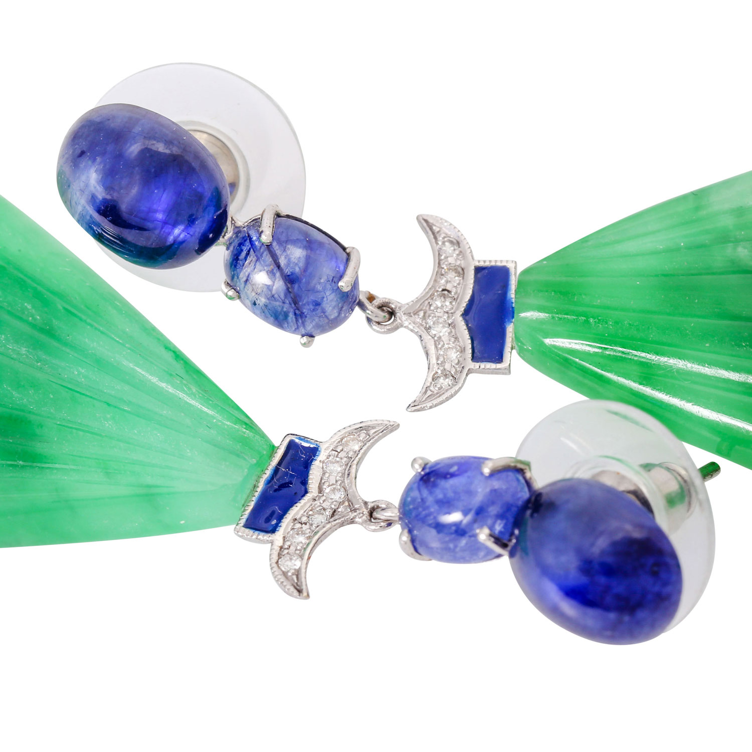 Pair of pendant earrings with sapphire cabochon, 12 brilliant-cut diamonds ca. 0,20 ct. W/VSI and 2 jade drops, partially enamelled, WG 145K, 23.4g, l: 6.5cm, 21st century, good condition. Ear nut with silicone and stainless steel.