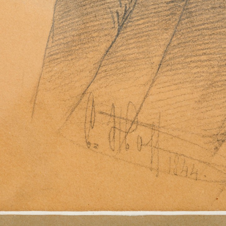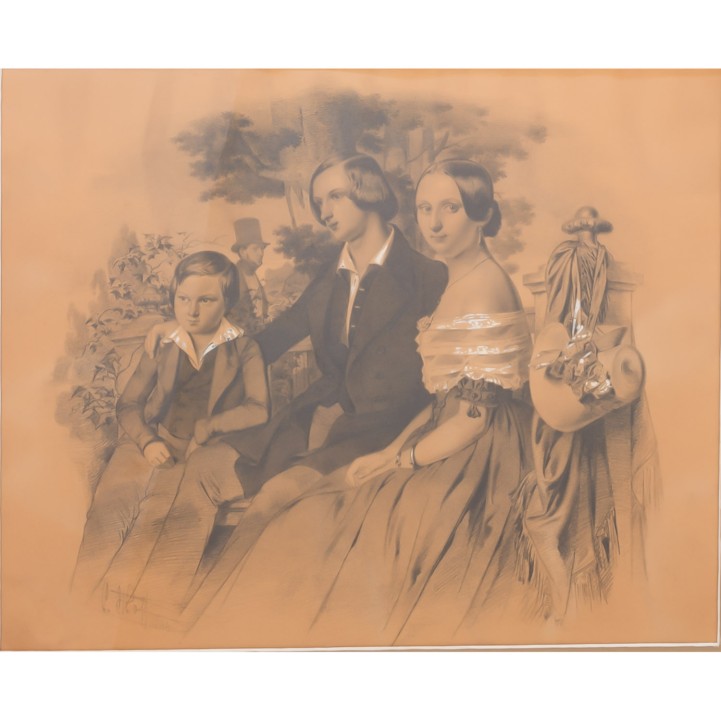 1 x sibling portrait, pencil drawing, partly heightened in white, signed in 1844, label on the reverse “Louis Raht kgl. Hofkunsthandlung Stuttgart” and handwritten note “ Mathilde Büttner, geb. Breden, mother of Elise Peterssen, née Büttner (Uta), Theodor Breden (center), (...) Koblenz, Adelmar Breden (left), former cavalry captain Vienna, mayor Breden (background) Celle”, dimensions with frame 95 x 88 cm.