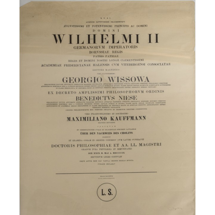 1 x certificate from the Friedrichs University of Halle on the award of the doctorate to Maximilian Kauffmann in May 1909, framed behind glass, dimensions in frame approx. 70 x 50 cm;
