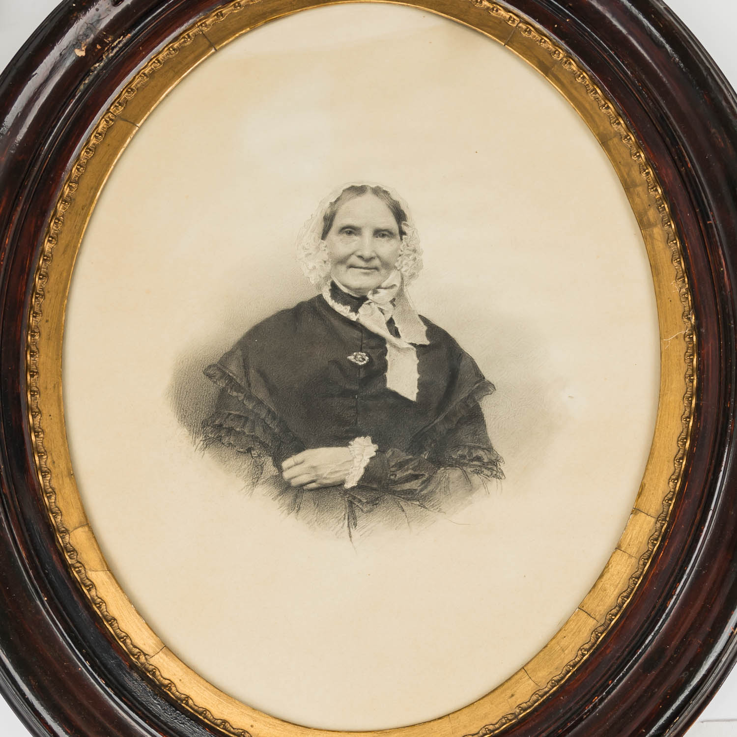1 x lithograph of an elderly lady 19th century, note on the reverse: “Mrs. Major Lüderitz from Celle (Prov. Hannover), great-grandmother of Elise Petersen née Büttner (Uta!)”, in a round frame, diameter approx. 60 x 40cm.