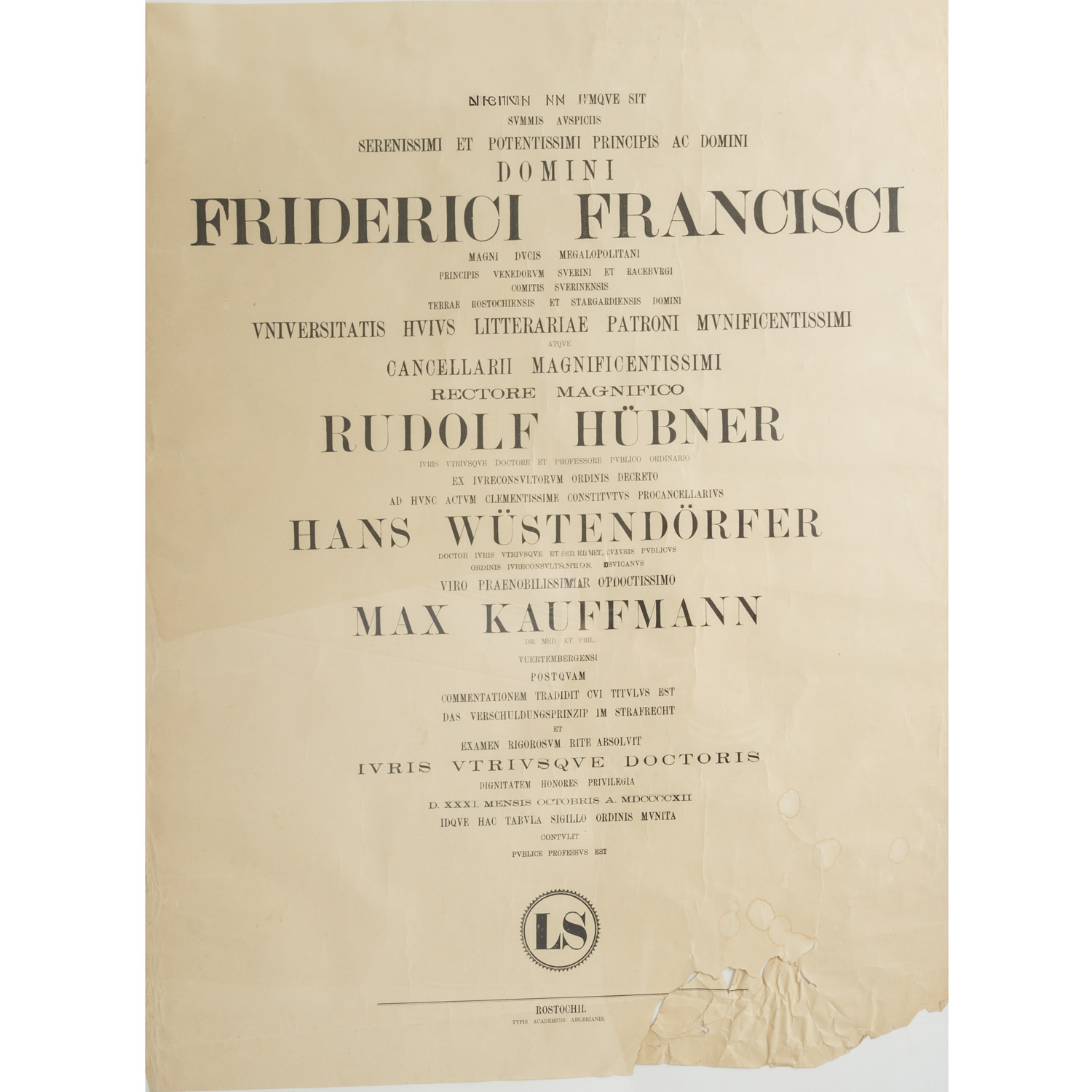 1 x certificate of the award of the doctorate to Max Kauffmann in October 1912 in Rostock”, dimensions with frame approx. 75 x 55 cm;
