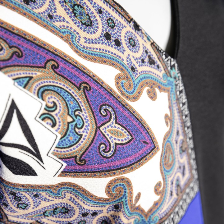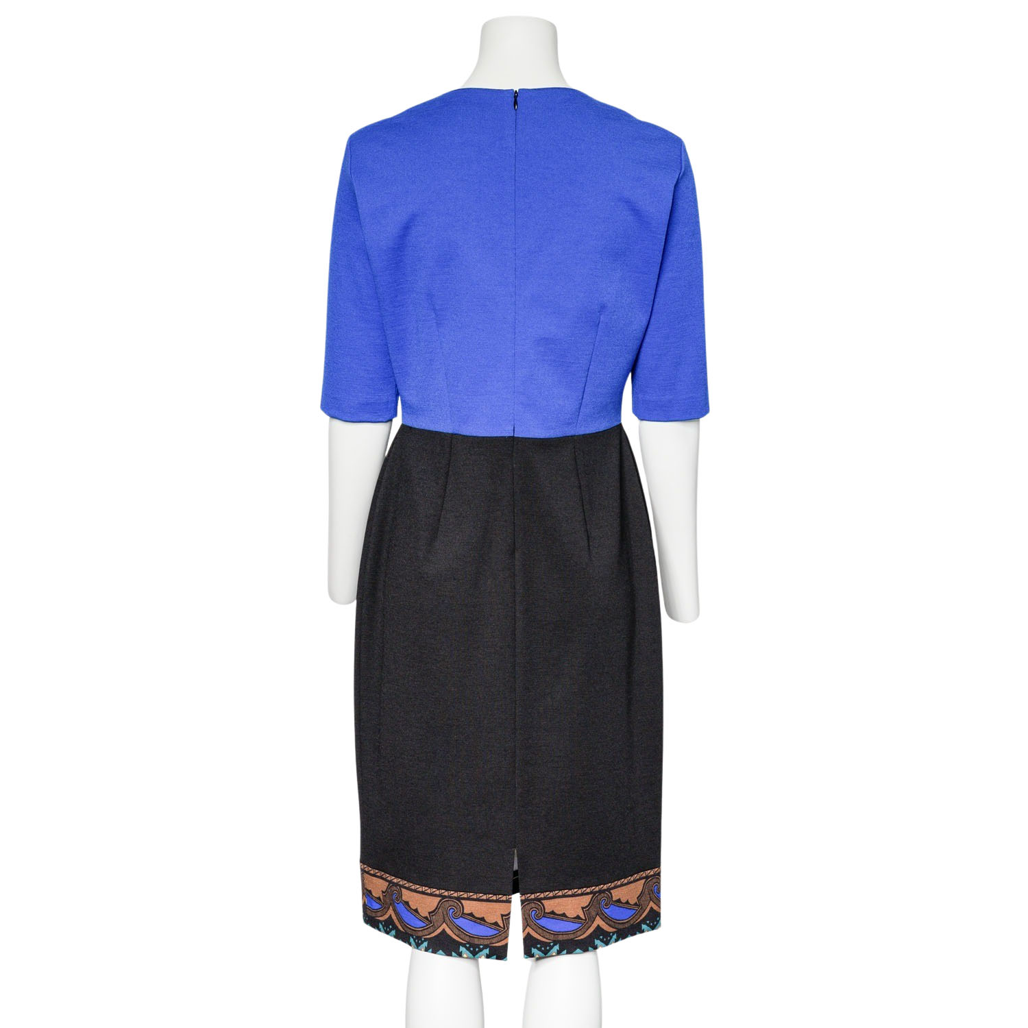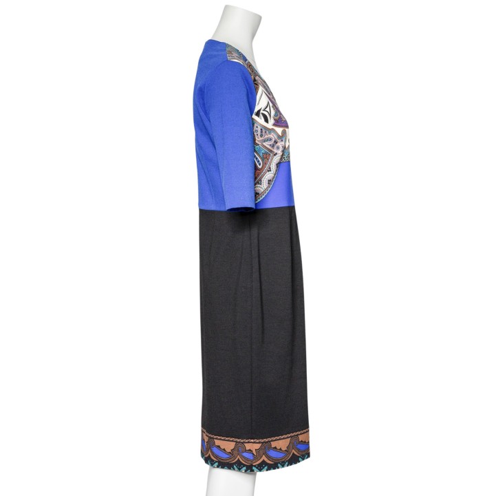 ETRO dress, size 40. Elasticated model in black and royal blue with decorative paisley detail, V-neck, zip at the back and three-quarter sleeves.