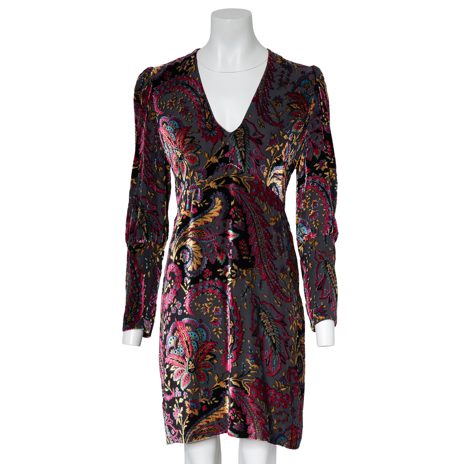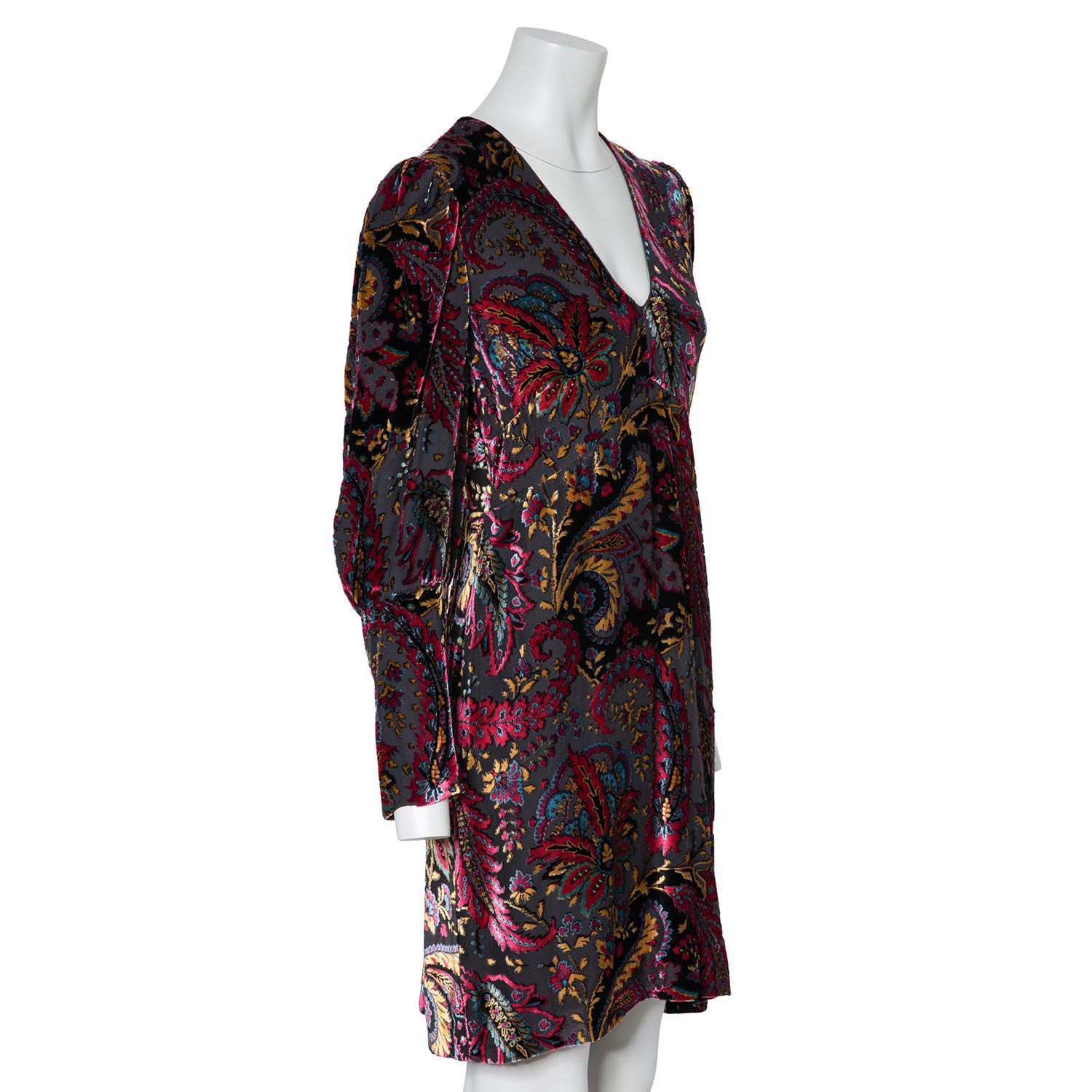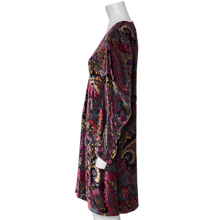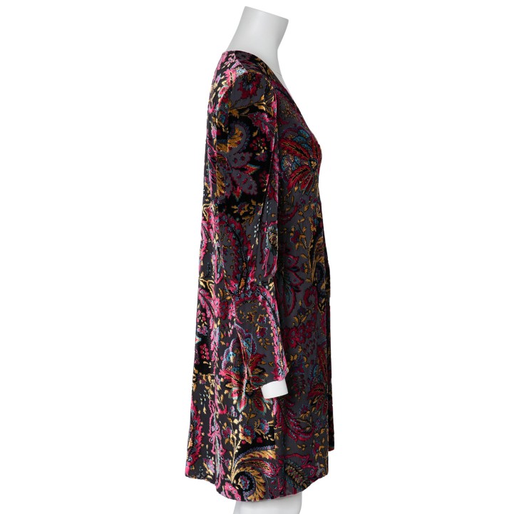 ETRO dress, size approx. 38. Burnout fabric with floral paisley design, wide cuffs and deep V-neck. Zipper in the side seam. Signs of wear, laundry label removed.