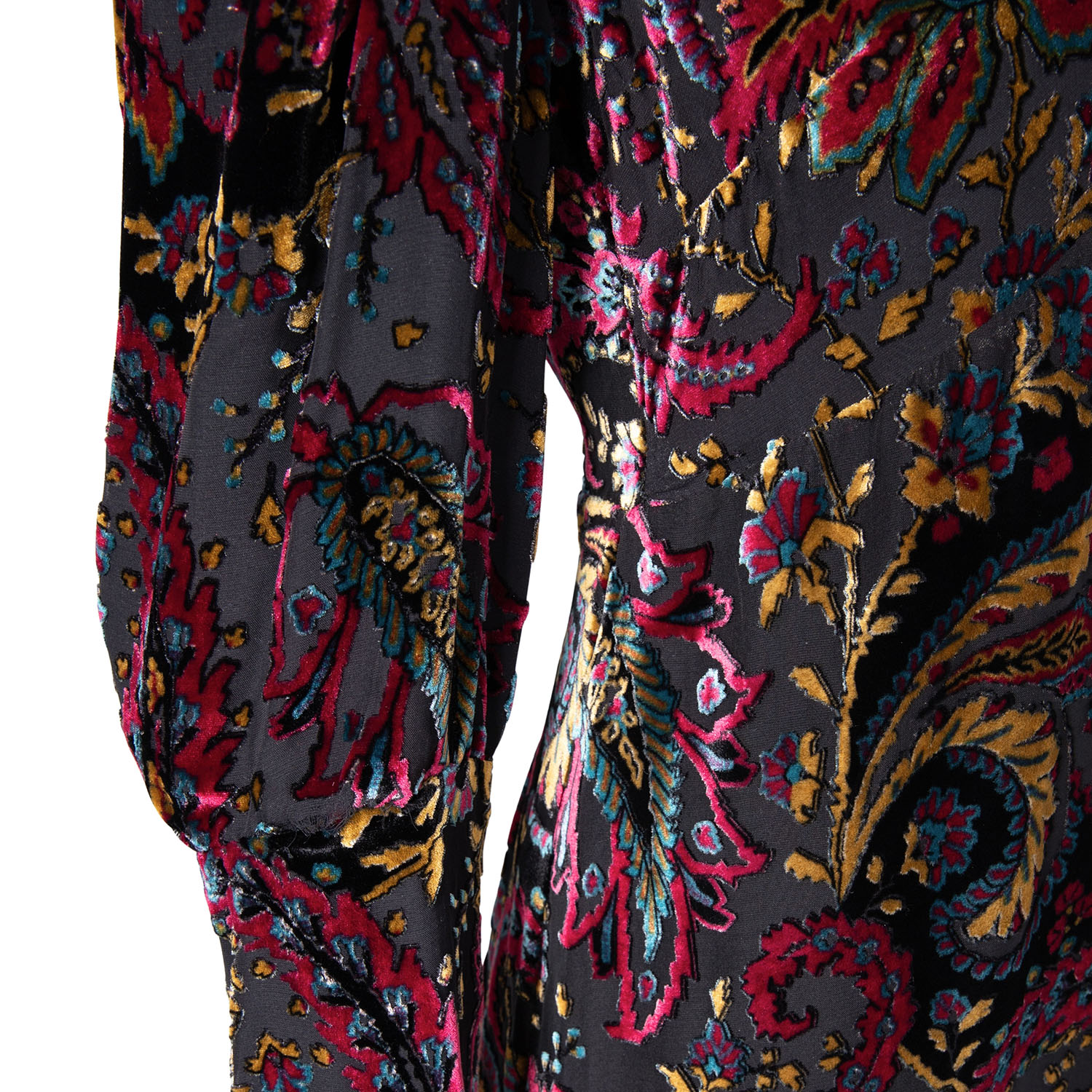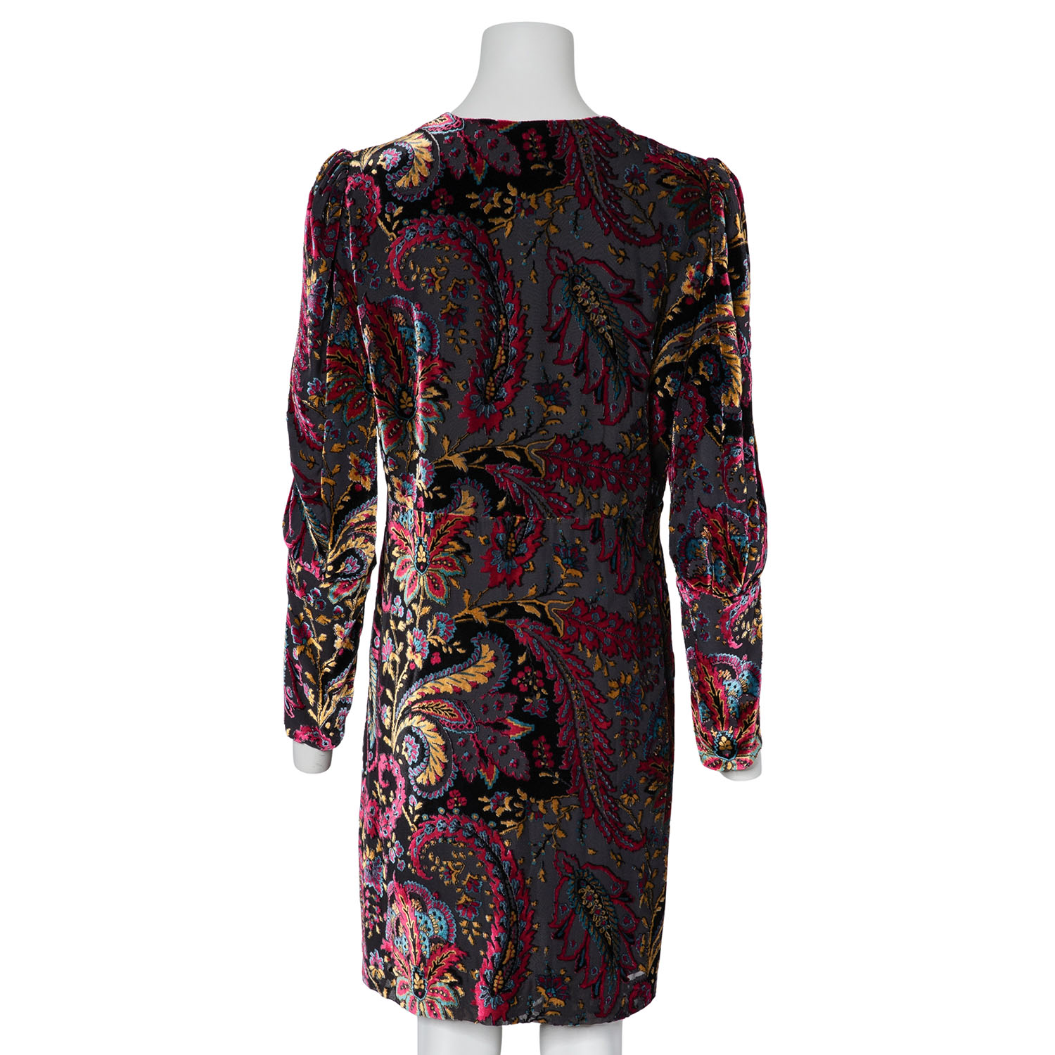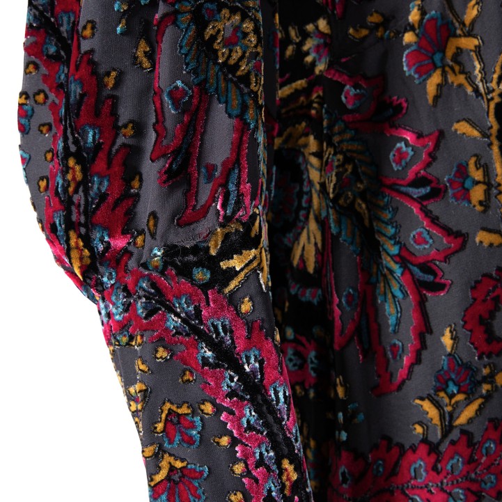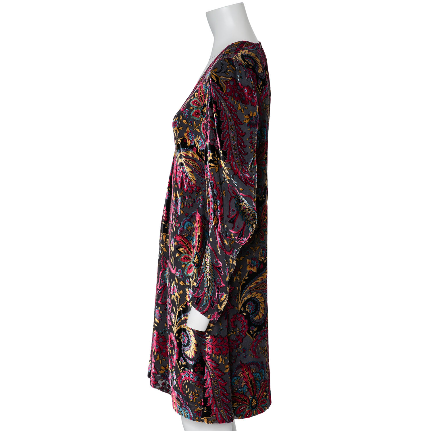 ETRO dress, size approx. 38. Burnout fabric with floral paisley design, wide cuffs and deep V-neck. Zipper in the side seam. Signs of wear, laundry label removed.