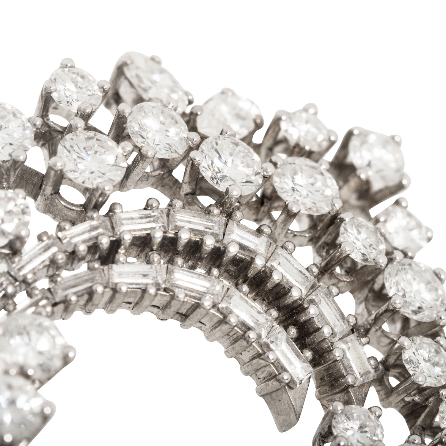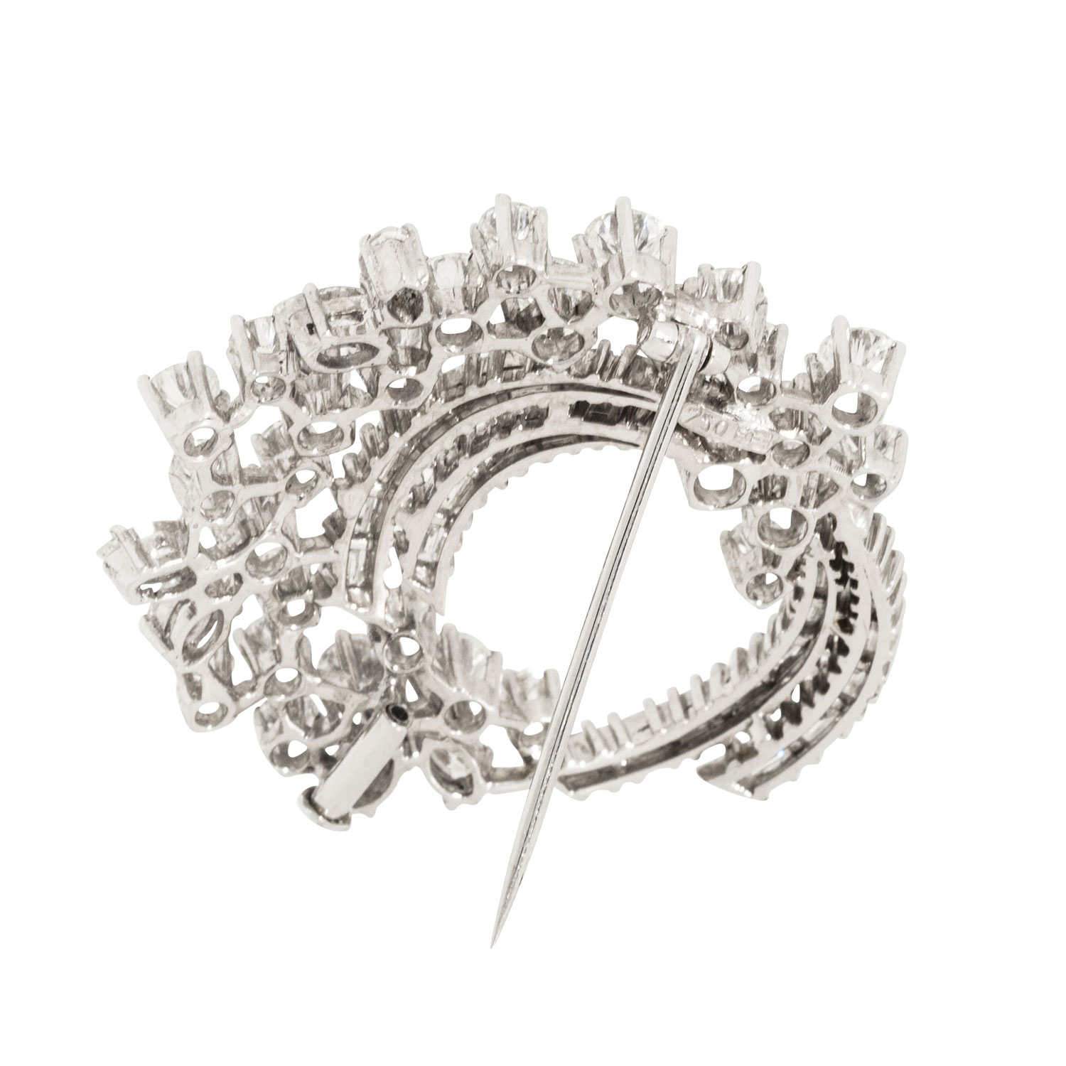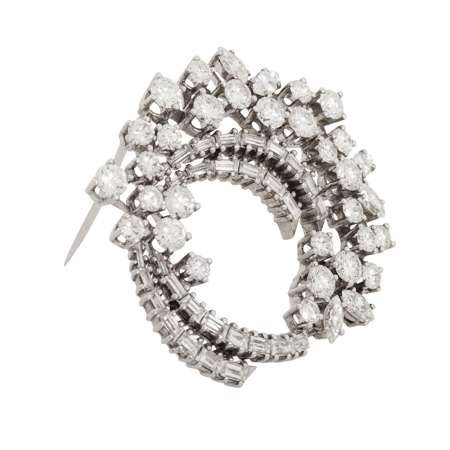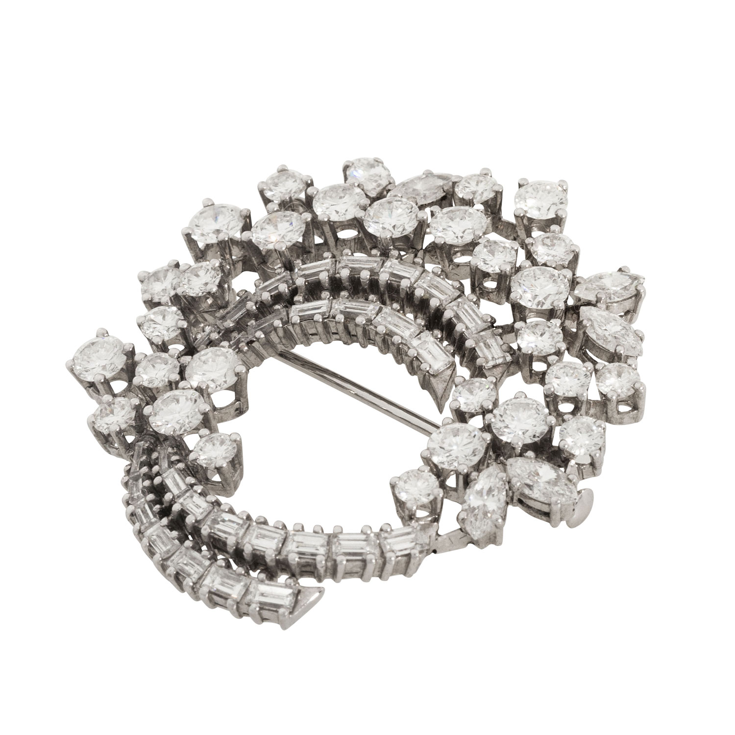 EUGEN THEODOR HIRNER. Brooch with 49 diamonds, totalling ap. 8,0 ct, brilliant-cut, baguette-cut, navette-cut, FW-STW (F-J)/VVS-VS, 18K white gold, 12.6 g, L x W: ap. 40 x 36 mm, slide clasp, 2nd half of 20th century, minimal signs of wear, High jewelry craftsmenship.