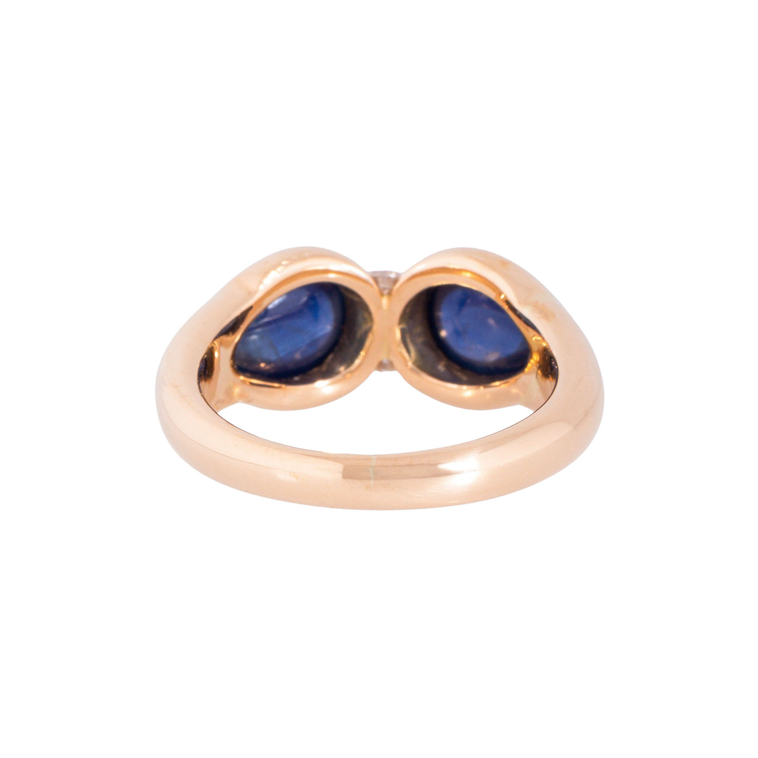 EUGEN THEODOR HIRNER ring with 2 fine sapphire cabochons and 3 brilliant-cut diamonds totalling approx. 0.12 ct, RW (F-G)/VS, pear-cut sapphires approx. 7.5 x 5.5 mm, 18K yellow gold, 6.6 g, ring size: 51, W: approx. 2.9 - 7.9 mm, late 20th century, minimal signs of wear, with hallmark 'ETH'.