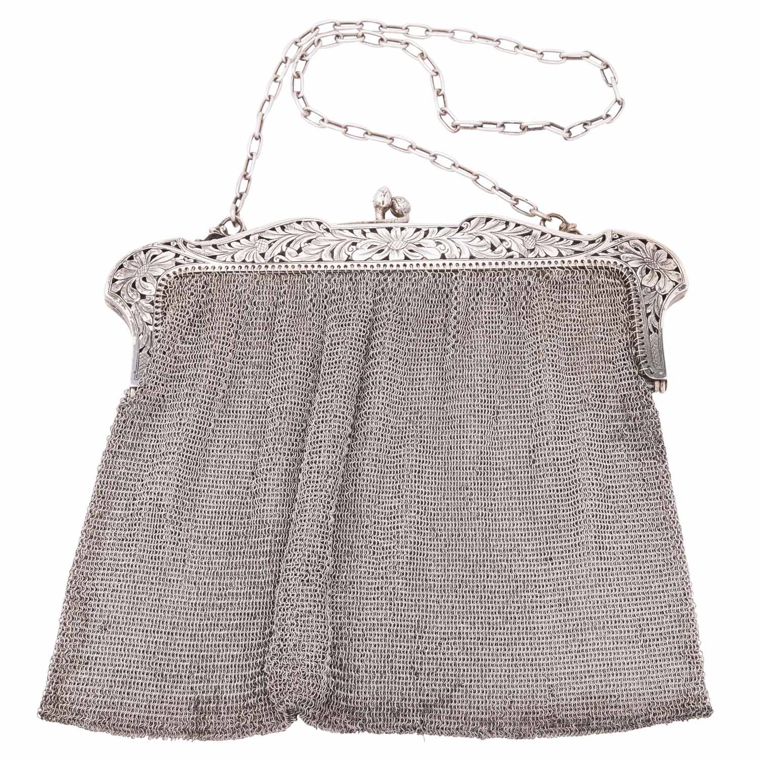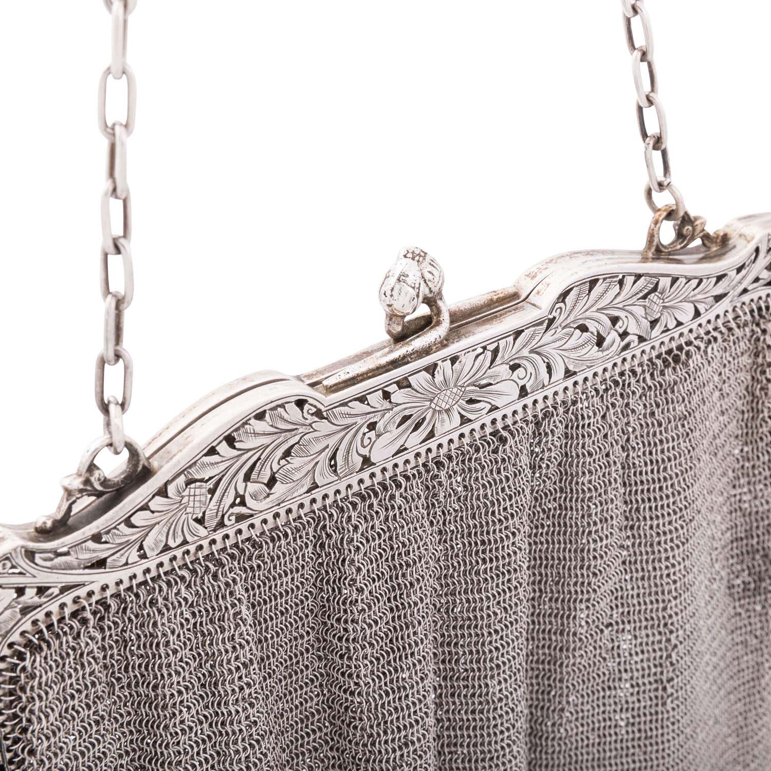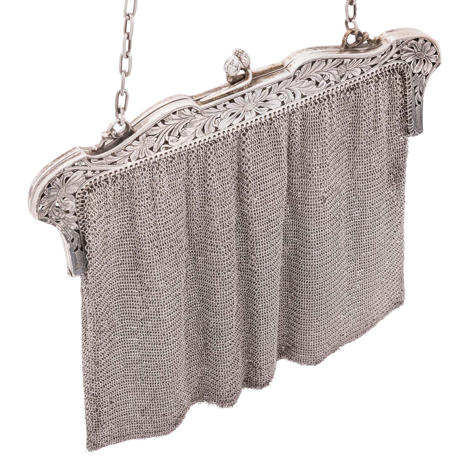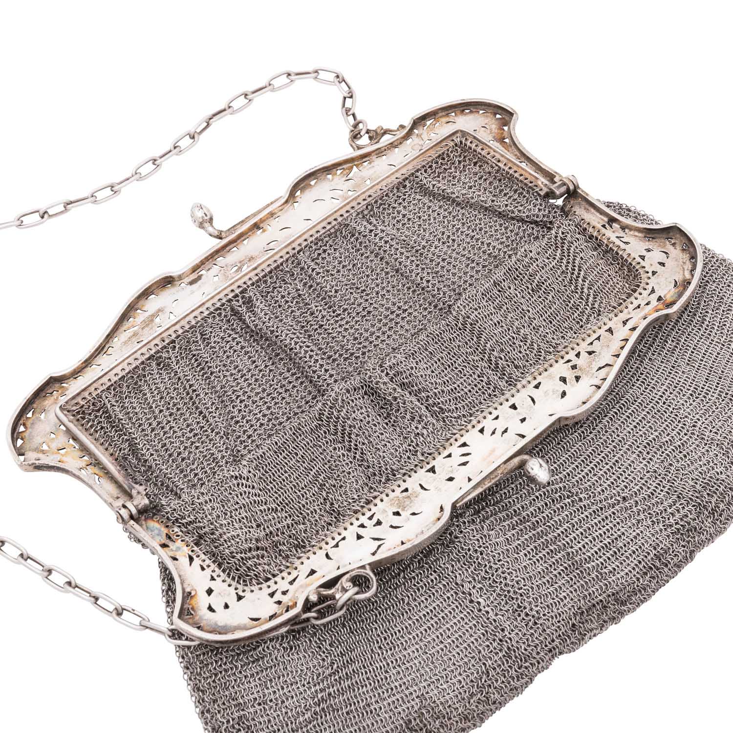 Evening pouch, silver, 406.6 g, 19x18 cm, signs of wear and oxidations, should partly be fixed new, no sale under silver price.