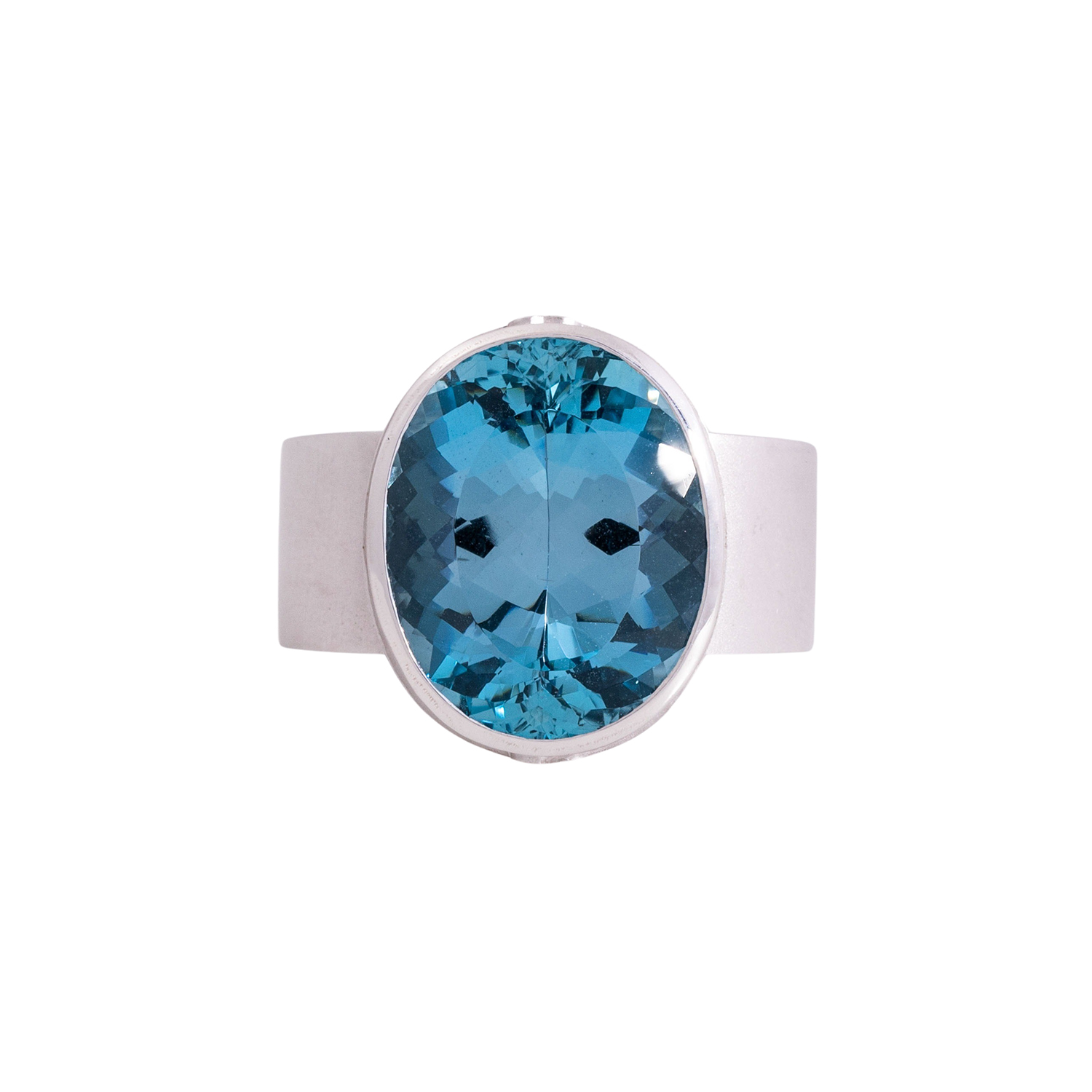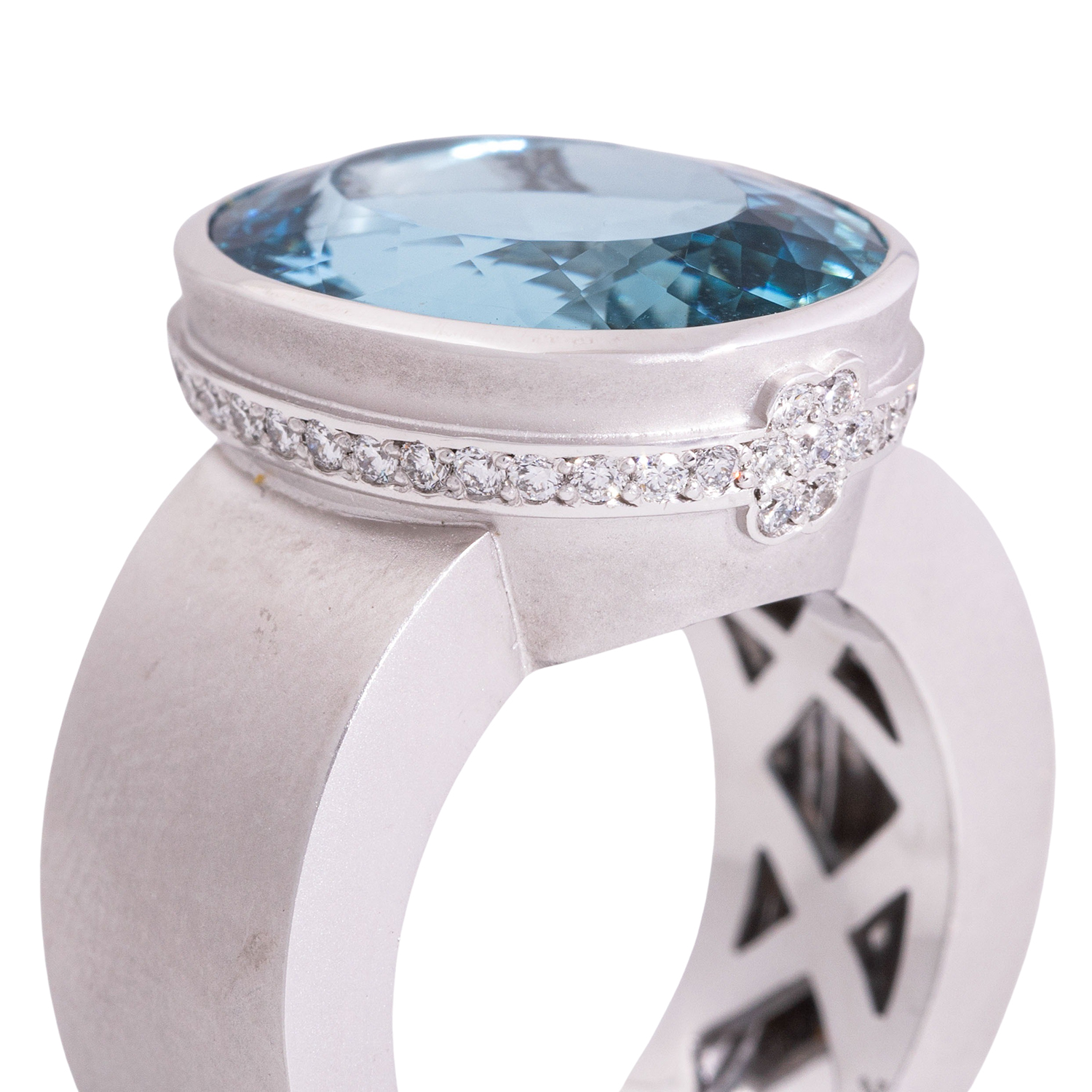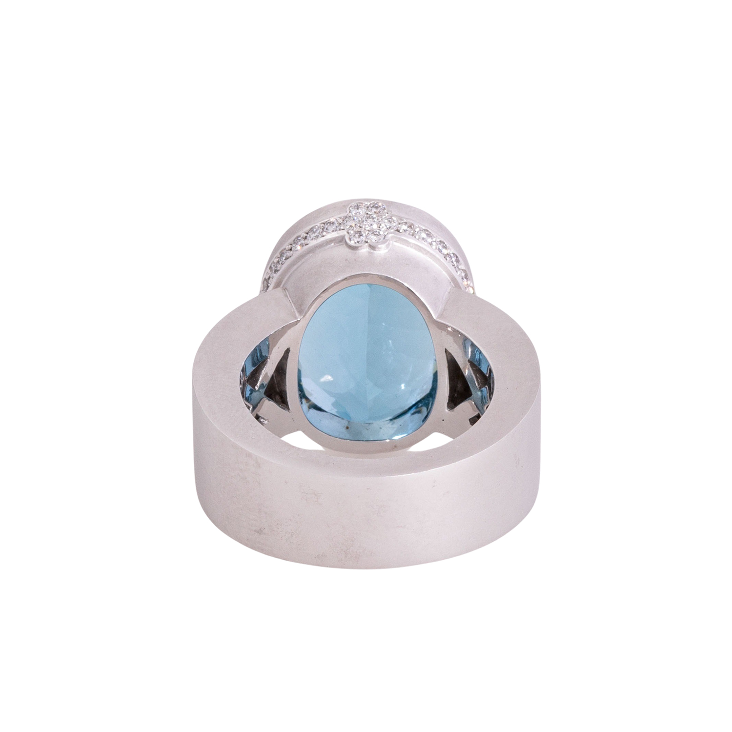 Exclusive Ring with aquamarine ca. 12.93 ct and brilliant cut diamonds totalling ca. 0.43 ct, RW (G)/ IF, WG 18K, 25.3 g, ring size 52, 21st century, very good condition, high quality goldsmith work.