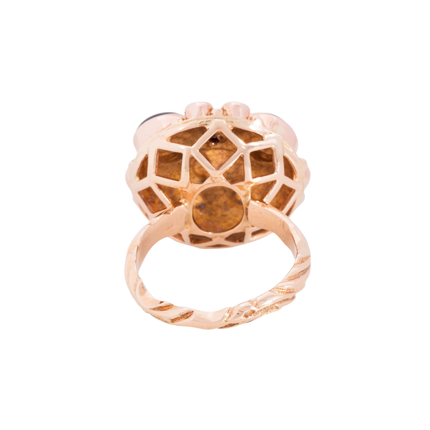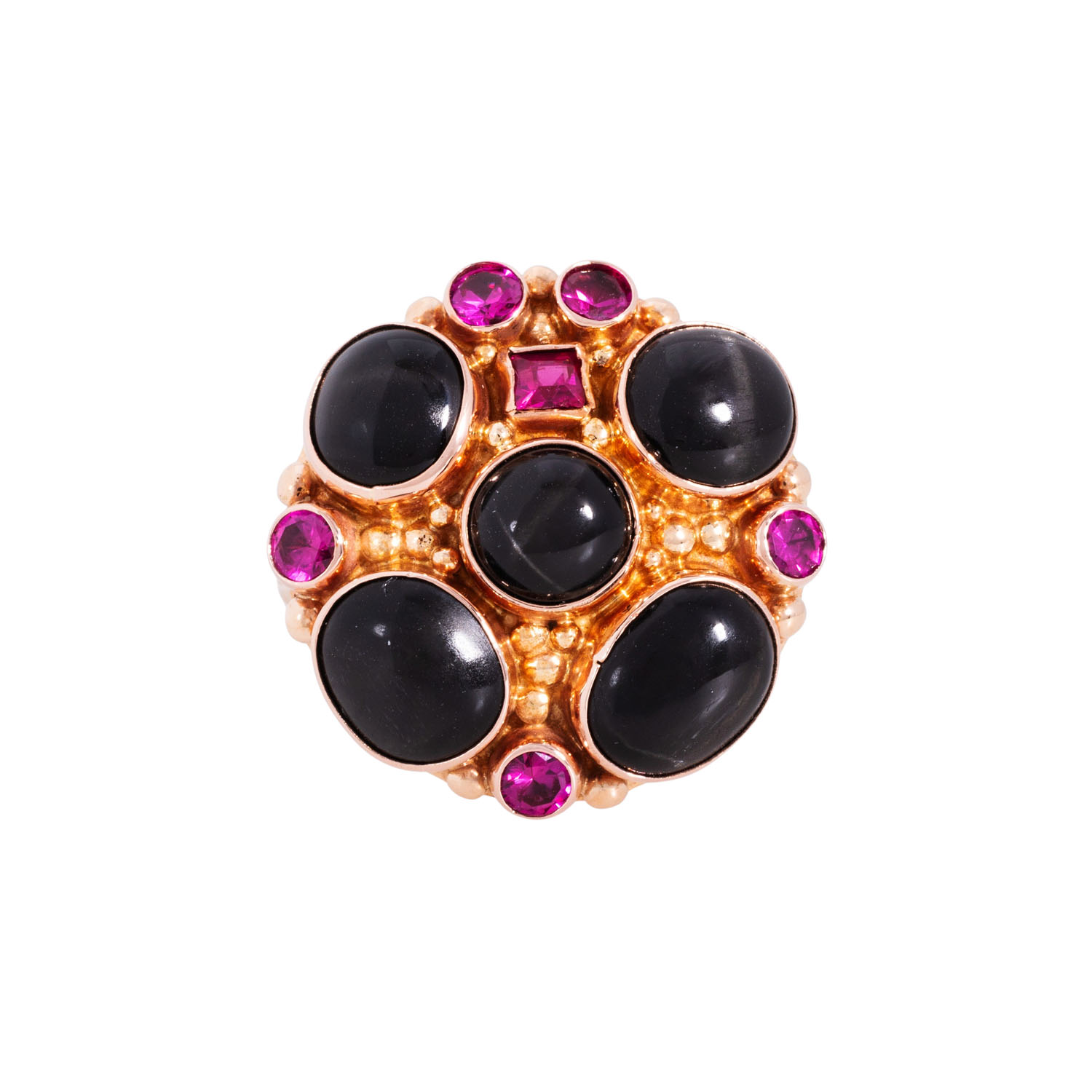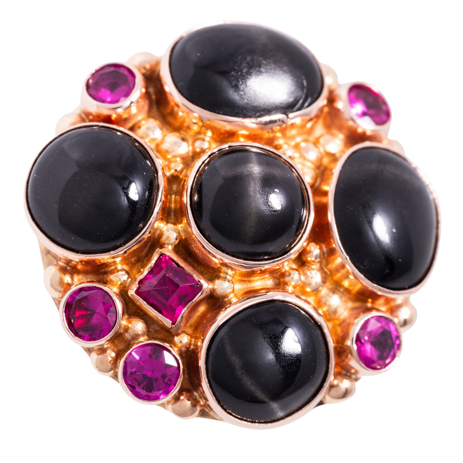 Exceptional ring with 5 black star sapphires and 6 small red synthetic gemstones, 14K rose gold, 9.3 g, ring size 57, 20th/21st century, good condition.