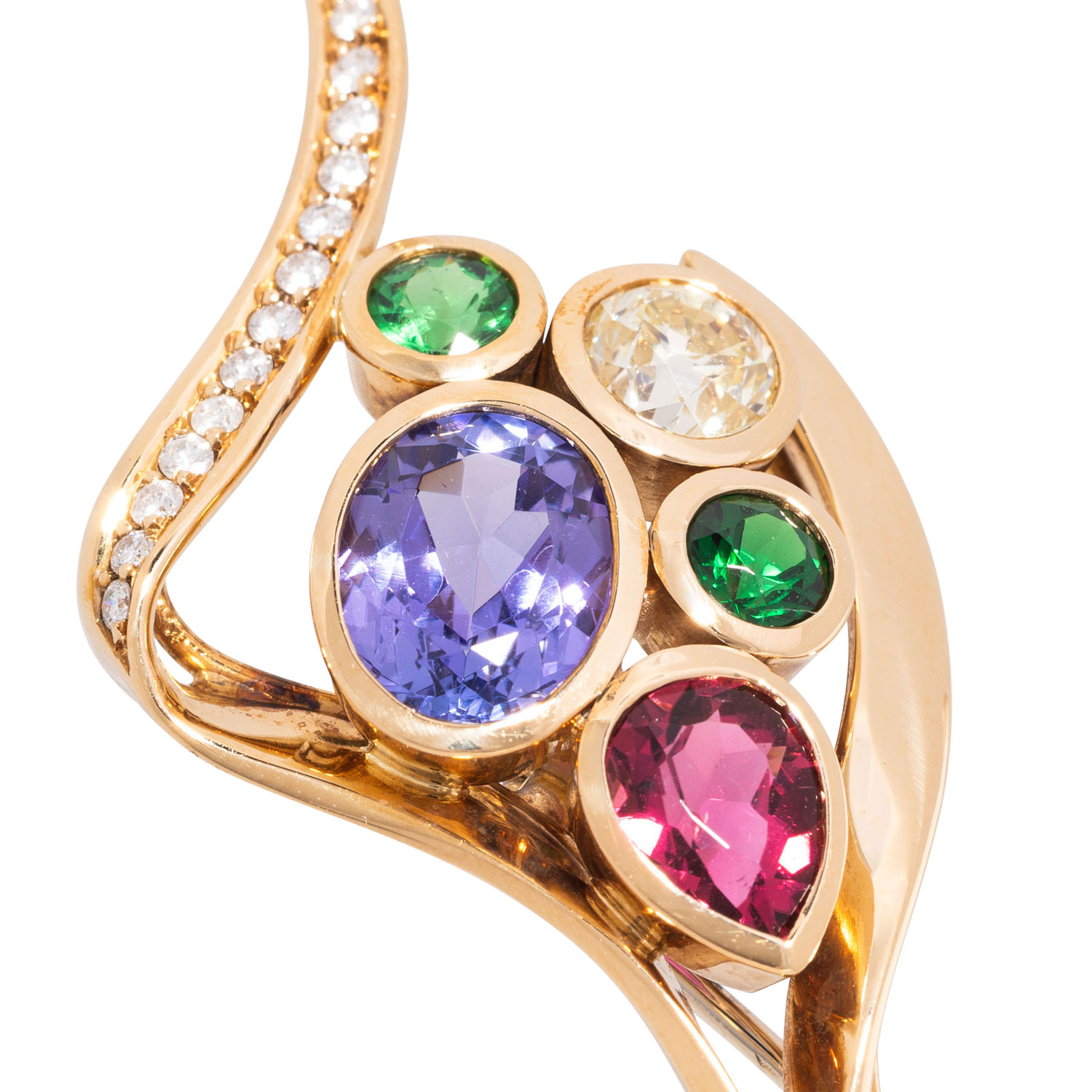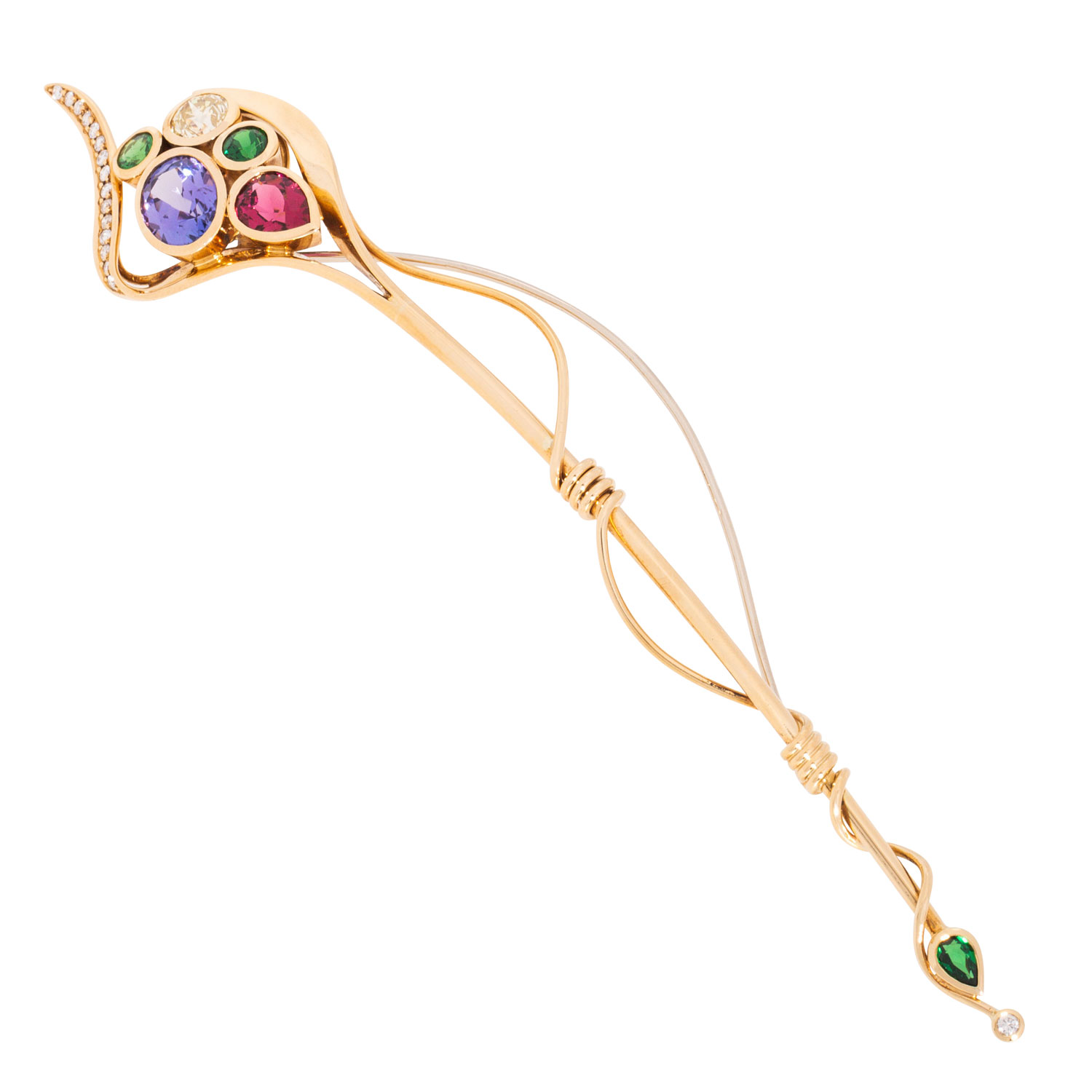 Extravagant handcrafted floral needle with beautiful gemstones, of which 1 oval faceted tanzanite ca. 1.8 ct, 1 pink pear-cut faceted tourmaline ca. 0.9 ct, 3 tsavorites round and pear-cut faceted totalling ca. 0.6 ct, 1 old-european-cut diamond ca. 0.62 ct, ca. TIN (P-O)/SI and small brilliant-cut diamonds totalling ca. 0.16 ct, low clarity and good colour, 18K yellow gold, 15.3 g, L: 12 cm, 20th/21st century, very good condition.