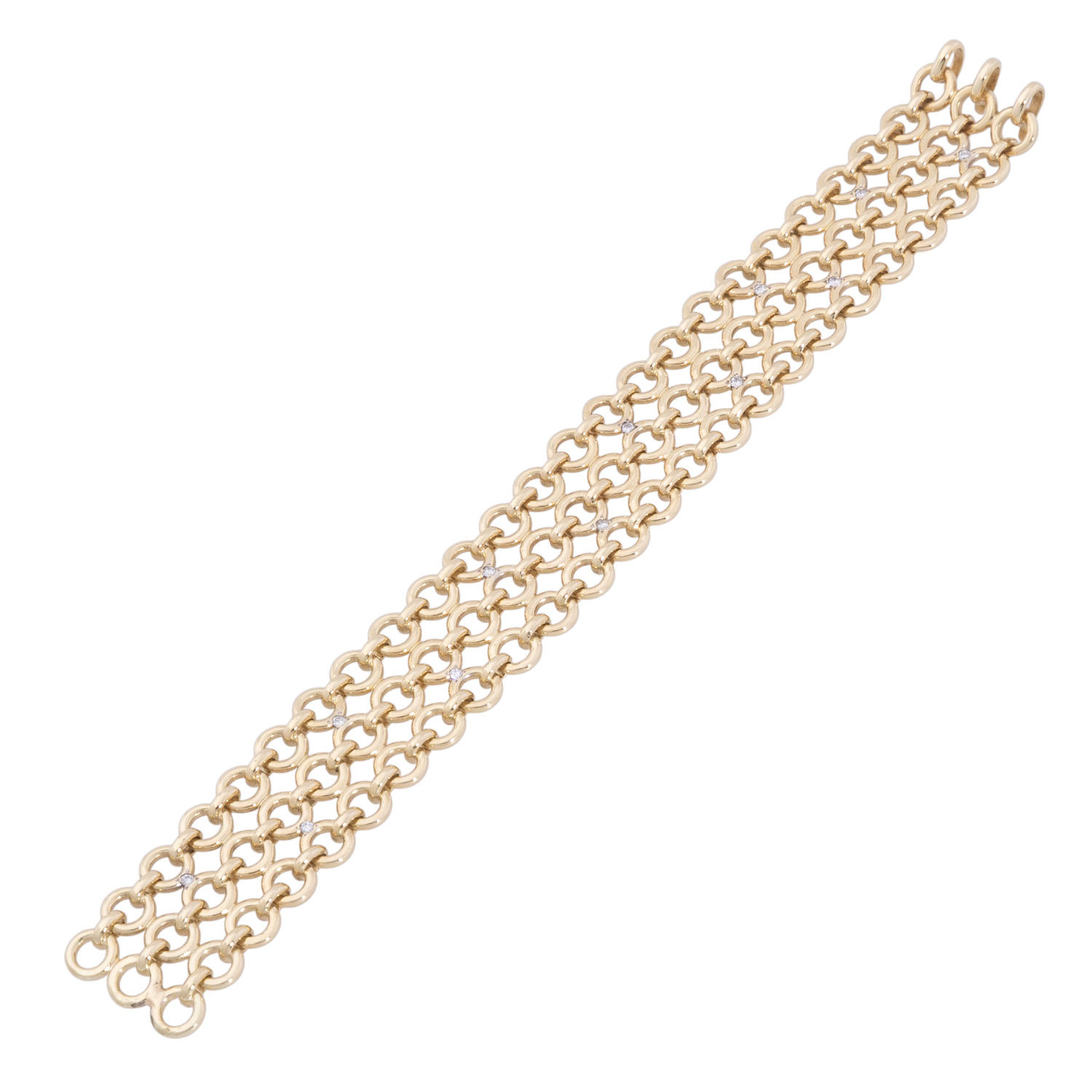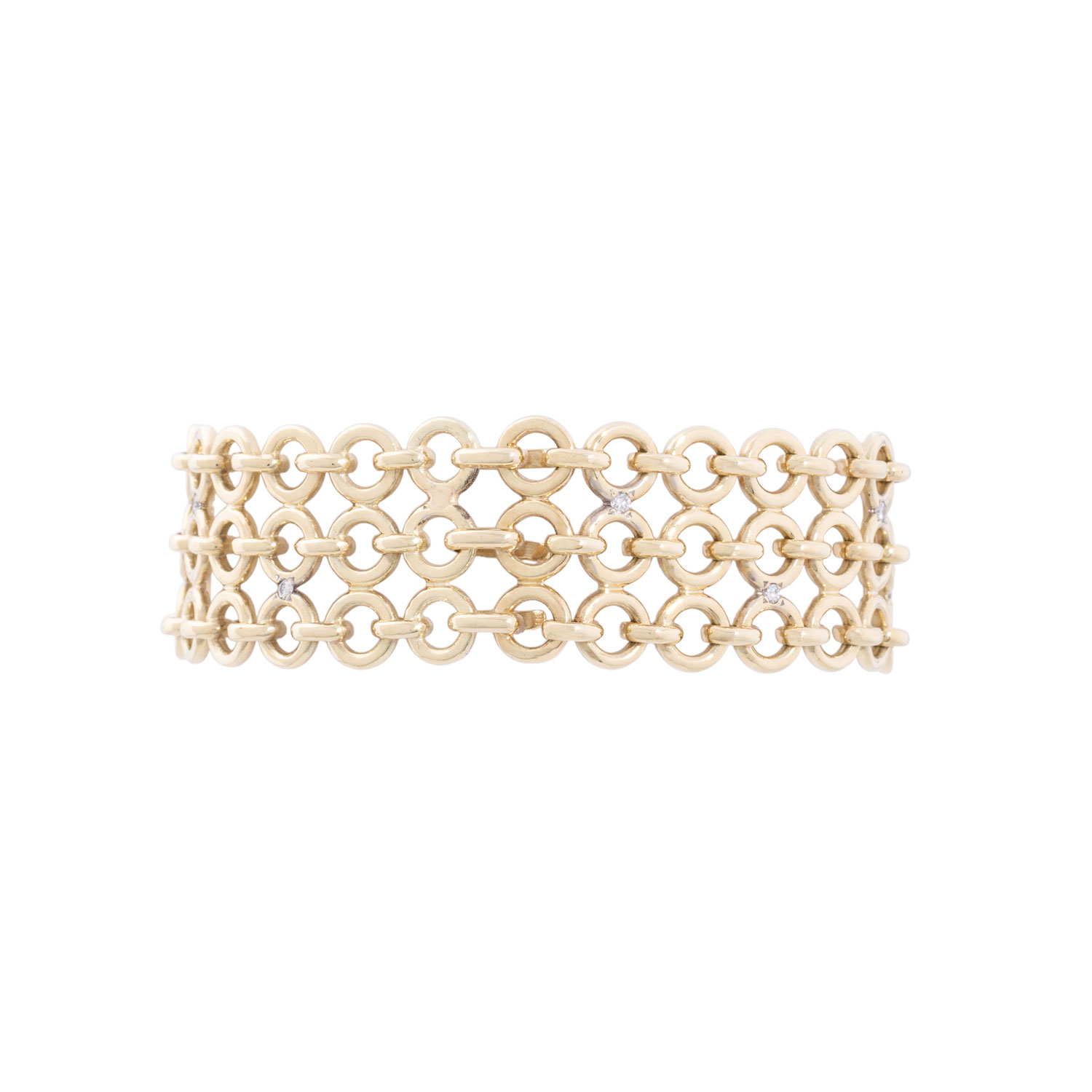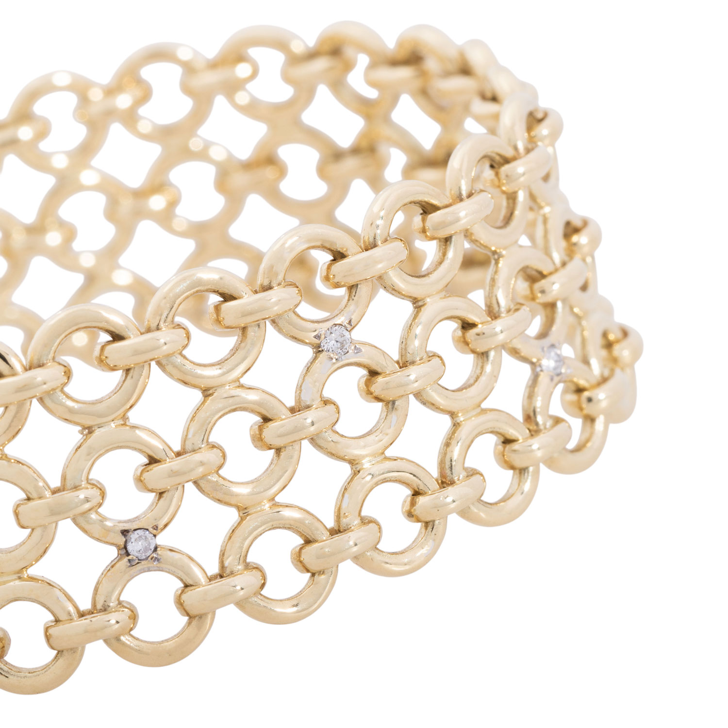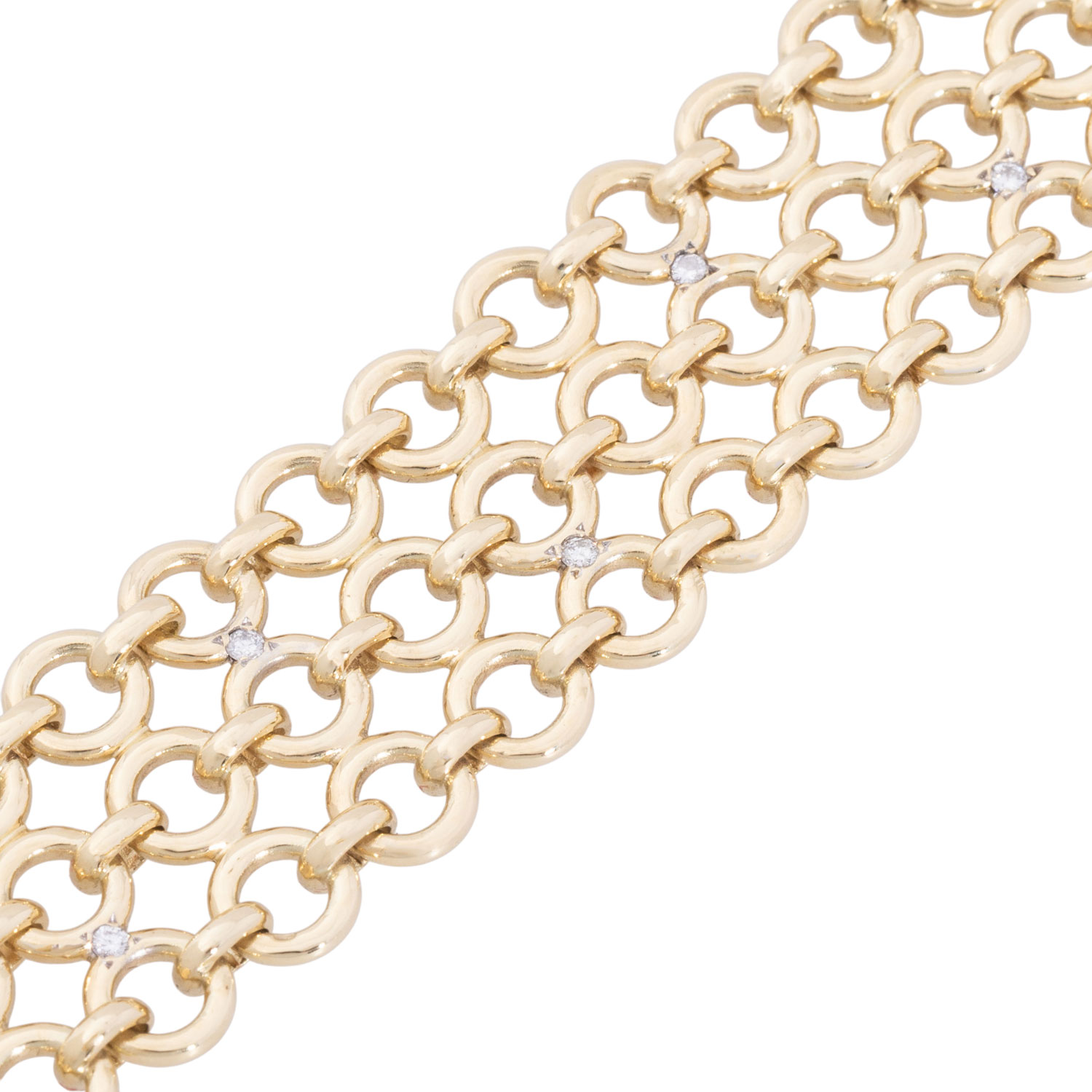 Link bracelet with 12 brilliant-cut diamonds totalling ca. 0,12 ct, good colour and clarity, 14K yellow gold, 37,5 g, L: 17 cm, W: 19 mm, hooks fastener, 1970th, minimal signs of wear, handcrafted work.