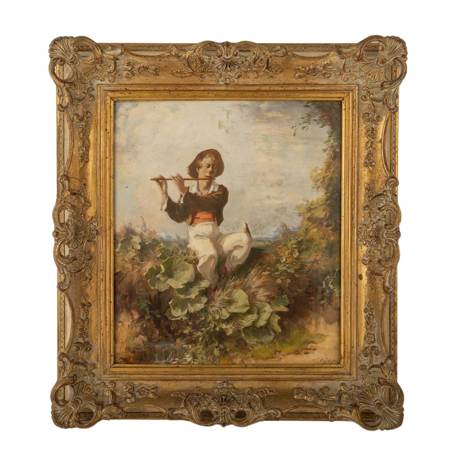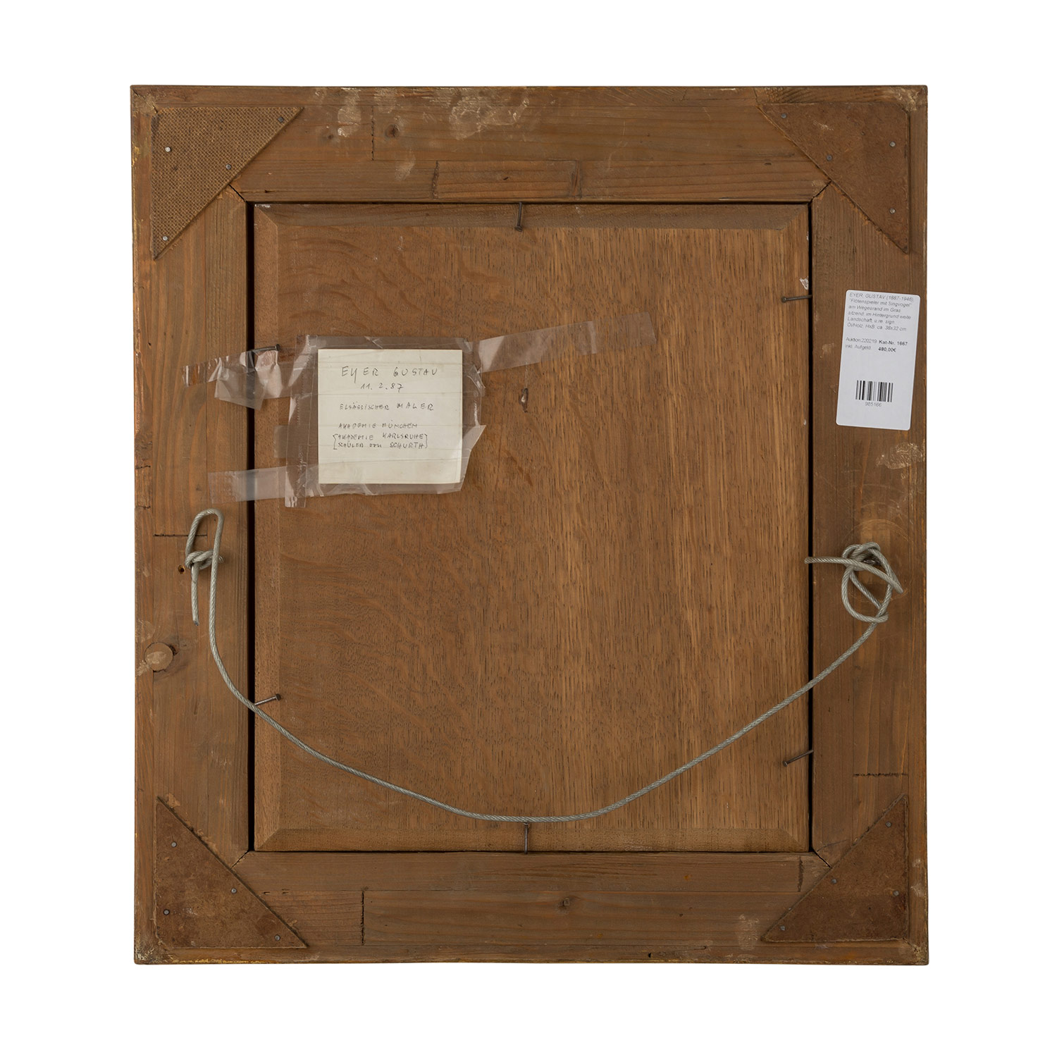 EYER, GUSTAV (1887-1946), "Flötenspieler mit Singvogel" (Flute player with singing bird), sitting in the grass at the wayside, in the background wide landscape, signed lower right, oil/wood, hxw: approx. 38x32 cm with frame). Part. min. stains a. retouches. With frame. Traces of age.