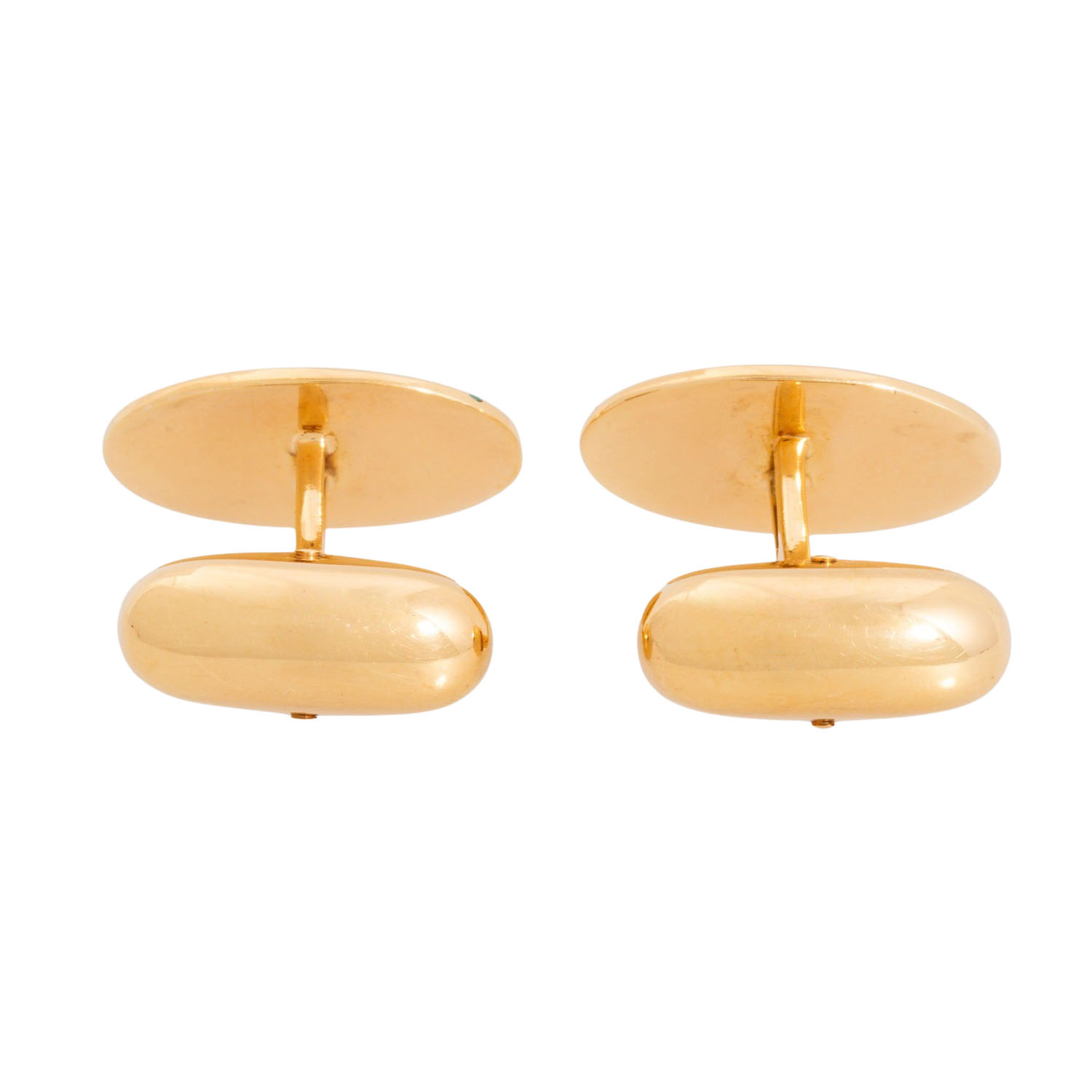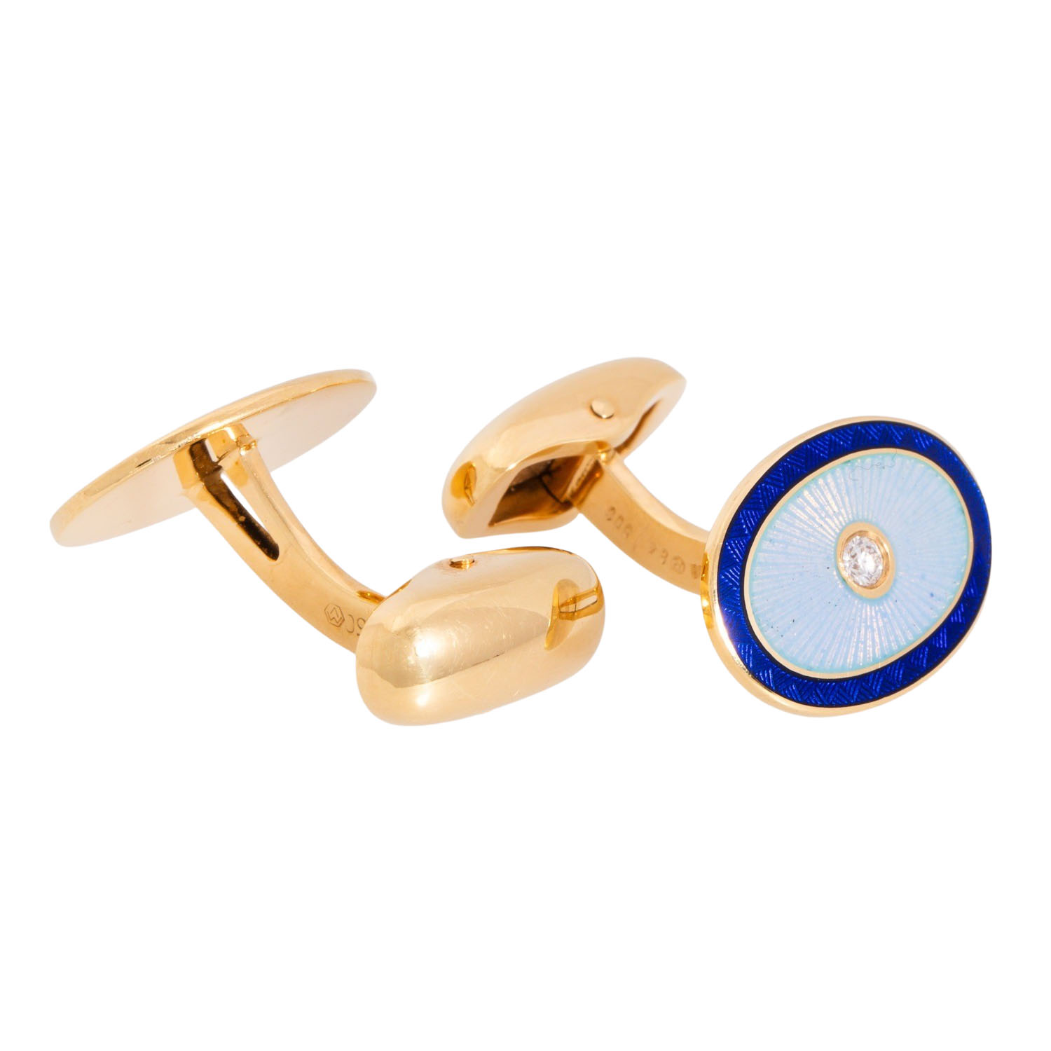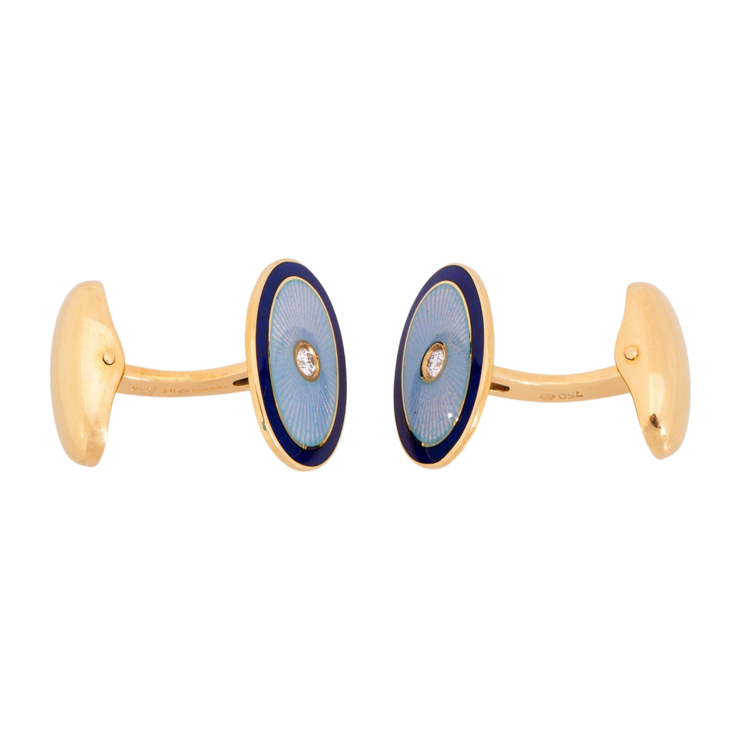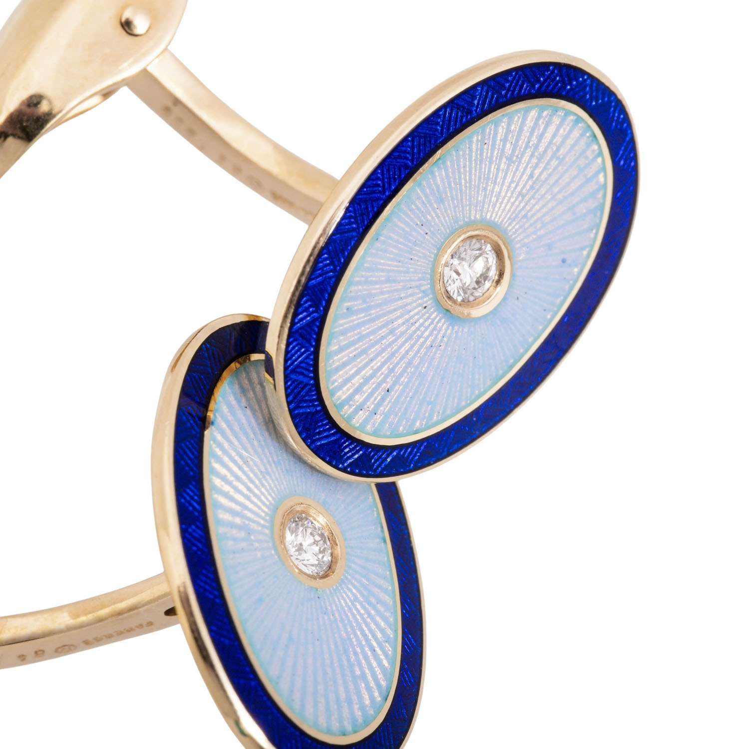 FABERGÉ by VICTOR MAYER cuff links with brilliant-cut diamonds totalling ca. 0.12 ct, good colour and clarity, and light- and cobalt-blue transparent enamel, 18K yellow gold, 15.6 g, oval 18x13 mm, 20th/21st century, MINT CONDITION, with maker's mark and marked number lim. edition 84/500, with certificate, case and box.