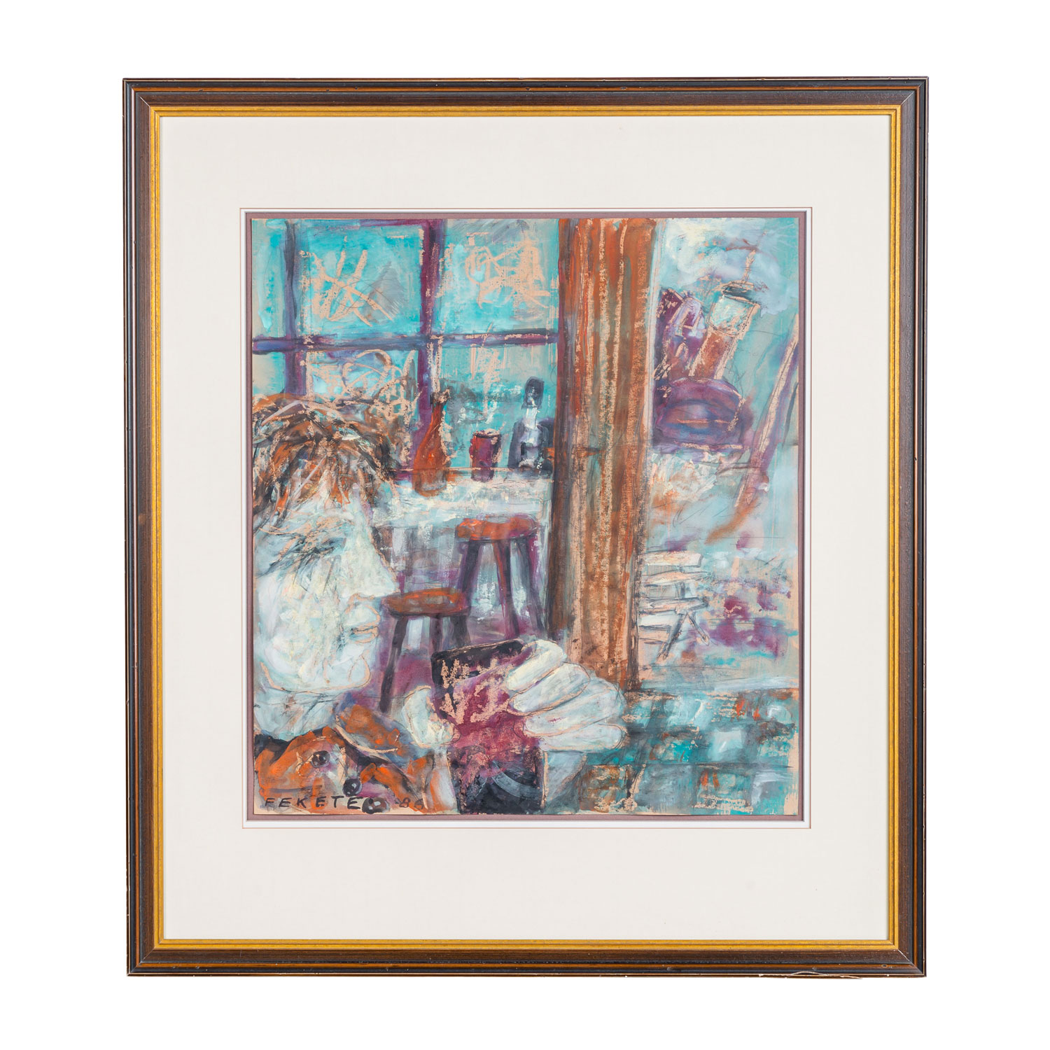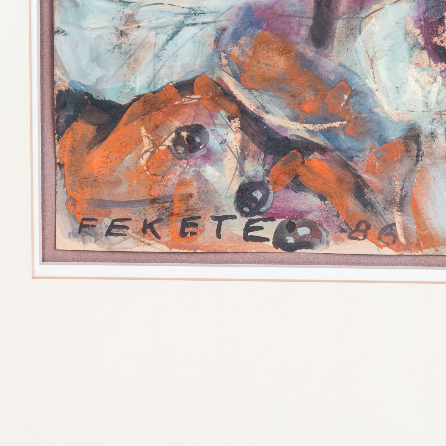FEKETE, ESTEBAN (1924-2009), "In der Hafenkneipe", below left signed and dated 'FEKETE 86', mixed media / chamois-colored paper, HxW: approx. 50x46 cm (75x67 cm with frame). Minim. curled and tanned. Framed behind glass with a passepartout (edge slightly damaged). VERSO LABEL of the gallery in Untere Tor Bietigheim with description and price DM 2,500.